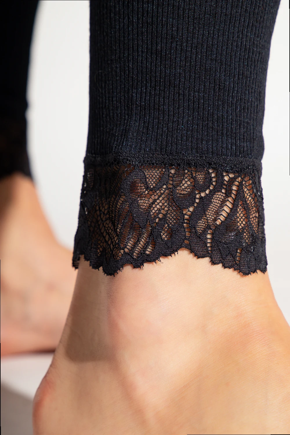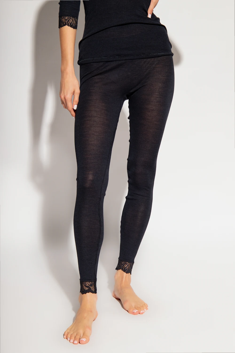 Black ribbed leggings from Hanro. Crafted from a merino wool and silk blend, this pair features an elastic waistband and lace trims.