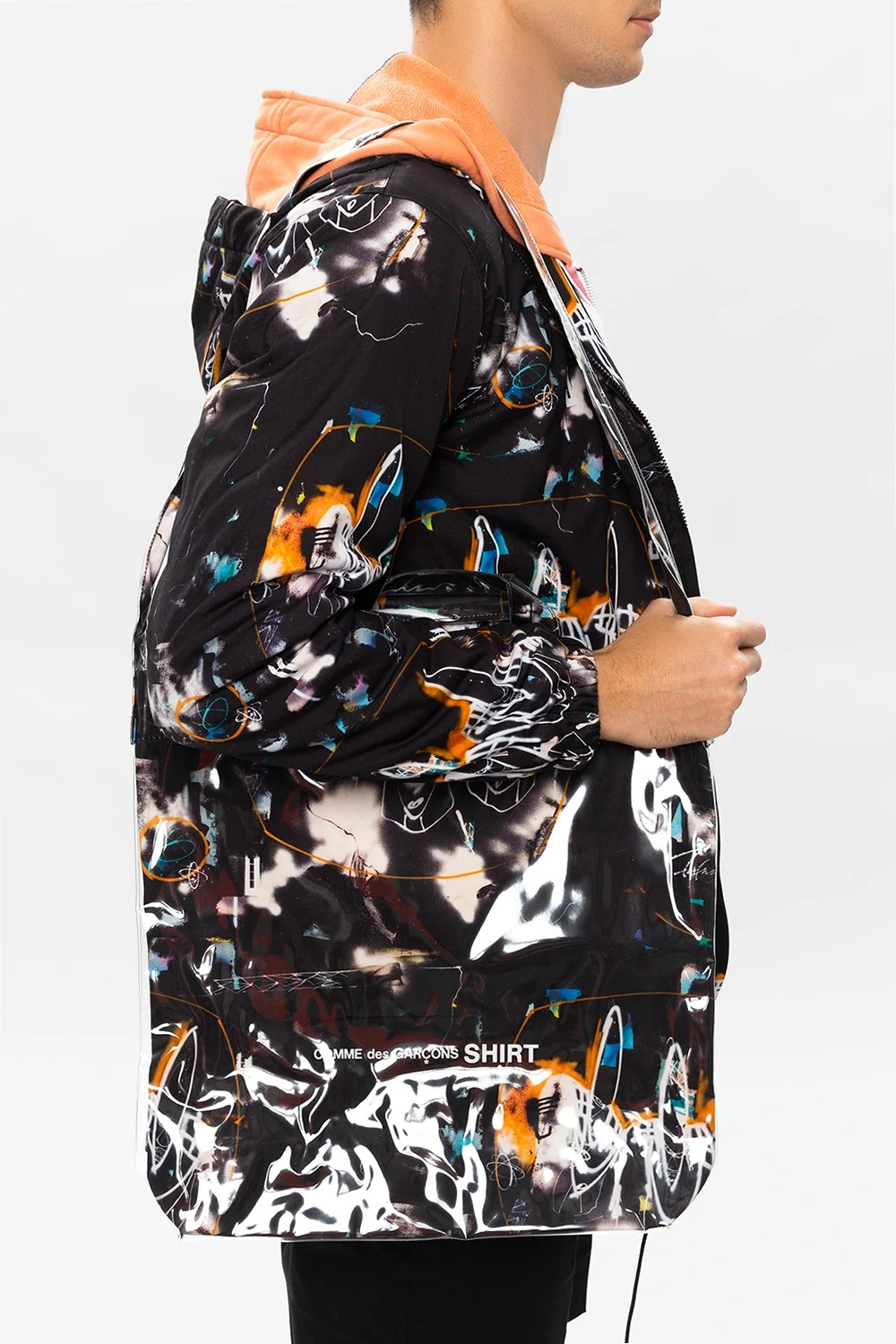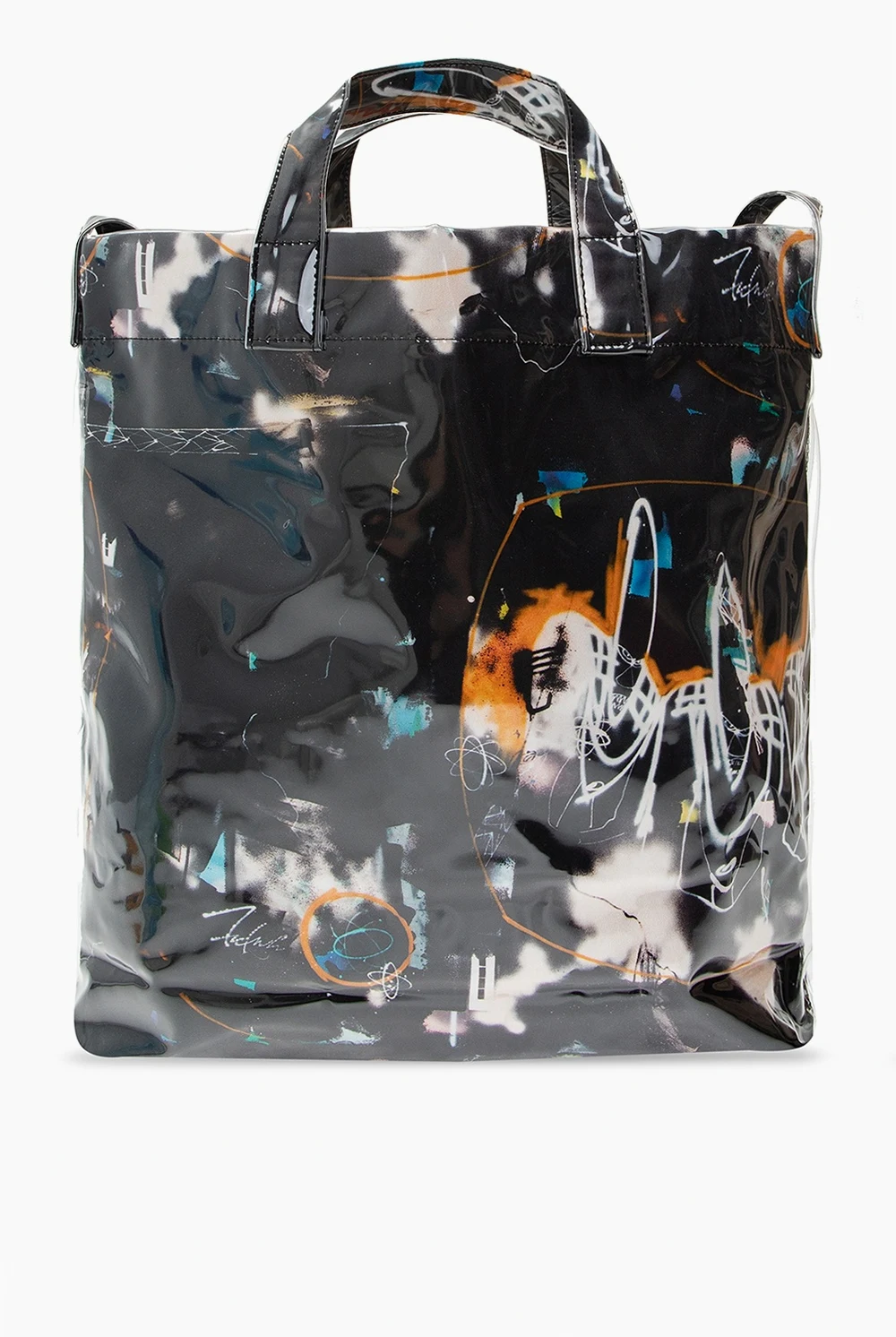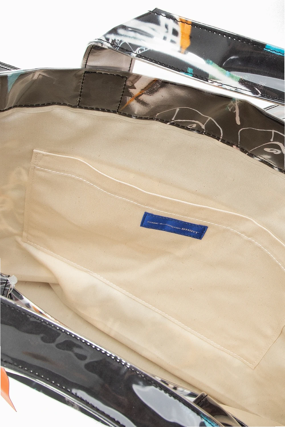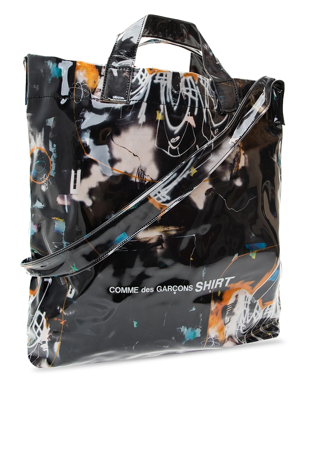 Black tote bag from Comme des Garçons Shirt. Illustrated with colourful pattern prints, including white logo, this design features two half-round handles, a shoulder strap and a cream clad interior with one compartment and one slip pocket.