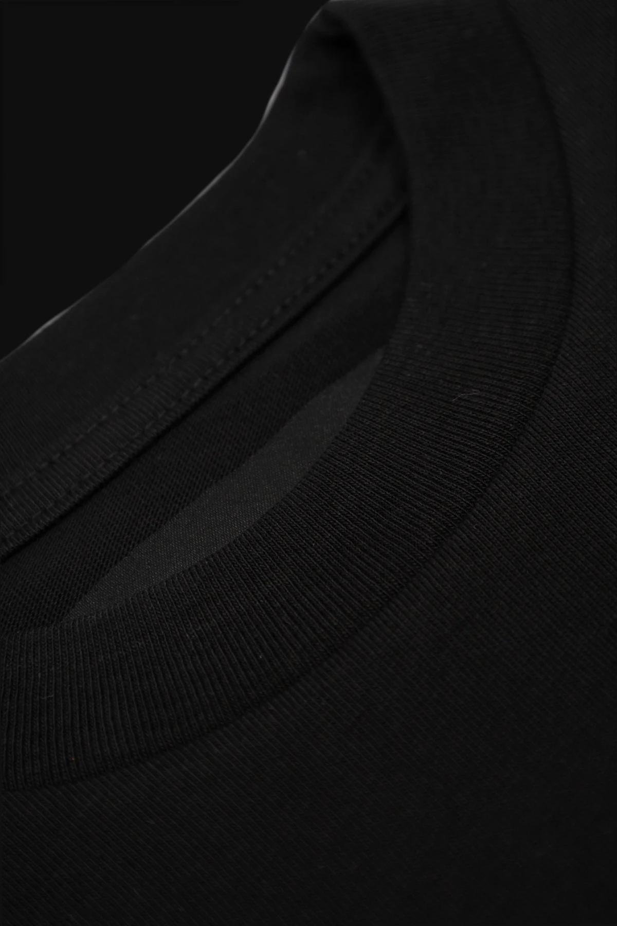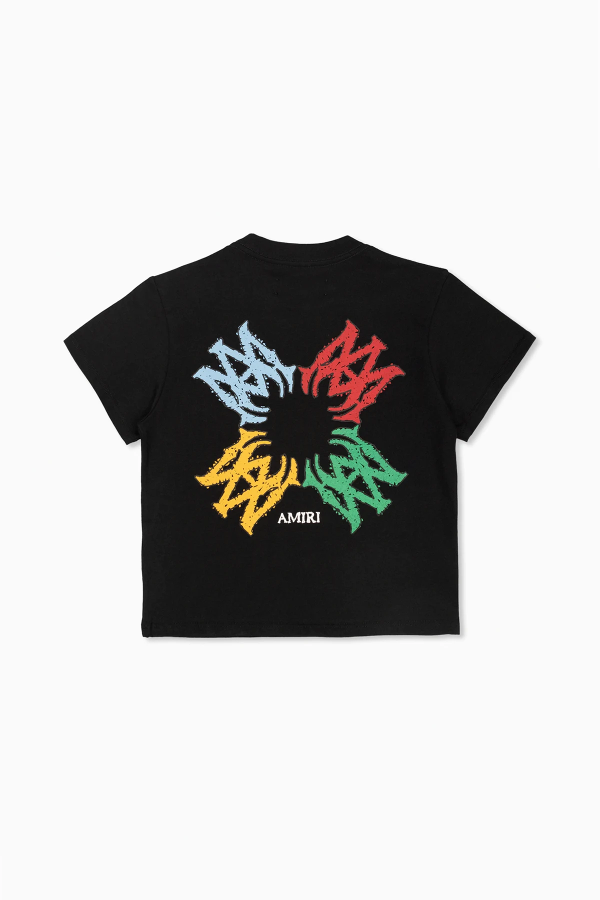 Die dominierende Farbe Schwarz verleiht ihm zeitlose Eleganz, während das bunte Muster , bestehend aus Buchstaben, das an eine abstrakte Grafik in Sternform erinnert, die Vorder- und Rückseite des T-Shirts ziert und in größerem Format die Aufmerksamkeit auf sich zieht. Unter diesem Muster ist der Schriftzug "AMIRI" zu sehen, der auf seine prestigeträchtige Herkunft hinweist.