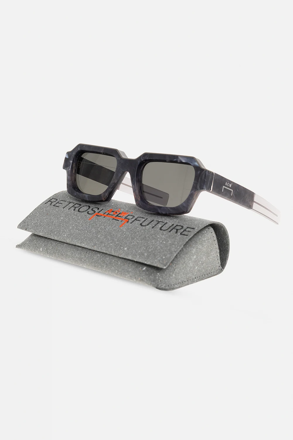 Dark grey ‘Caro’ sunglasses from A-COLD-WALL* x Retrosuperfuture. Partially crafted from Italian acetate, this pair has rectangular frames, decorative marble pattern, embossed logo pattern, laser etched ACW* coding system and grey lenses with 100% UV protection. Comes with a case.
