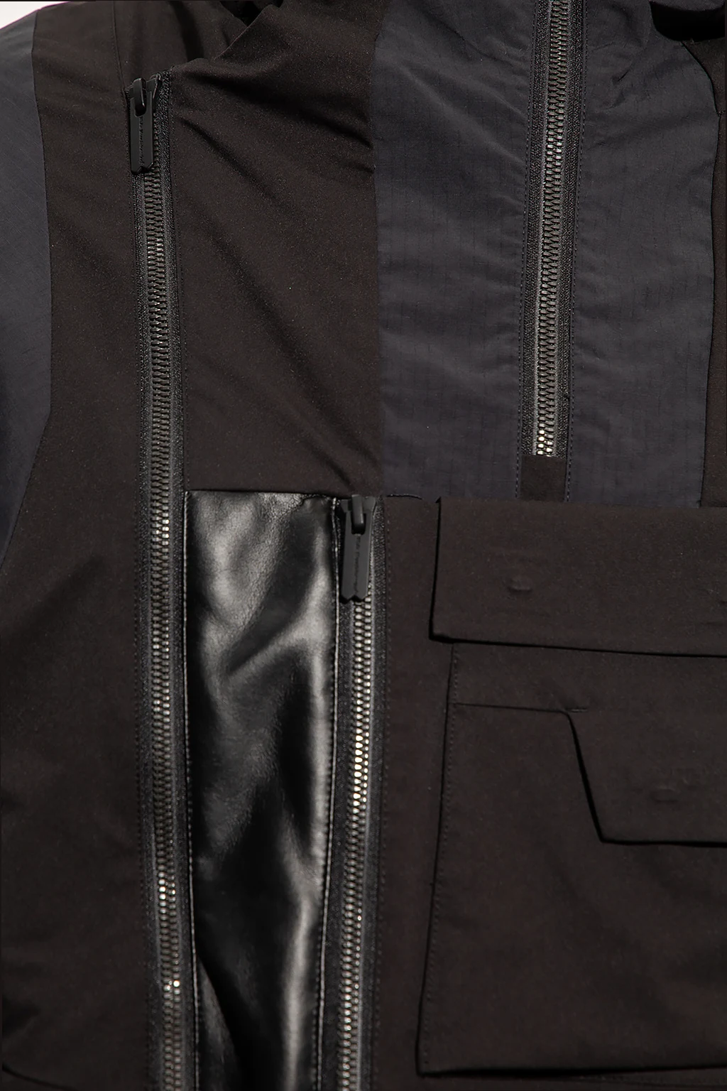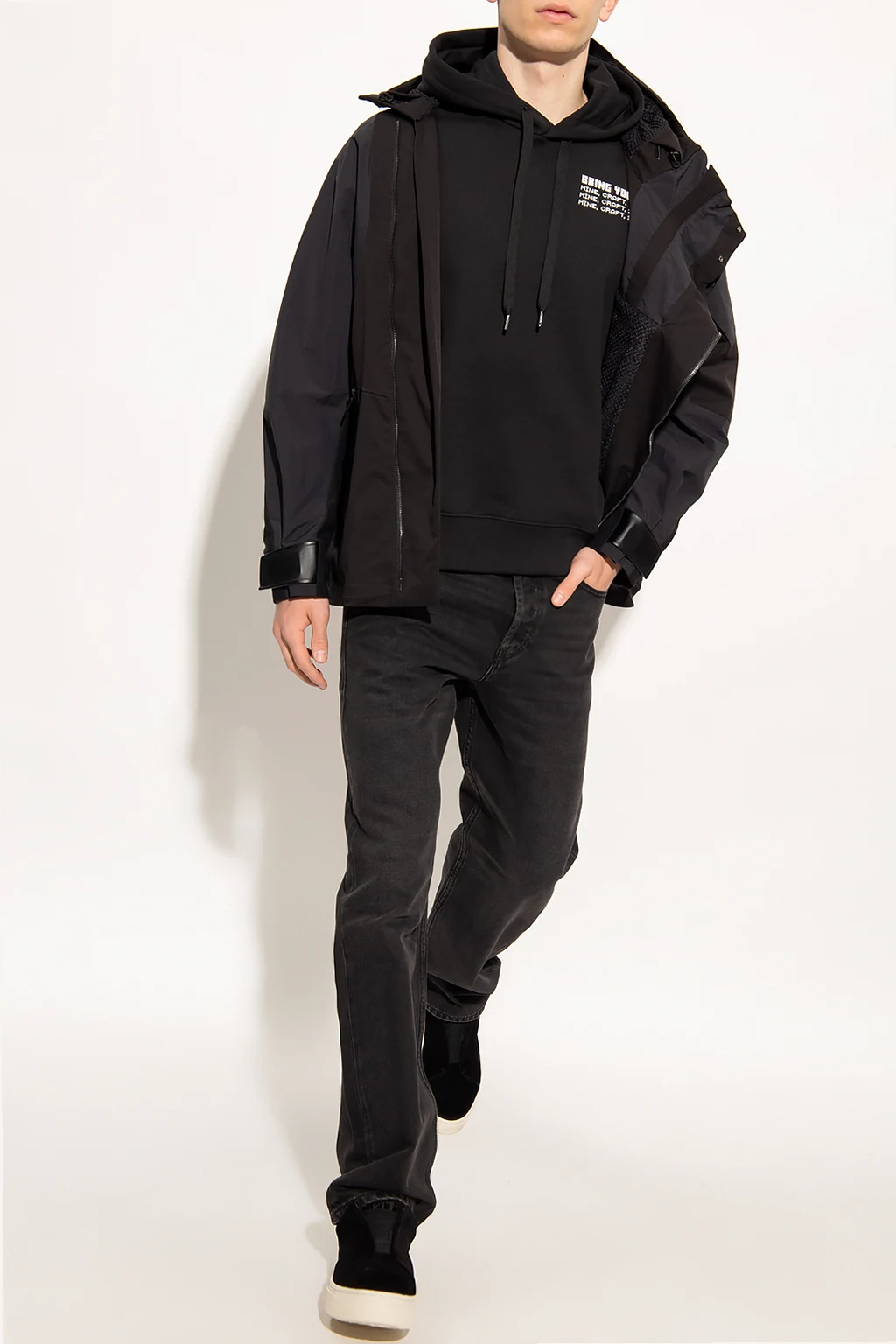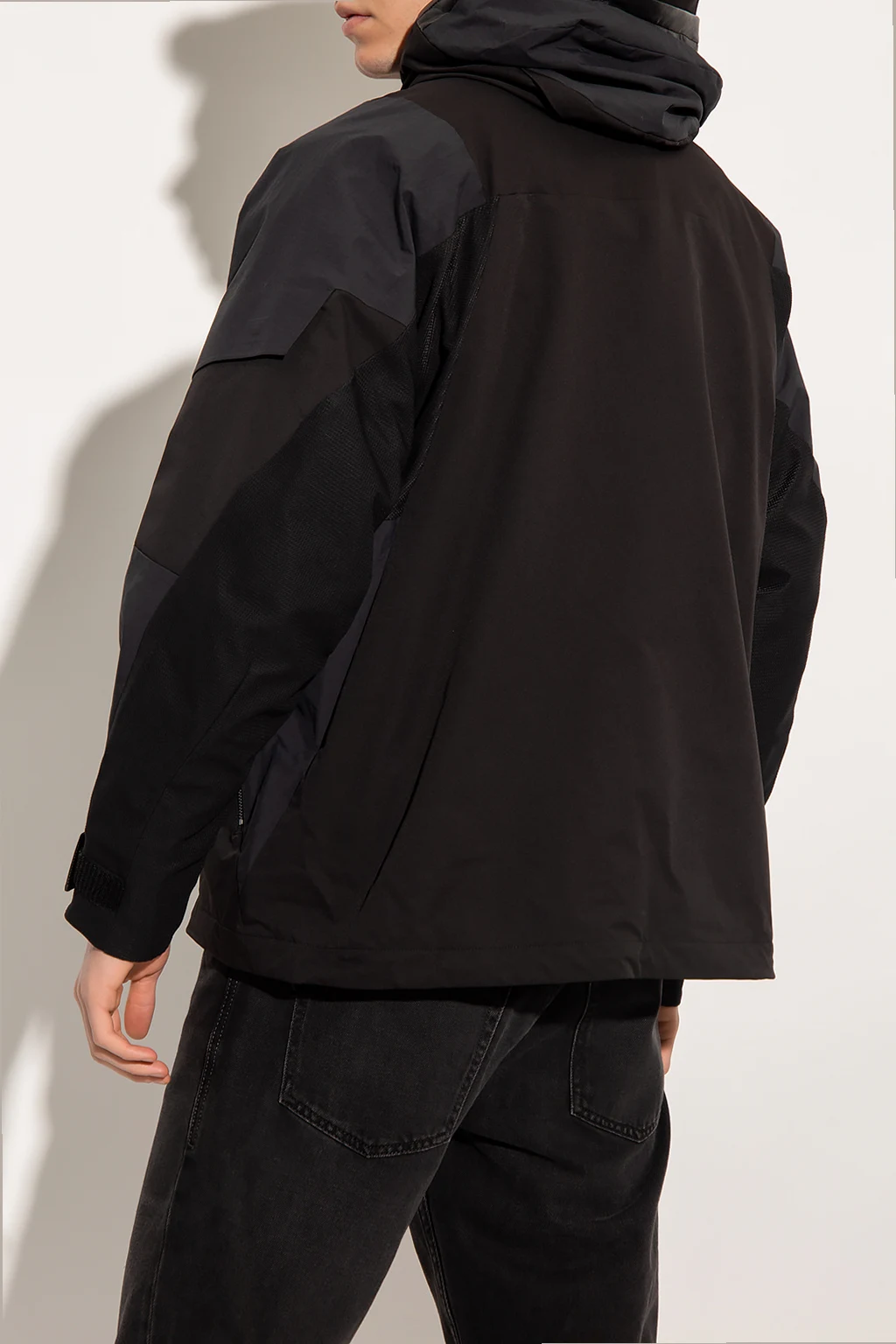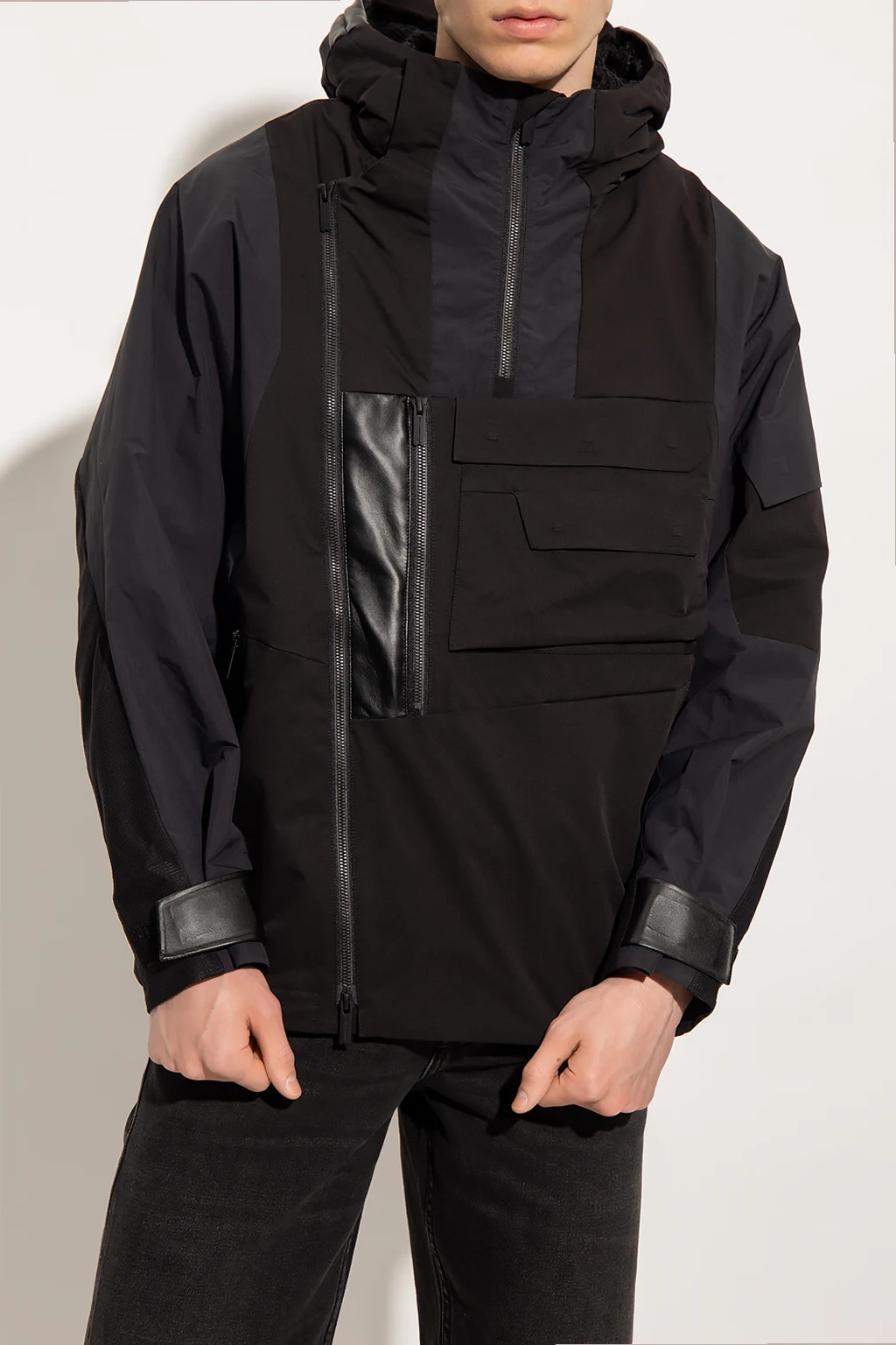 Black jacket from White Mountaineering. Designed with a panelled construction offering windproof properties, this style features a two-way zip fastening, a drawcord-adjustable hood with a rigid peak and leather piping, a high-neck collar with a quarter zip closure and side press-studs, multiple pockets fastened with magnetic snap-buttons, vertical zip vents, a drawcord-adjustable hem and long sleeves with mesh trims and adjustable tabs.