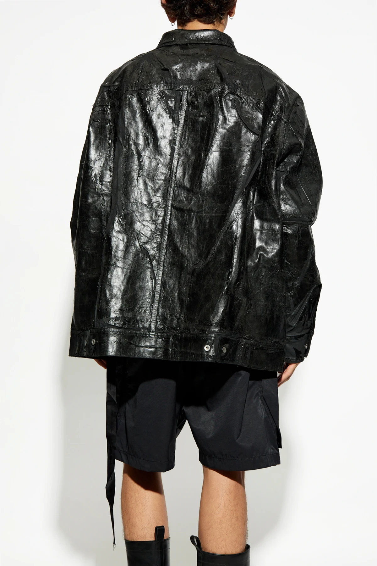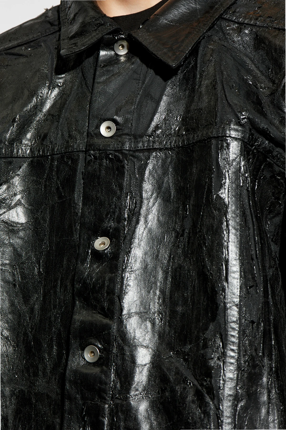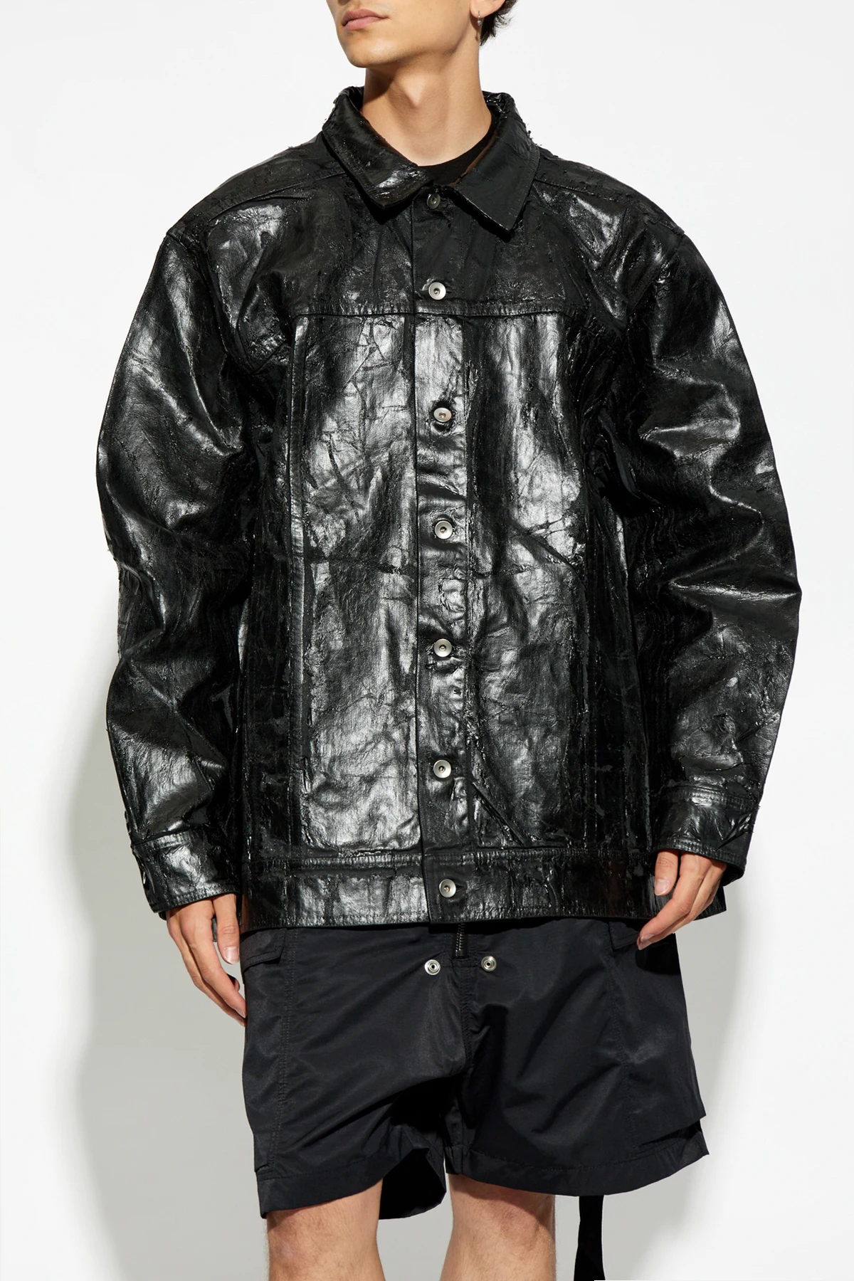 Die Jacke, gefertigt aus hochwertigem, glänzendem lederähnlichem Material, beeindruckt durch ihre tiefschwarze Farbe und die unregelmäßige Textur, die ihr Ausdruckskraft und Charakter verleiht. Ihr oversize Schnitt sorgt für Bewegungsfreiheit sowie einen modernen, urbanen Look.