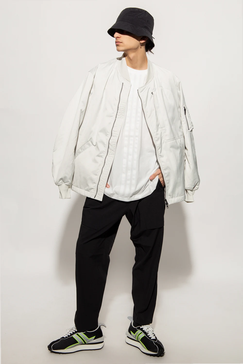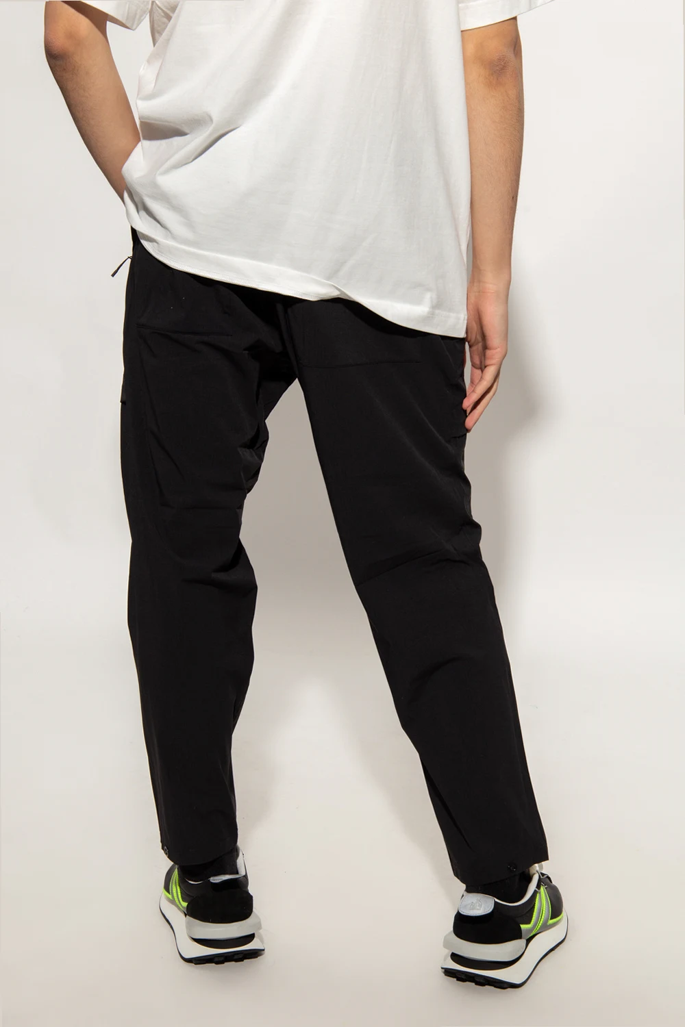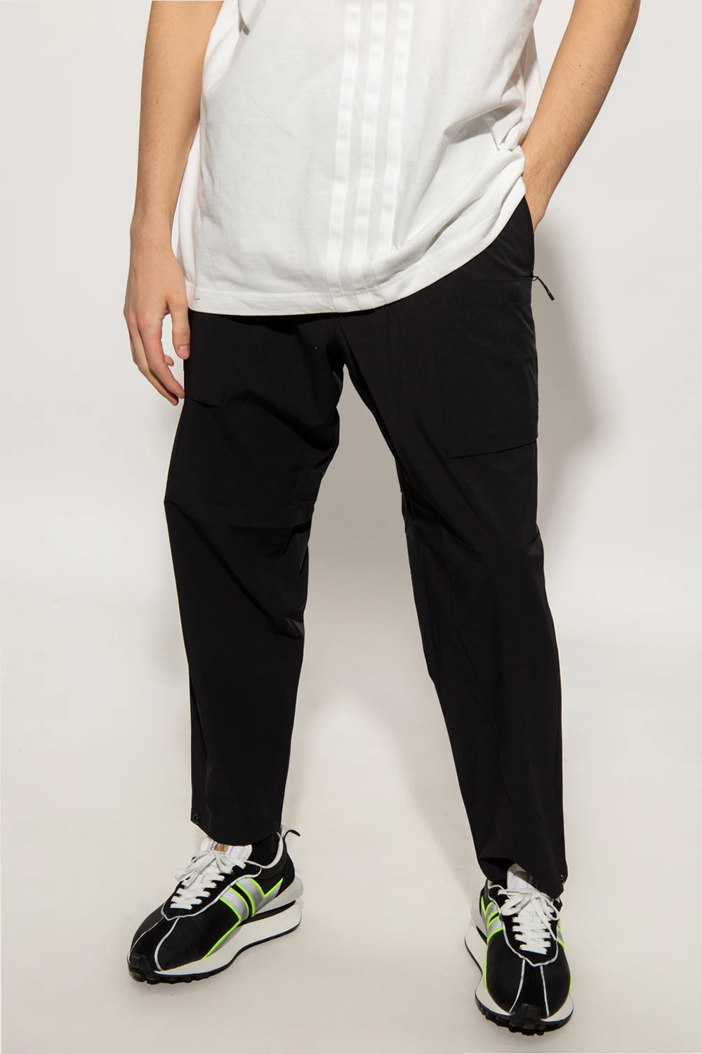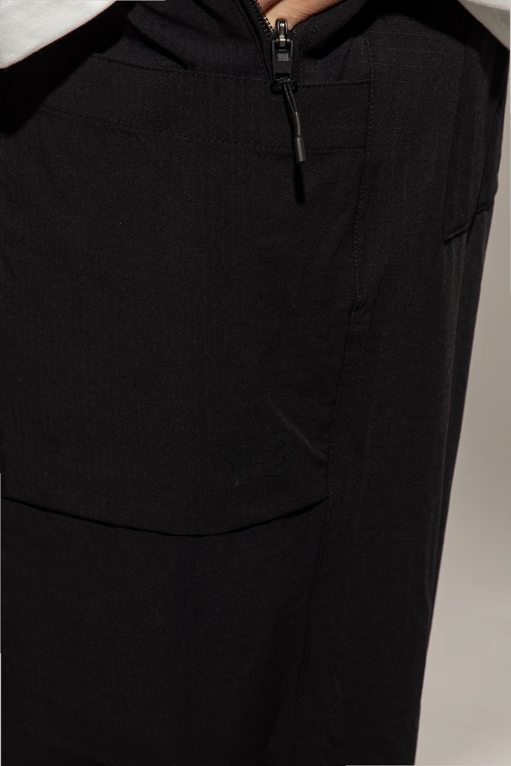 Black trousers from Y-3 Yohji Yamamoto. Embellished with a black graphic print with the brand's logo, this pair features a drawstring waistband, a zip fly with a button as well as three zip pockets and three snap-fastened pockets.