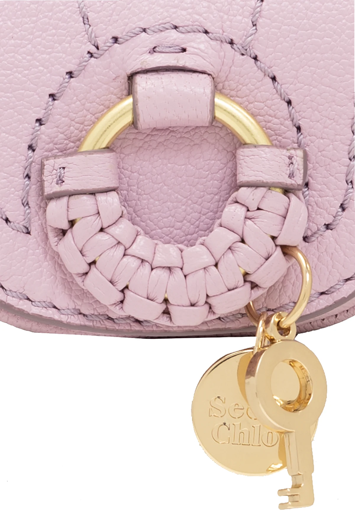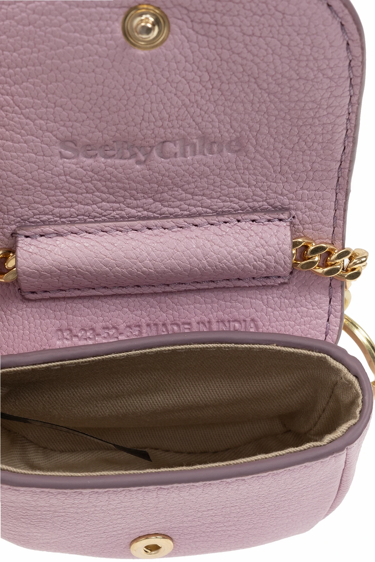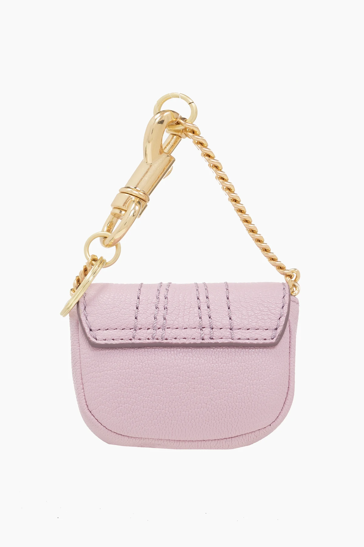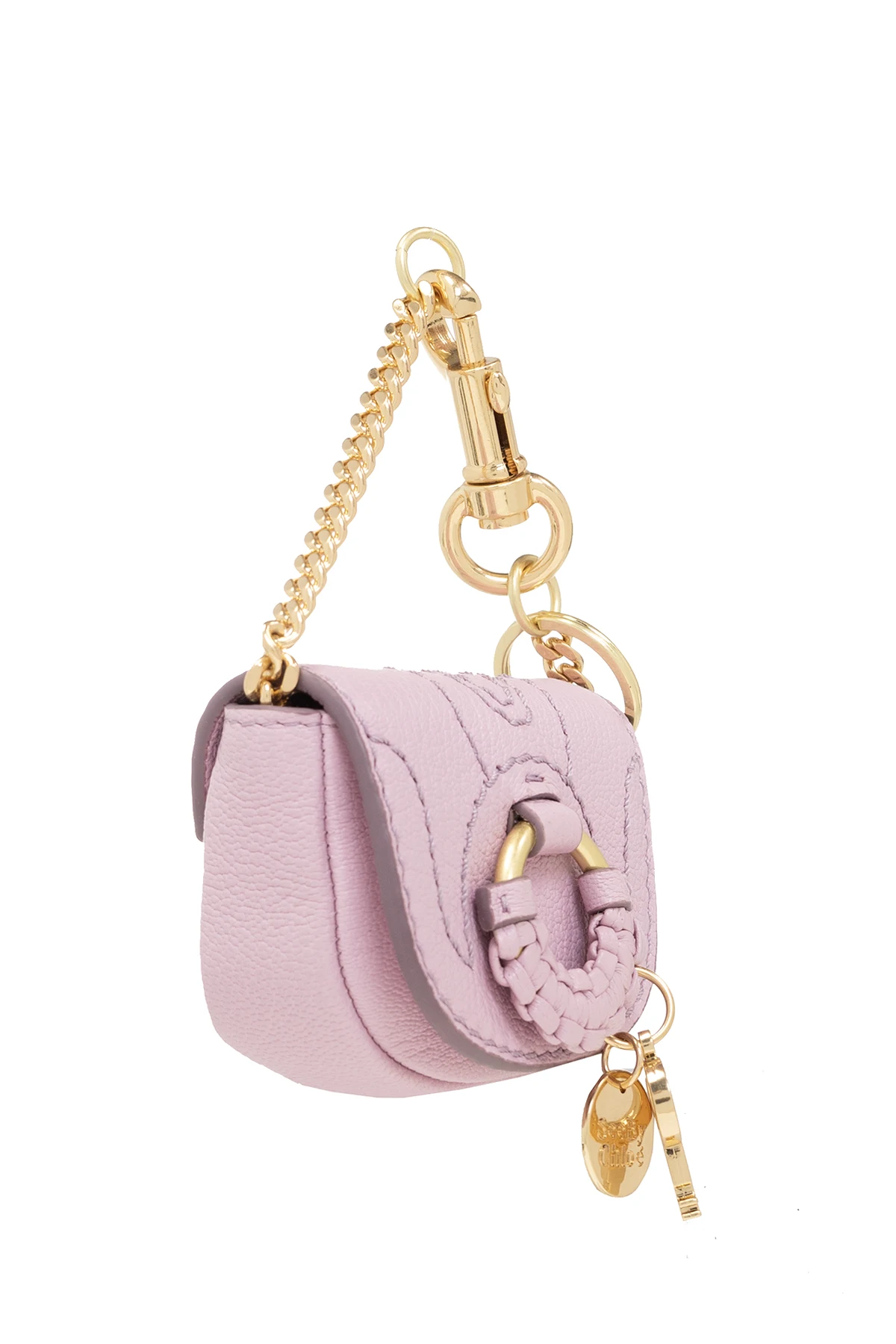 Pinkish purple key holder from See By Chloe. Made of goat leather, this item fastens with a snap and showcases a braided ring with charms and embossed logo on the front. It is complete with one internal compartment and antiqued gold-tone metal hardware, including a chain and lobster clasp.