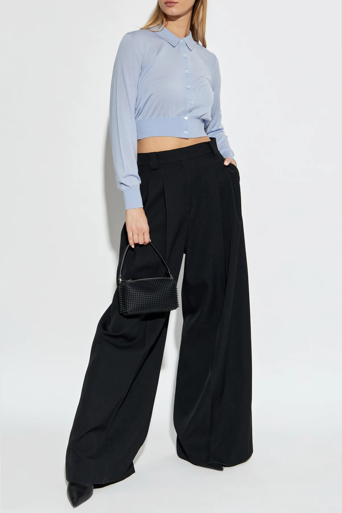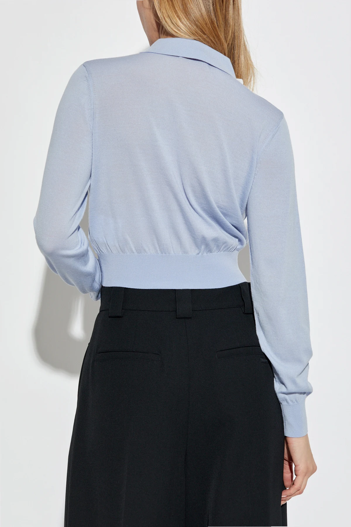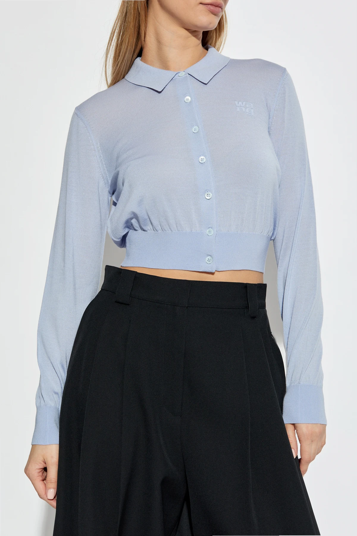 Der Cardigan zeichnet sich durch seinen kurzen, figurbetonten Schnitt mit langen Ärmeln und einem klassischen Kragen aus, der ihm einen unverwechselbaren Chic verleiht. Der Knopfverschluss, perfekt abgestimmt auf den hellblauen Ton, unterstreicht sein harmonisches Design. Das dezente Logo auf der linken Brustseite fügt eine Note von Exklusivität hinzu, und der elastische Rippstrick am unteren Saum sorgt für eine perfekte Passform.