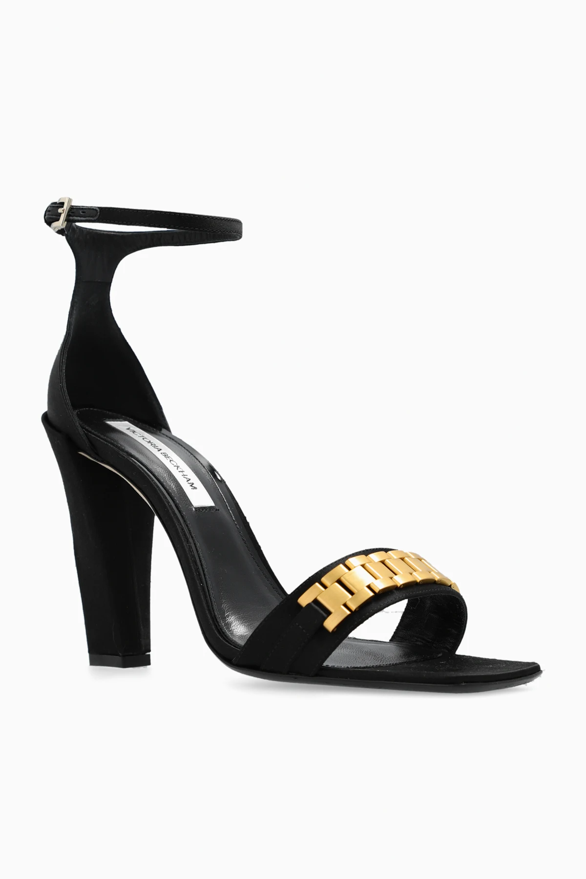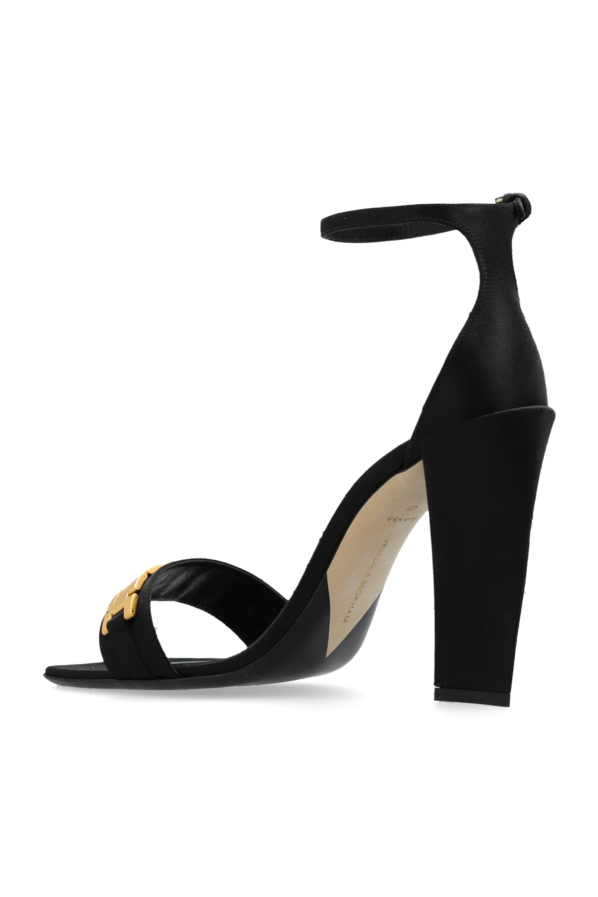 Black heeled sandals with a satin finish from Victoria Beckham. Fastened an adjustable ankle strap with a buckle, this pair features a gold-tone metal appliqué on the front, square toe and leather sole in black and cream.