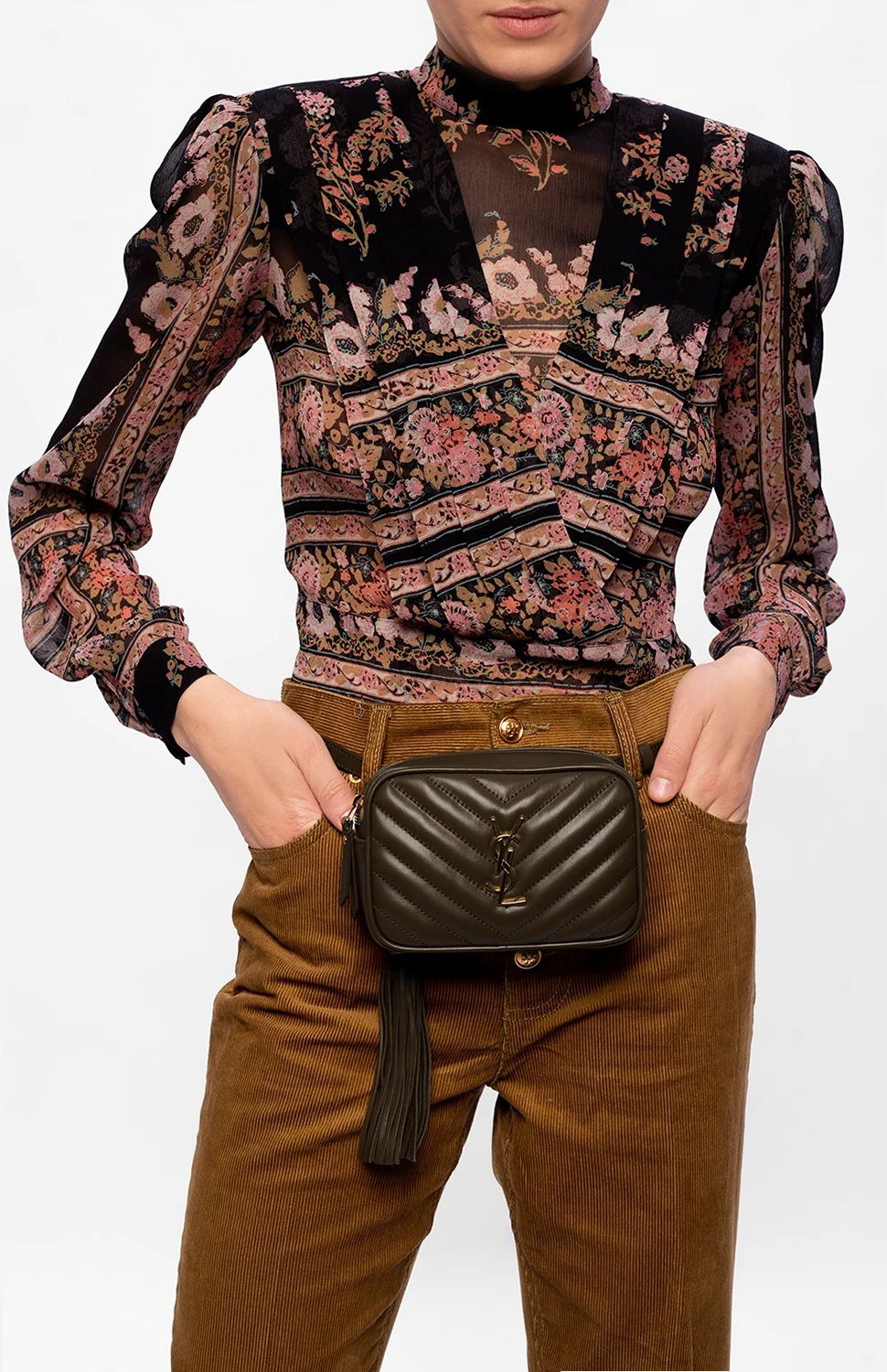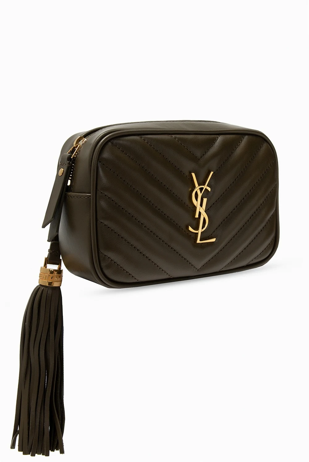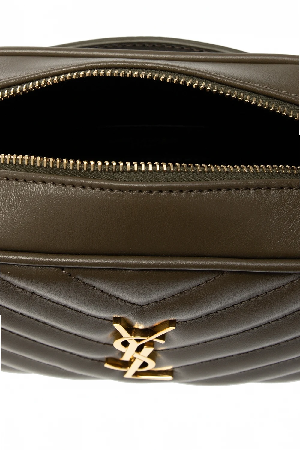 Green and brown ‘Lou’ quilted belt bag from Saint Laurent. Crafted from calf leather, this design fastens via zip closure and showcases gold-tone metal hardware, including YSL initials, an external zipped pocket on the back, a detachable and adjustable strap and interior with one compartment, one slip pocket and three card slots.