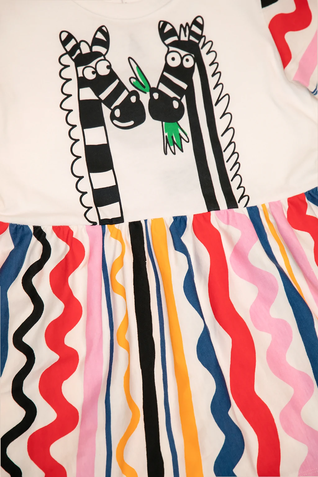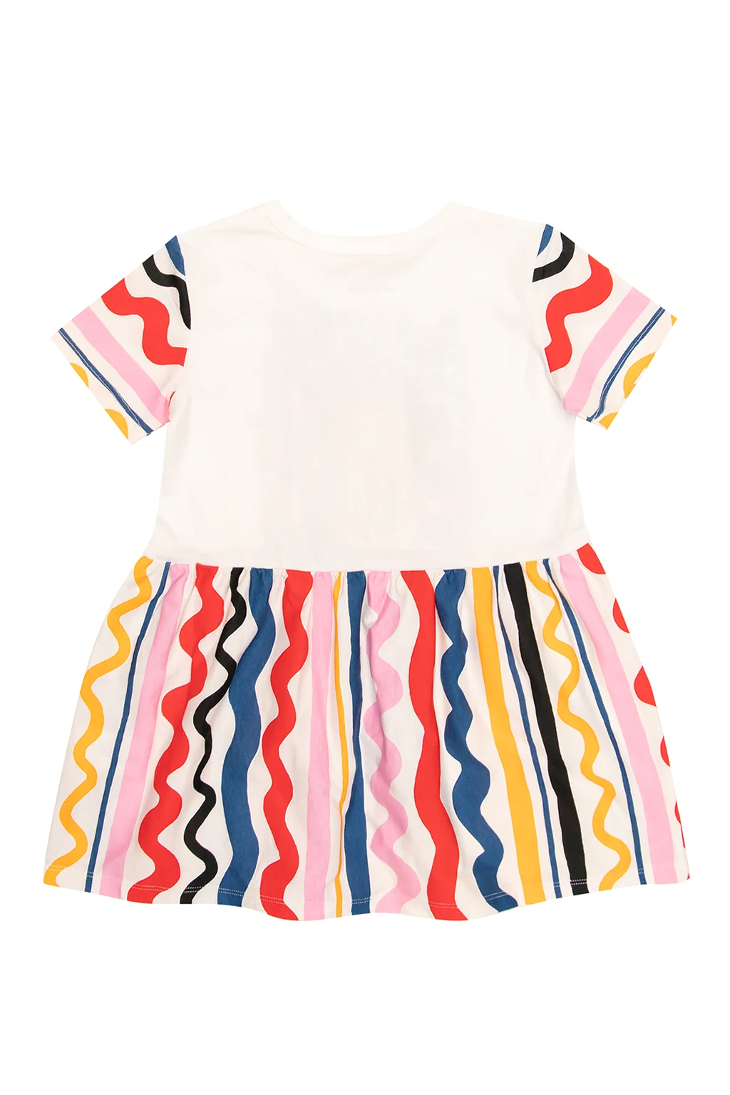 White dress from Stella McCartney Kids. Made of organic cotton from sustainable farms, this style showcases a colourful graphic pattern, an animal print, a round neck and short sleeves.