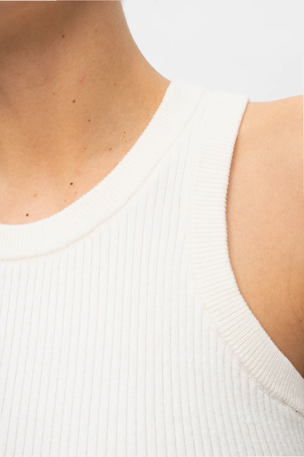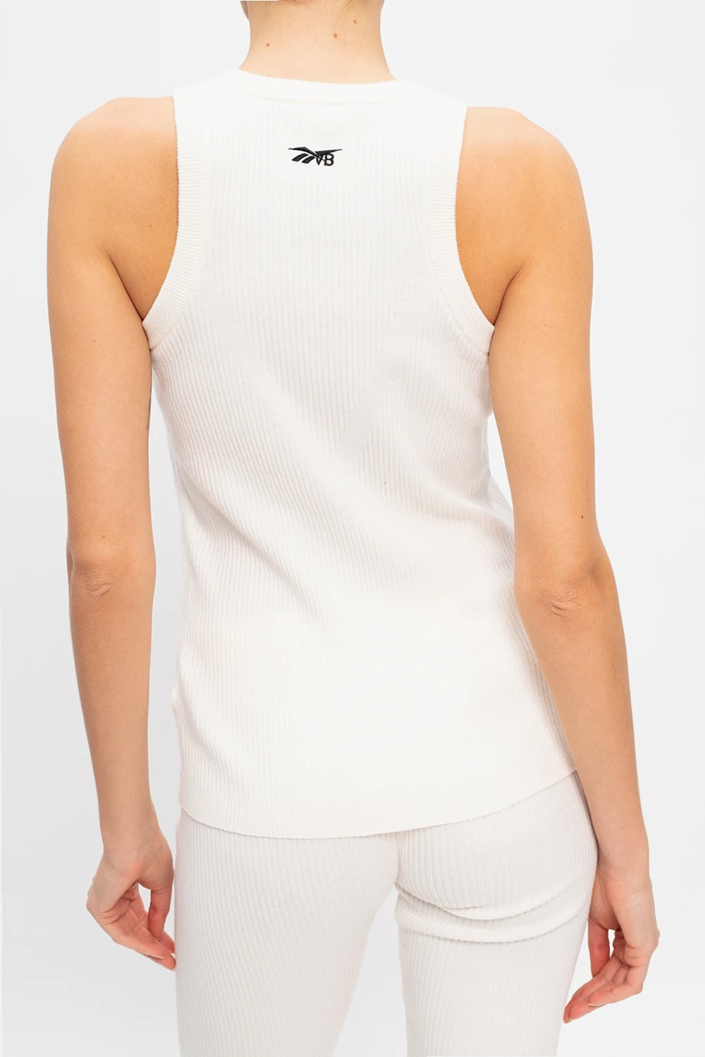 White ribbed top from Reebok x Victoria Beckham. This round neck design features a black logo embroidery.