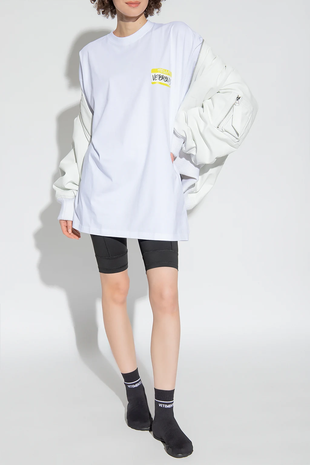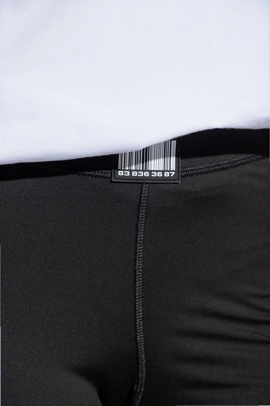 Short, black training leggings from VTMNTS. This pair features an elastic waistband and a rubber patch with the brand’s signature barcode motif.