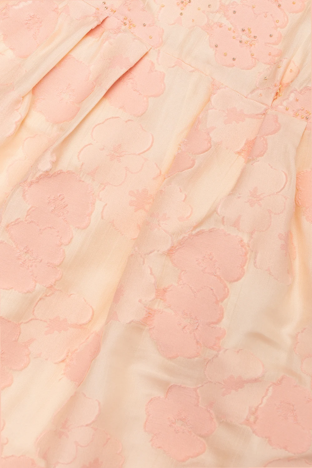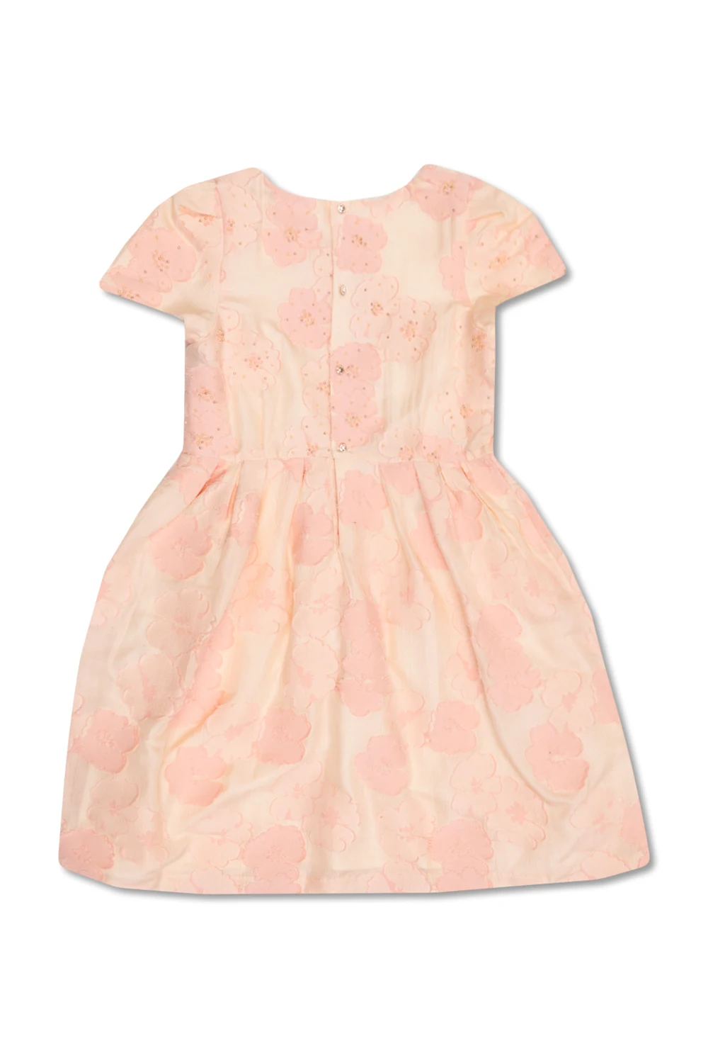 Cream and blush pink flared dress from Bonpoint. Crafted from a cotton and silk blend, this short sleeve design features buttons at the back, floral motif, beads and a round neck.