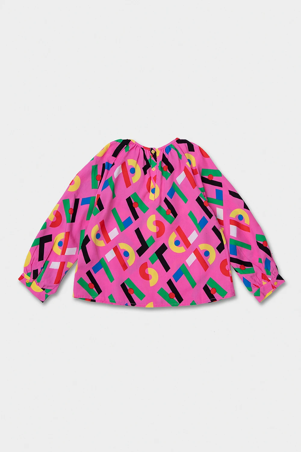 Pink top from Stella McCartney Kids. Crafted from sustainable material, this style features a colourful geometrical pattern showcasing a logo, a trimmed round neck, back button closures and puff long sleeves with button cuffs.