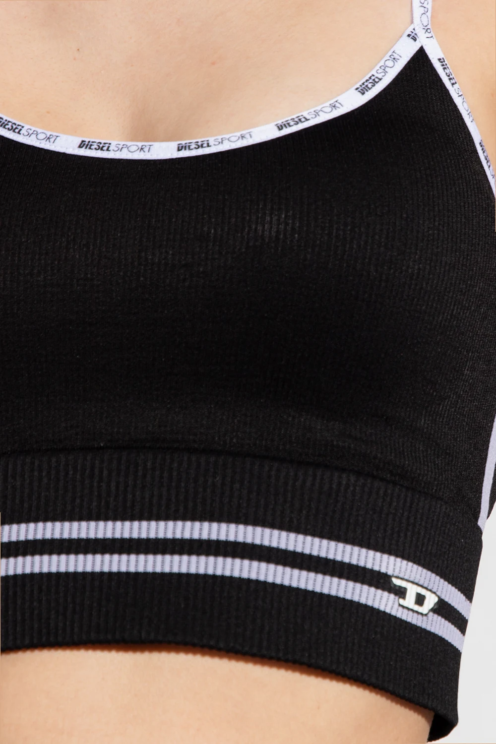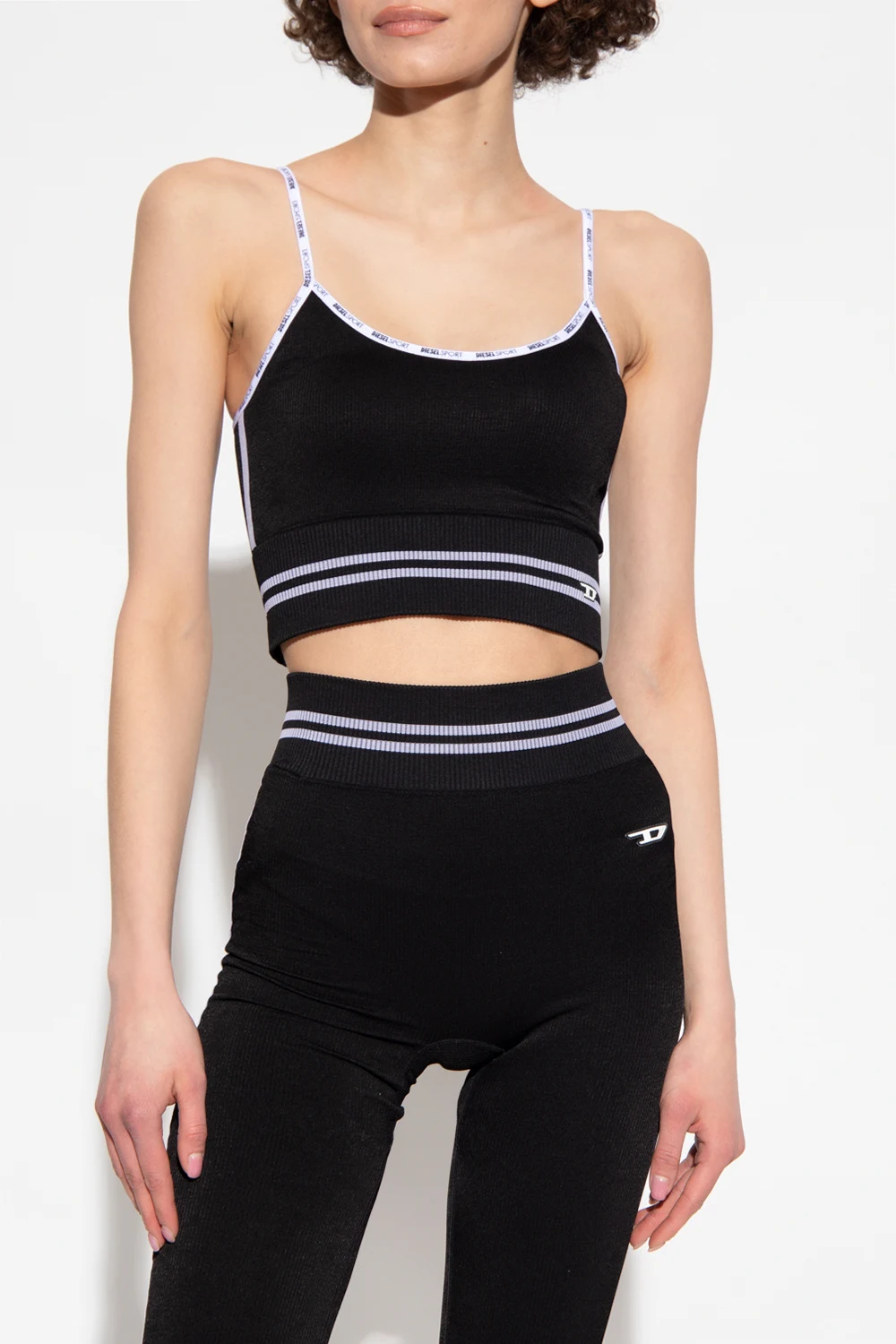 Black ‘AWB-FANNY’ cropped training top from Diesel. Crafted with a ribbed trim, this style features a printed white logo on the front, removable cups, white spaghetti straps and logo detailing.