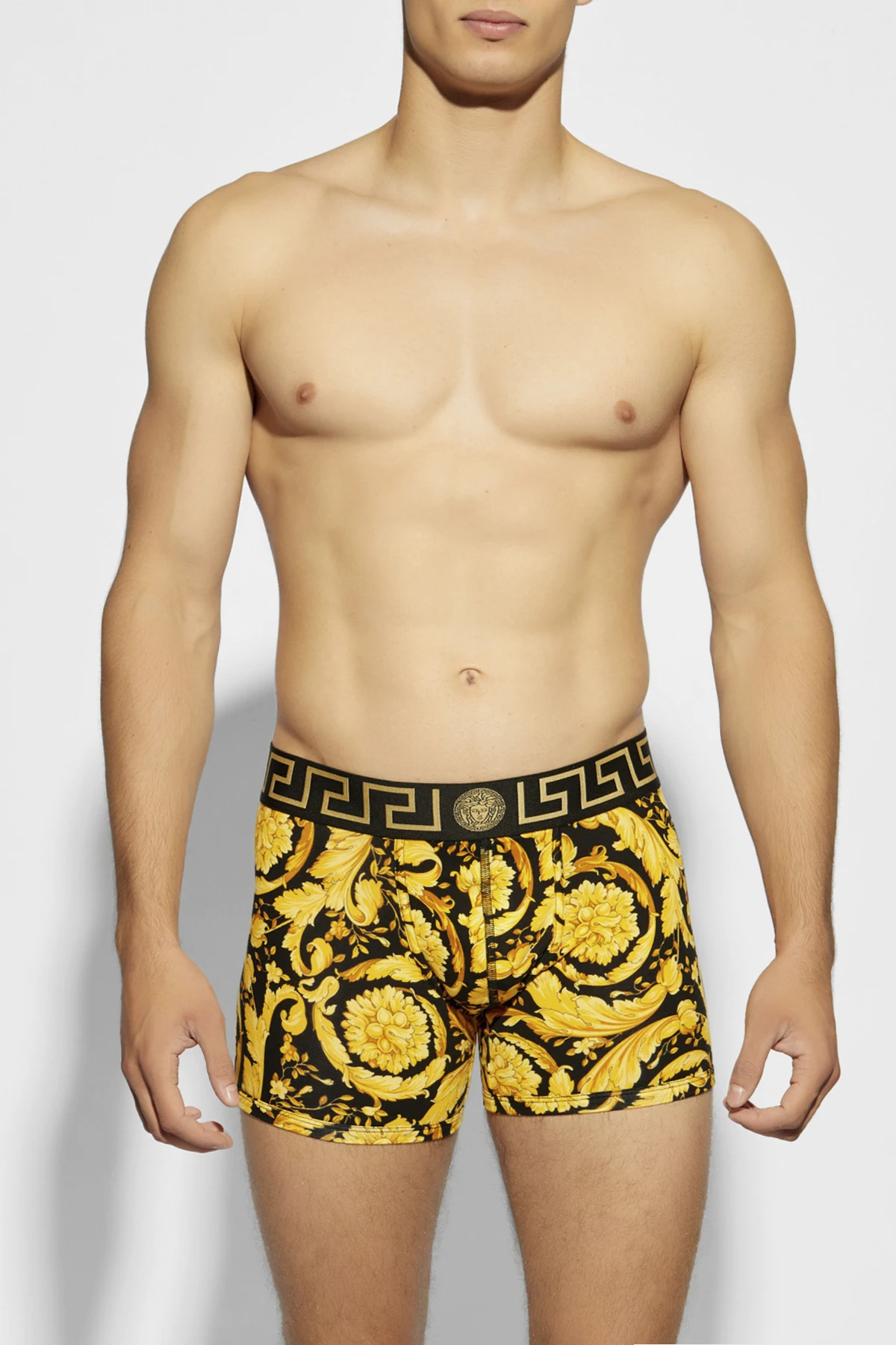 Musterhafte Boxershorts von Versace sind die Quintessenz von Luxus, umhüllt in täglichen Komfort. Gefertigt aus hochwertigstem Stoff, in dem Baumwolle mit einem Hauch Elastan dominiert, garantieren sie einen unvergleichlichen Tragekomfort, während sie gleichzeitig über viele Jahre hinweg ihre perfekte Form bewahren.