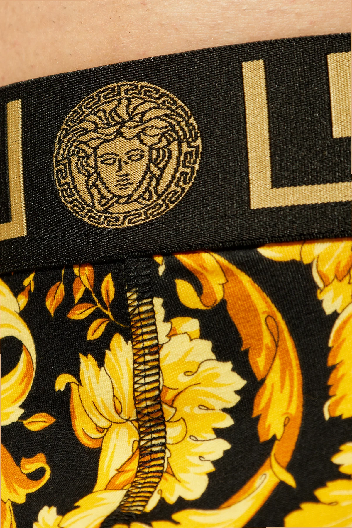 Bezaubernde, barocke Muster, die Blumen und pflanzliche Motive darstellen, erblühen auf einem Hintergrund lebhafter Nuancen von Gelb, Schwarz und Gold, um eine Komposition zu schaffen, die den Blick auf sich zieht und den individuellen Stil unterstreicht. Im Mittelpunkt steht ein breiter, elastischer Bund in Schwarz, geschmückt mit einem sich wiederholenden geometrischen Muster in Goldfarbe sowie einem kunstvoll platzierten Designer-Logo, das das Profil einer klassischen Figur zeigt und sich auf Motive der antiken Kunst bezieht, was dem Produkt einen einzigartigen Charakter verleiht.