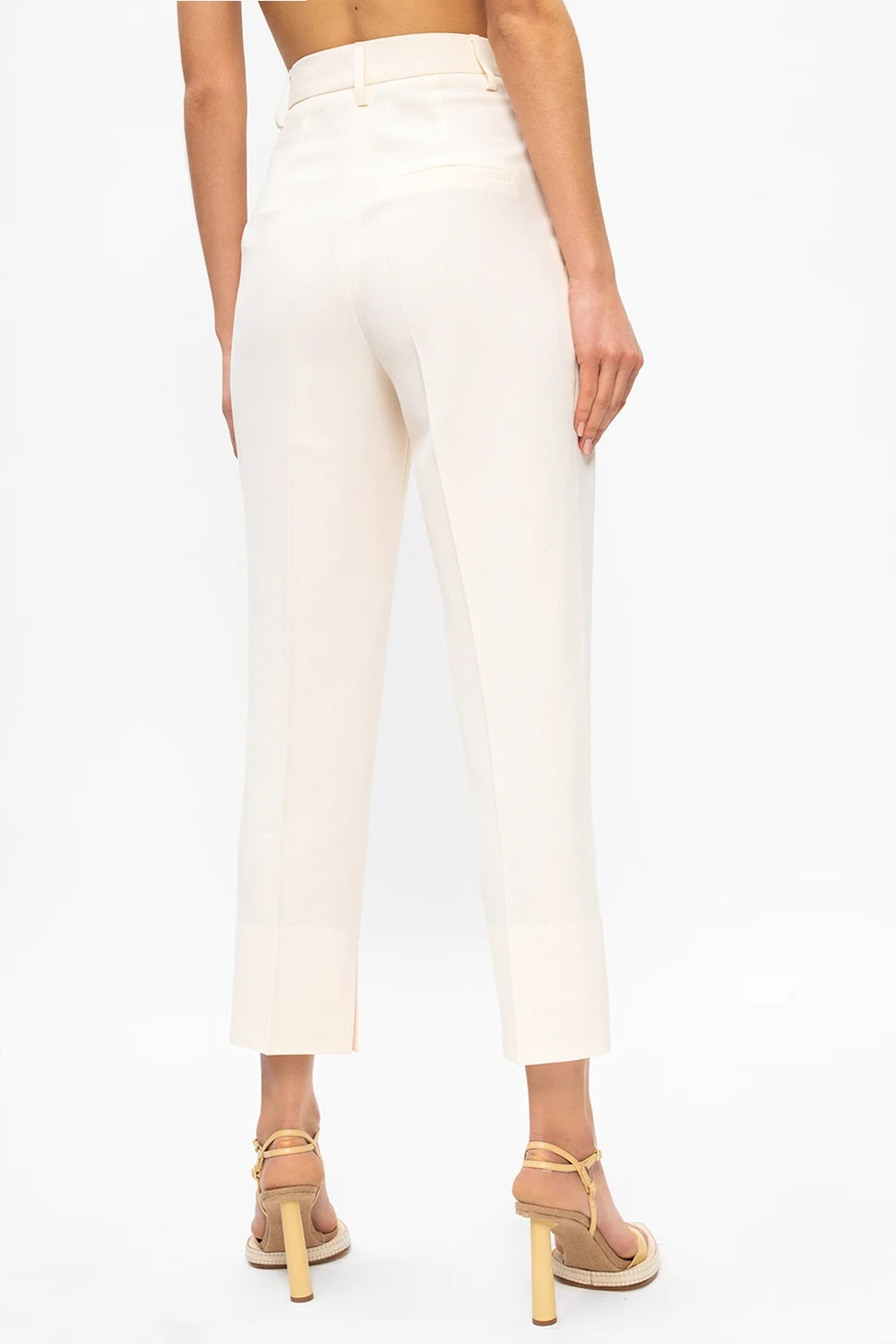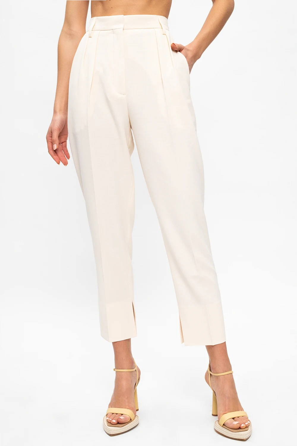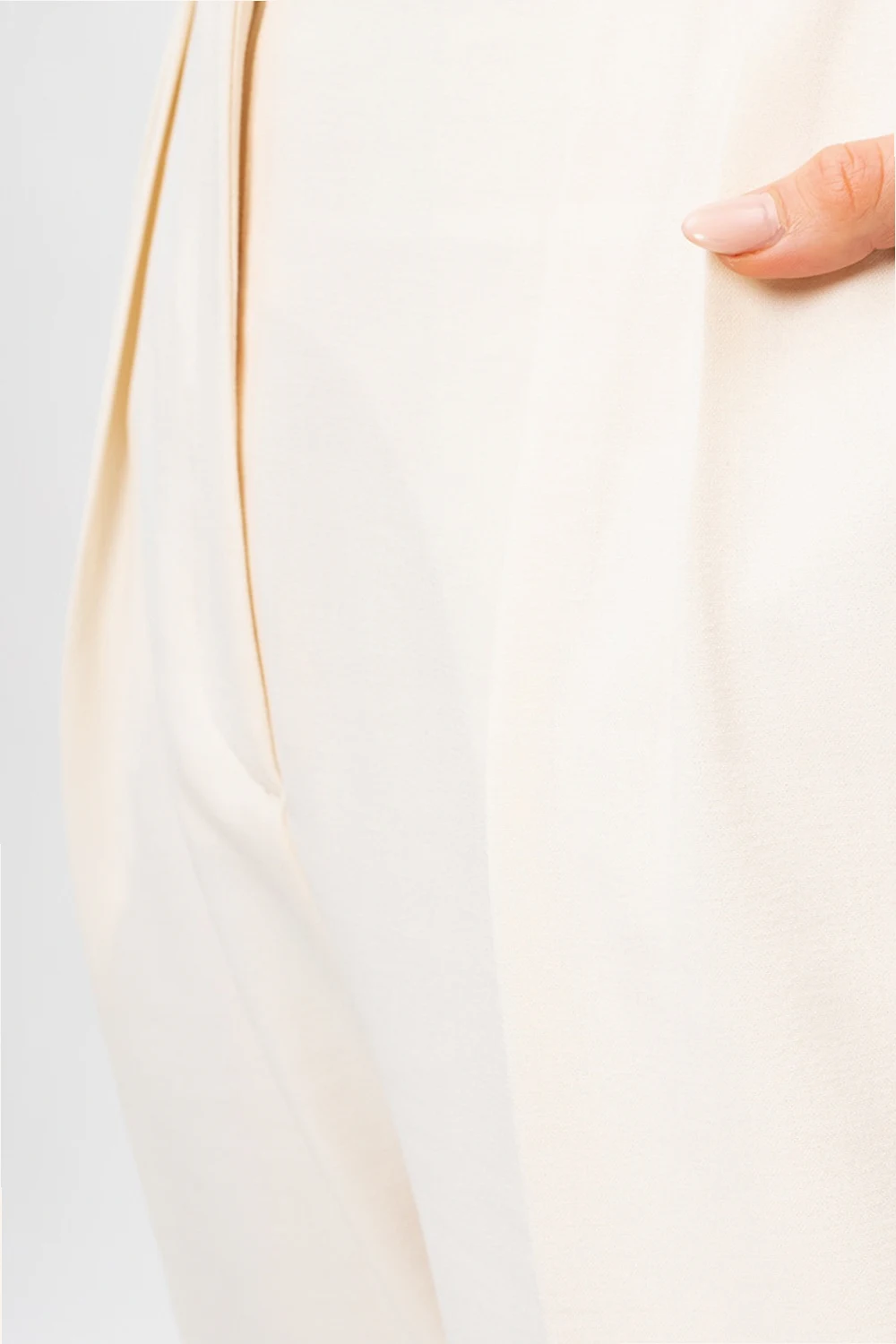 Cream pleat-front trousers from Nanushka. Cut from cotton with a silhouette that sits high on the waist, this pair employs zip, hook and button fastenings, two side seam pockets and one back welt pocket.