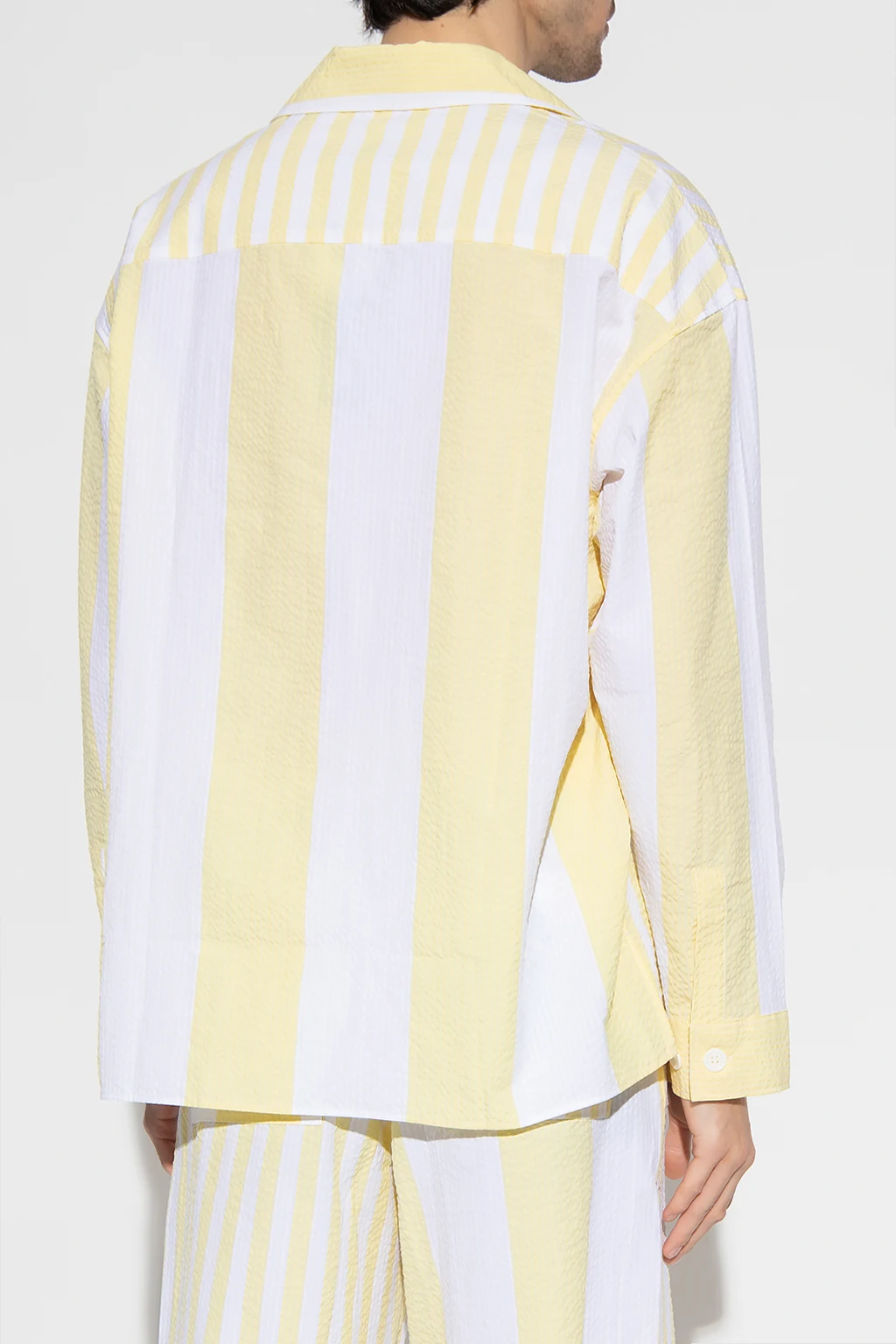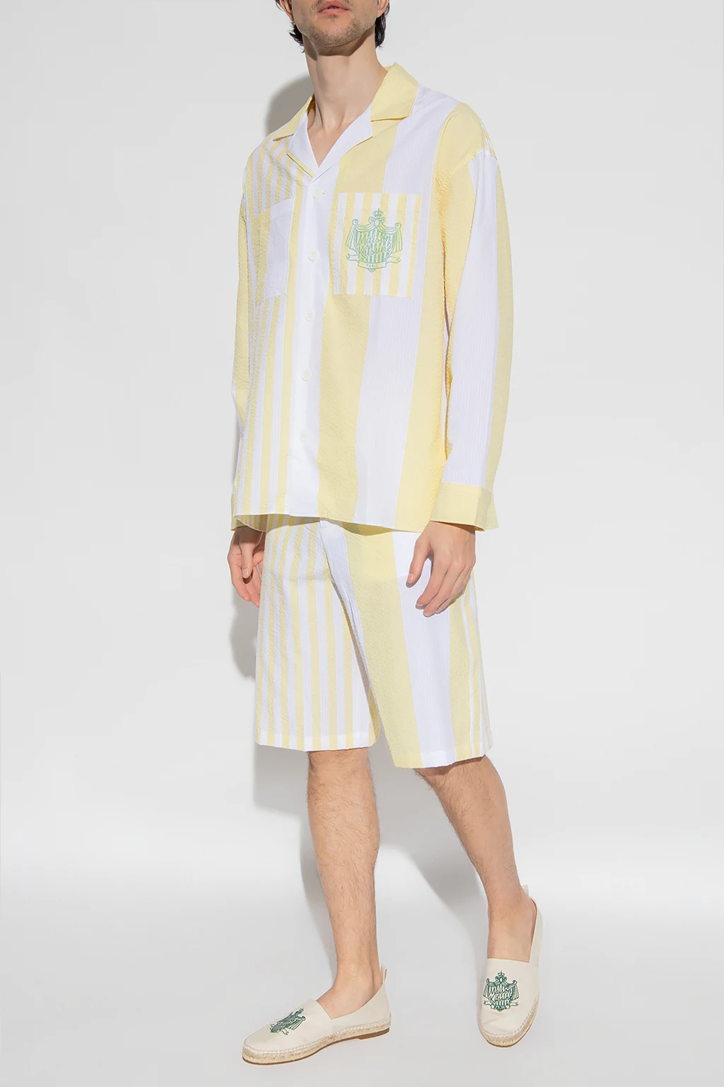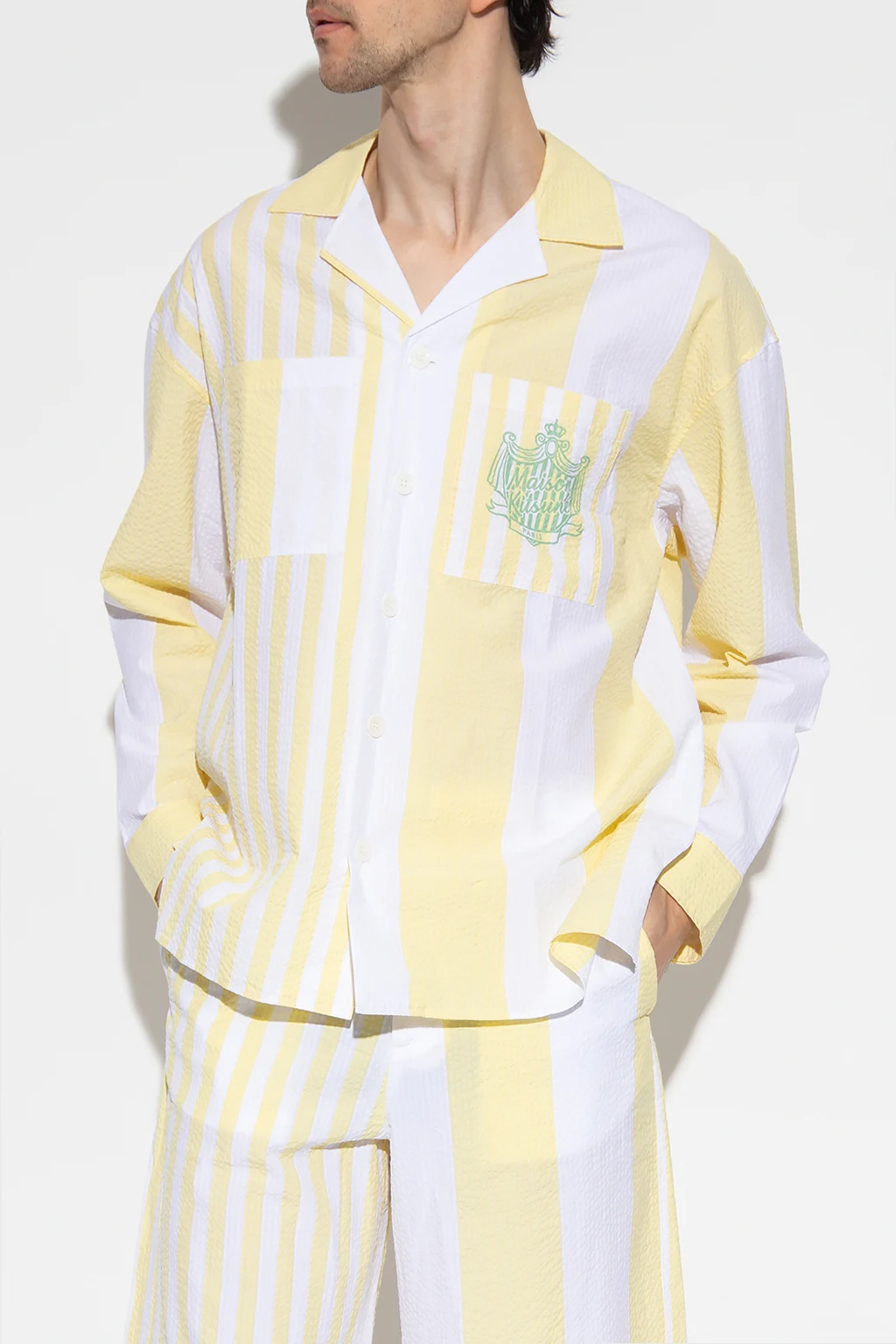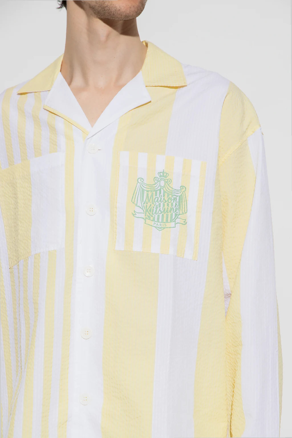 White and yellow shirt from Maison Kitsune. Made of textured cotton, this design features a stripe pattern, two slip pockets - one printed with a logo pattern, and long sleeves with buttoned cuffs.
