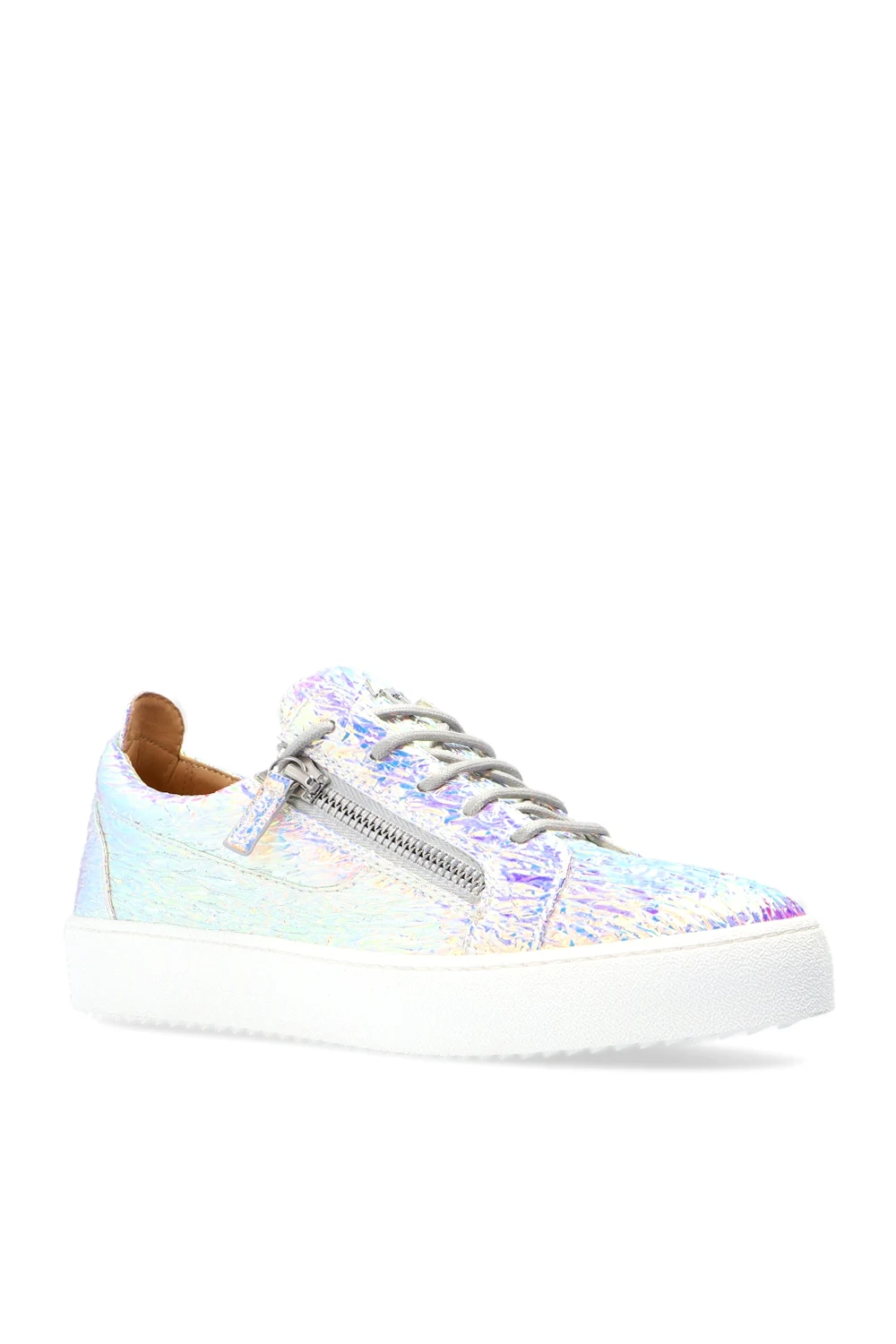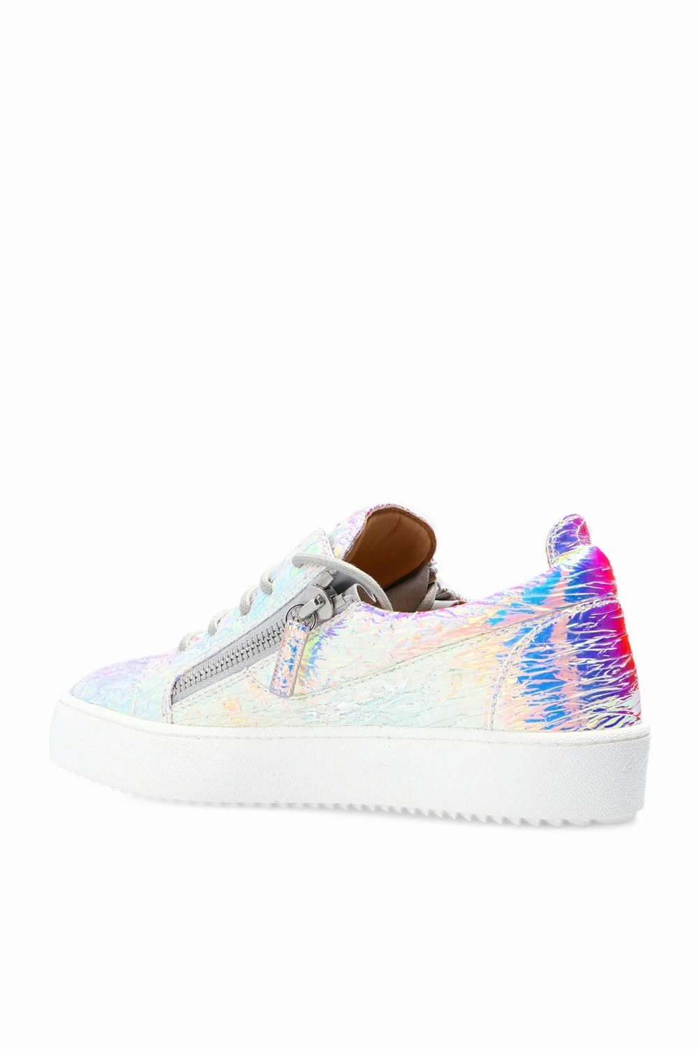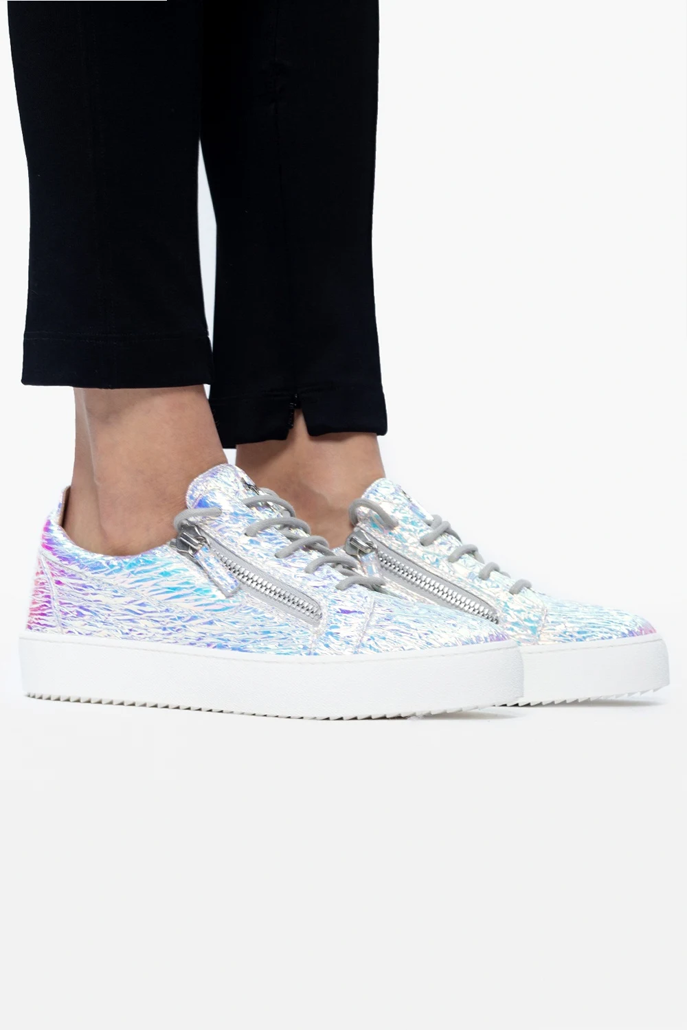 ‘Gail’ sneakers from Giuseppe Zanotti. With a holographical upper, this lace-up pair rests on a white rubber sole and showcases silver-tone metal logo plaque on the front and zip closures on the sides.