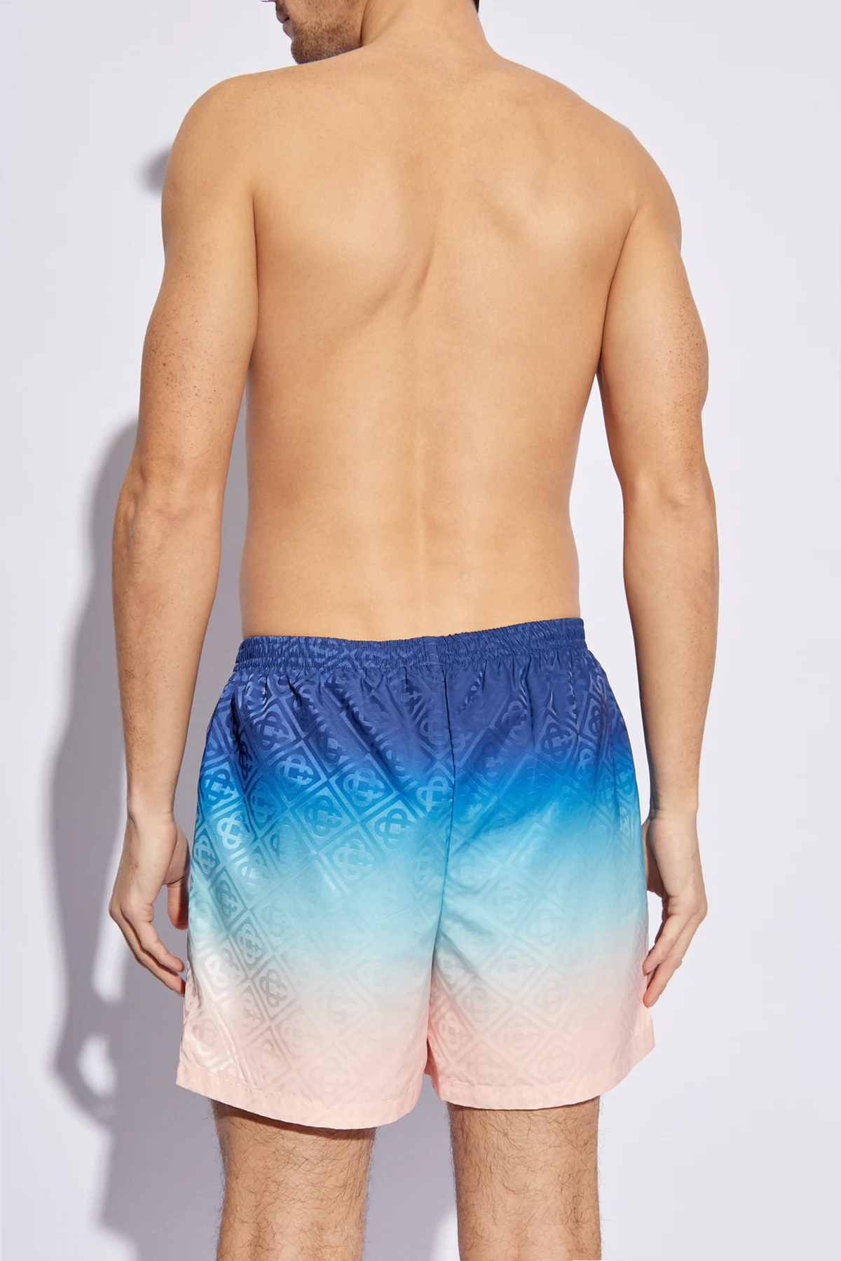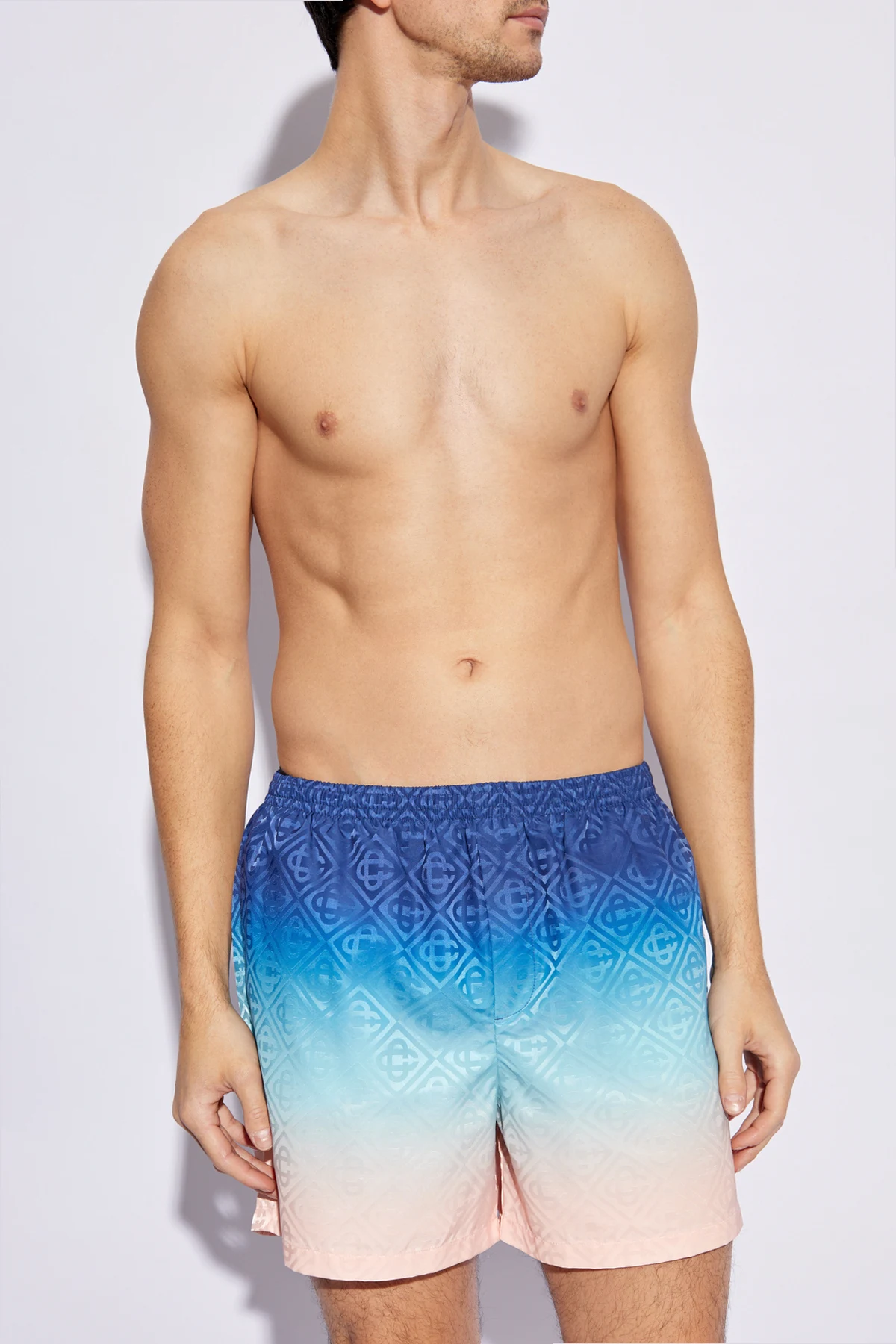 Wir präsentieren die Badeshorts der exklusiven Marke Casablanca , die modernen Stil und raffinierte Ästhetik ausstrahlen. Inspiriert von den Stränden des Mittelmeers, begeistern sie mit einem Farbverlaufsmuster , das von Dunkelblau über Hellblau zu Hellrosa verläuft, verziert mit einem subtilen geometrischen Akzent.