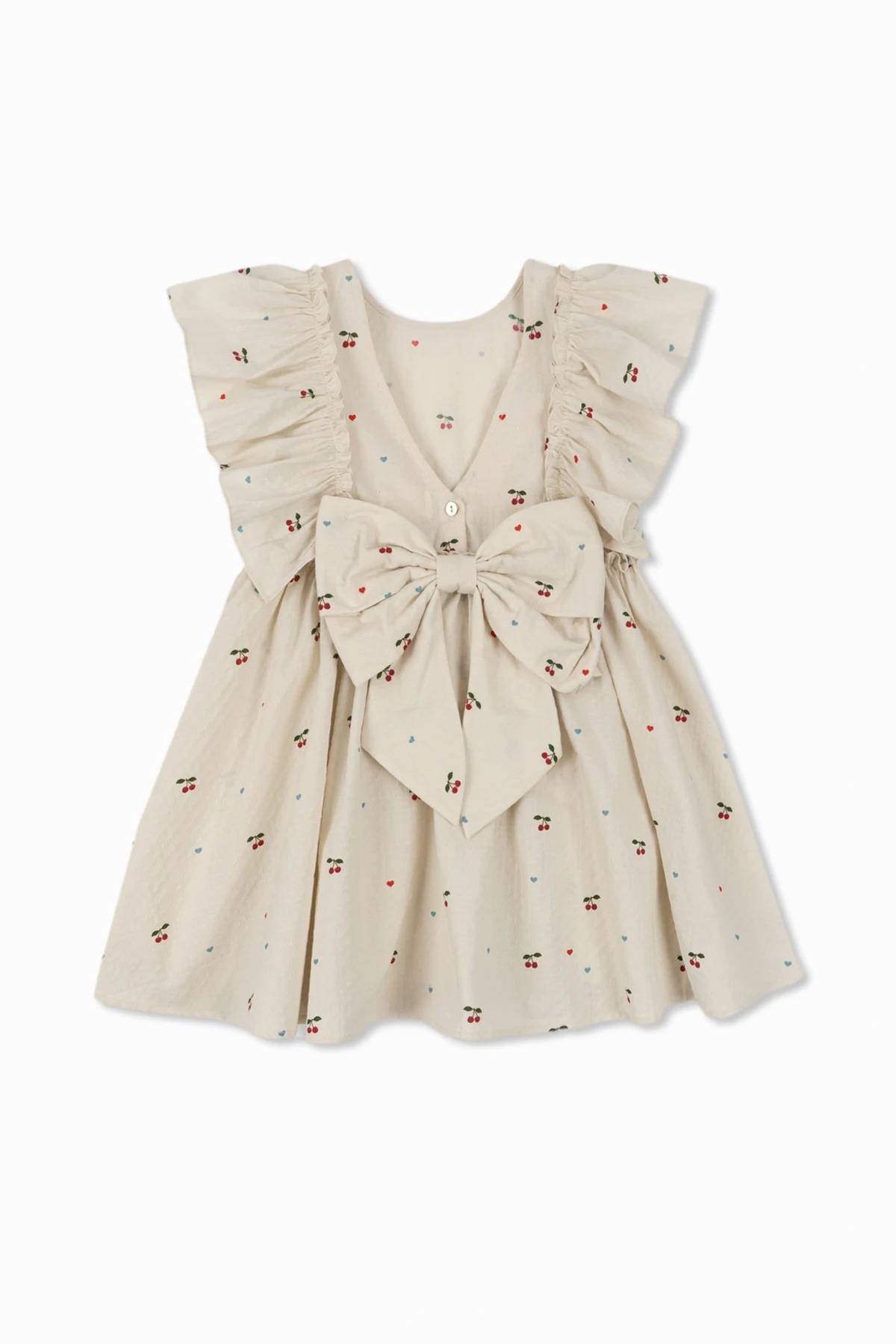Die Konstruktion des Kleides mit kurzen, puffigen Ärmeln und einem runden Ausschnitt unterstreicht die kindliche Unschuld. Die Raffung in der Taille verleiht dem Kleid eine zarte Ausgestelltheit, während die auf dem Rücken platzierte, große, dekorative Schleife, die mit zwei Knöpfen befestigt ist, ein auffälliges Dekorationselement darstellt, das die Blicke auf sich zieht und die Einzigartigkeit des Modells ‘Evia’ hervorhebt.