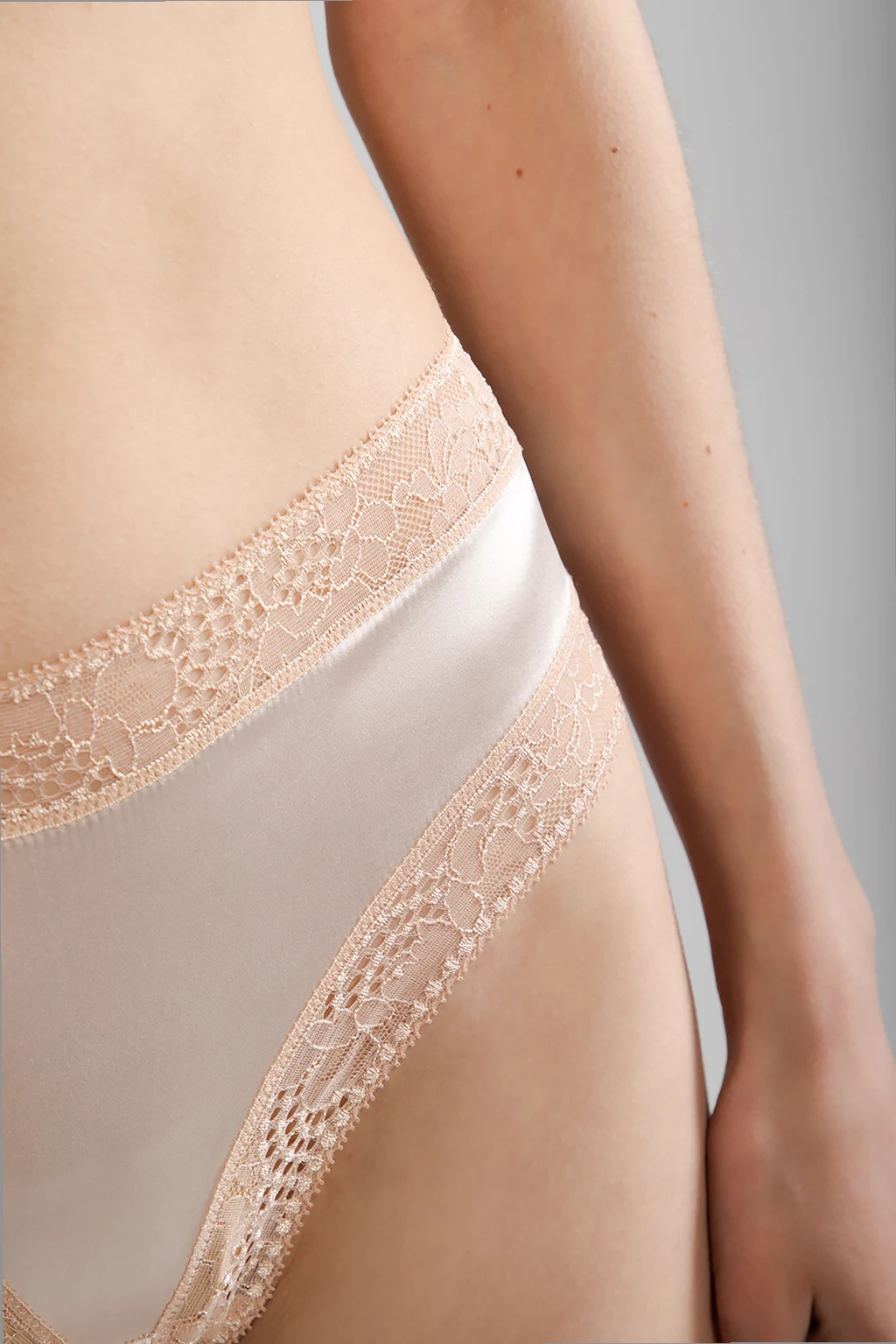 Blush pink ‘Osier’ tanga briefs from Eres. Made of silk with lace trims.