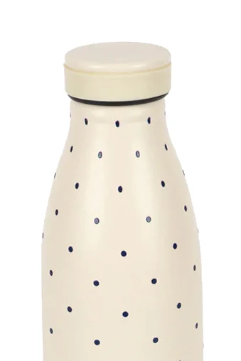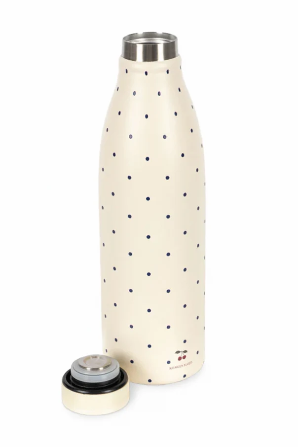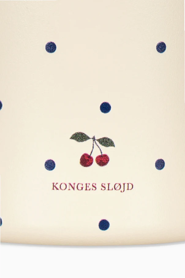 Das gesamte Produkt präsentiert sich in einem zarten Cream -Farbton, der mit einem filigranen, regelmäßigen Muster aus dunkelblauen Punkten überzogen ist. Der Deckel mit sanften Kanten harmoniert perfekt mit dem Flaschenkörper, und am unteren Rand befindet sich das dezente Logo in Form von zwei Kirschen mit grünen Blättern sowie dem bordeauxfarbenen Schriftzug „KONGES SLOJD“ – ein Symbol für Exklusivität und Liebe zum Detail.