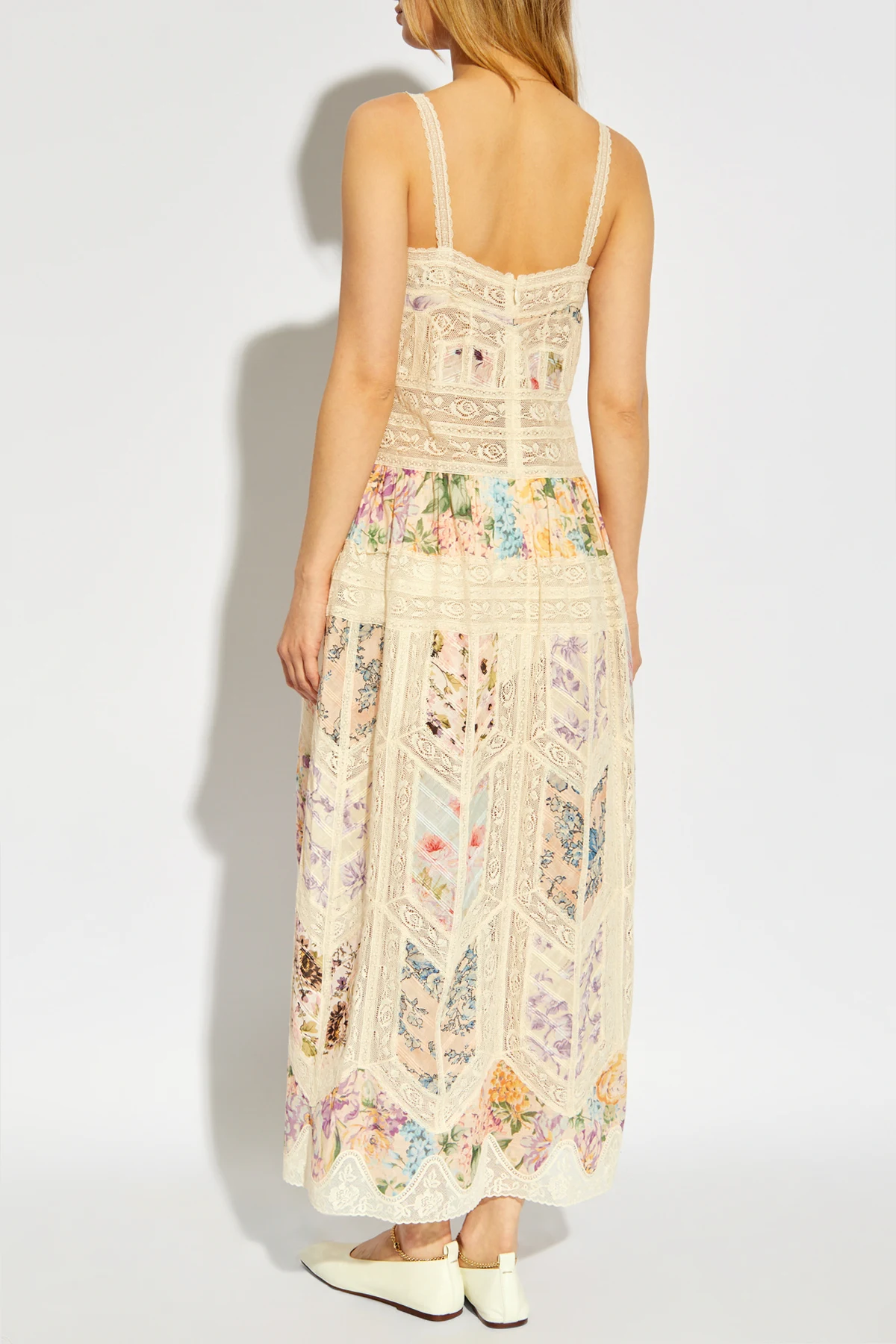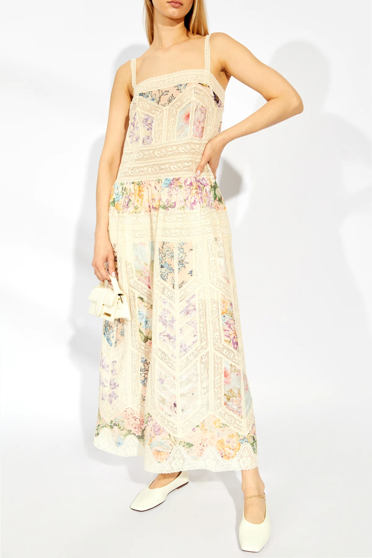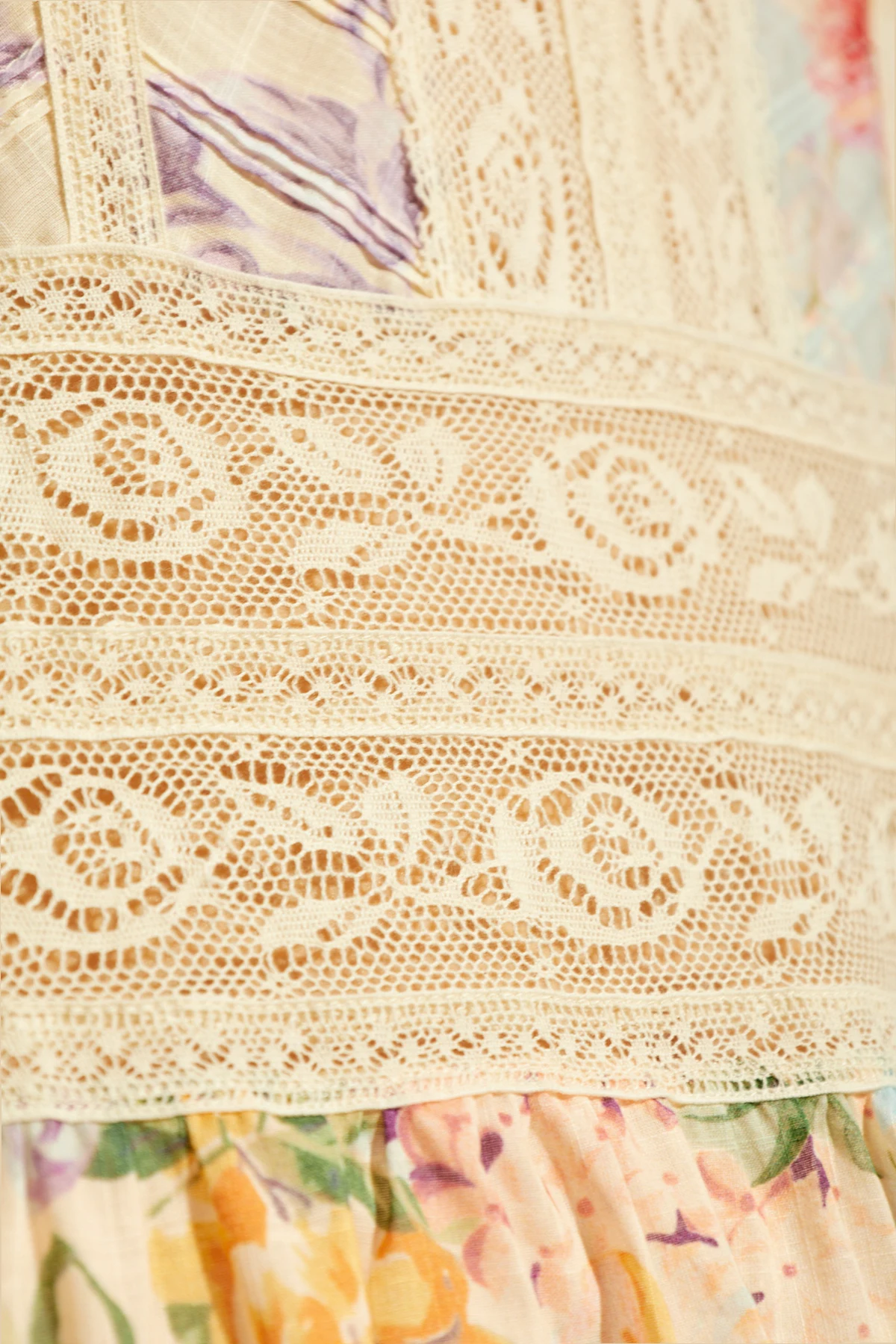 Das Kleid mit Blumenmotiv von Zimmermann verkörpert die Quintessenz weiblicher Eleganz und Feinheit. Das Design, das sich auf einem cremefarbenen Stoff präsentiert, bezaubert durch eine Fülle von Farben und Mustern. Die Blumenmotive, die in Schattierungen von Rosa, Violett, Grün und Gelb prächtig erblühen, erschaffen nicht nur ein Kleidungsstück, sondern ein Kunstwerk, erfüllt von Leben und Emotionen.