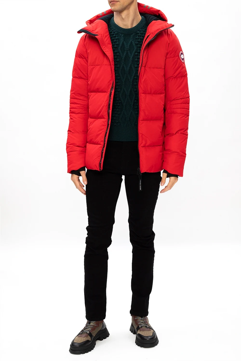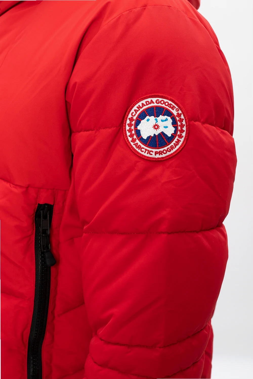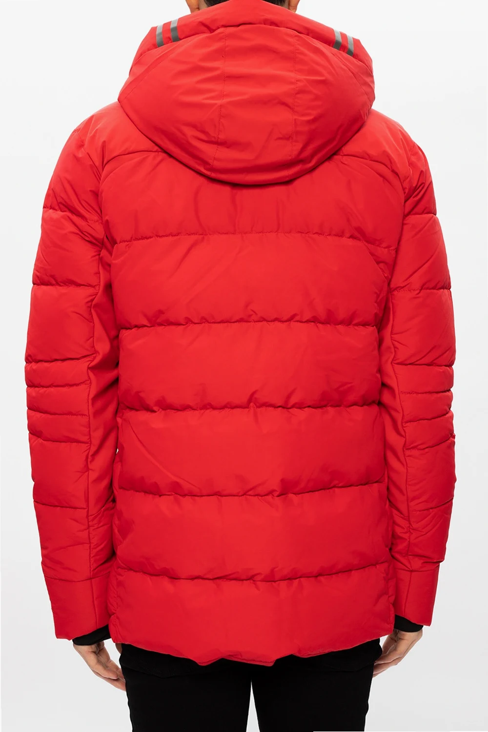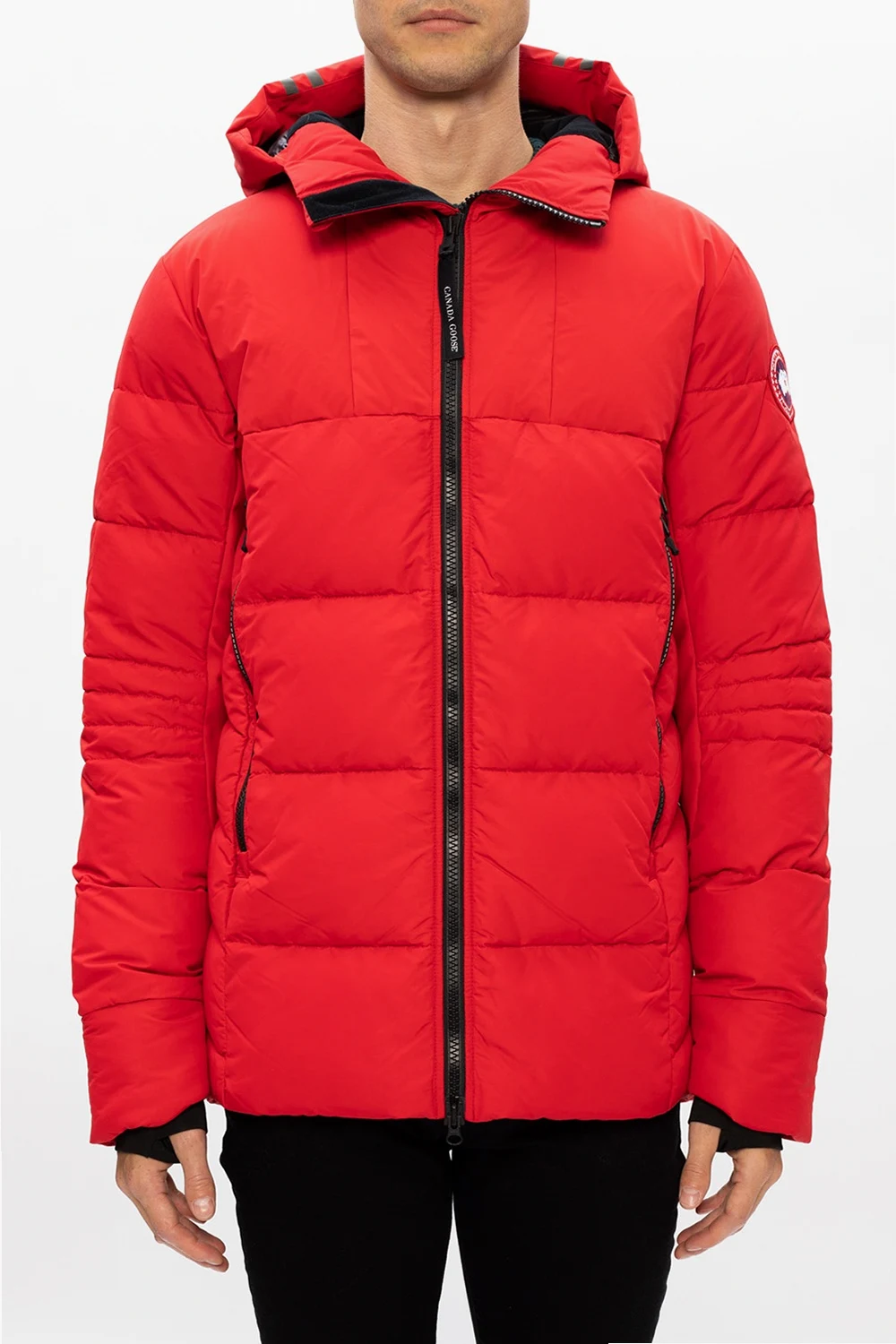 Red ‘Hybridge’ hooded jacket from Canada Goose. Fastened with a two-way zip, this garment features a logo patch in red, white and blue, two zip pockets and elasticated cuffs with thumb holes.
