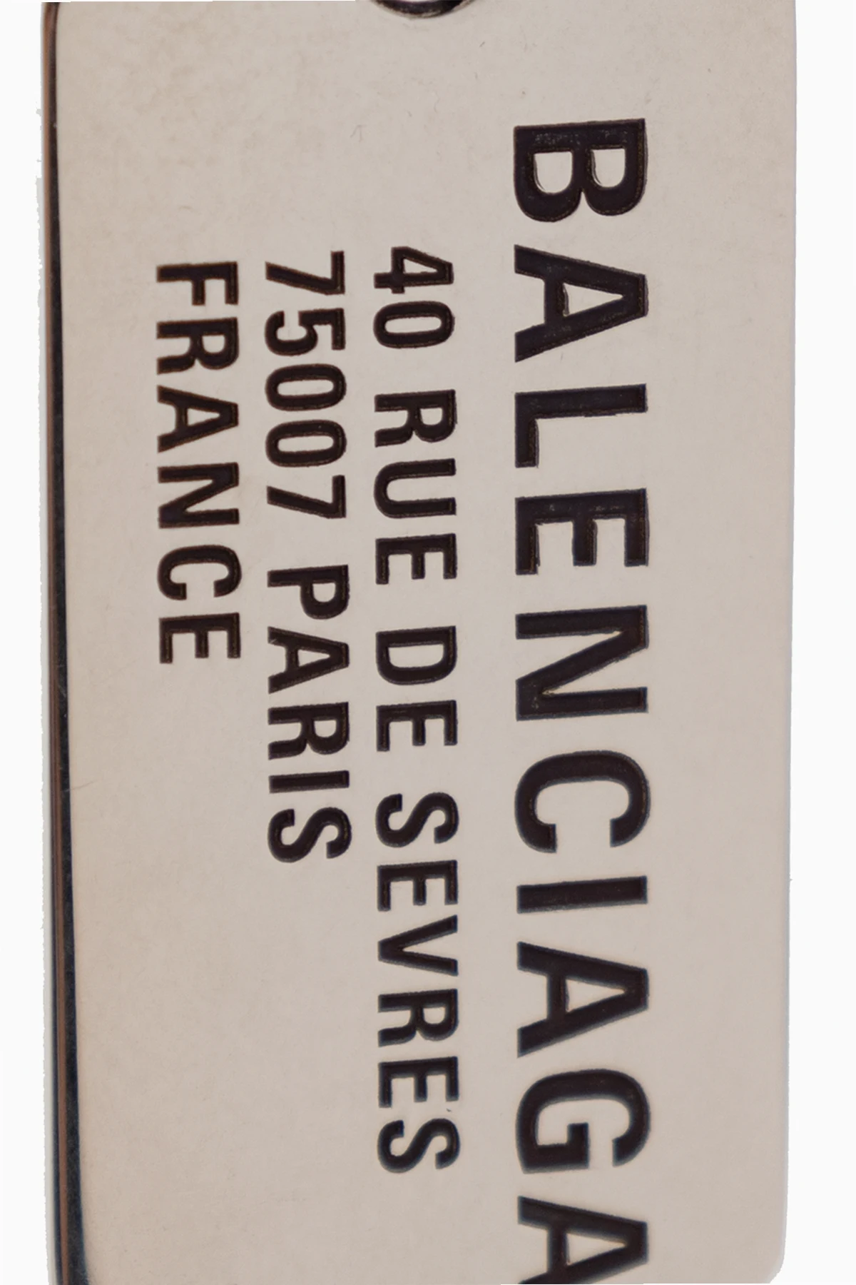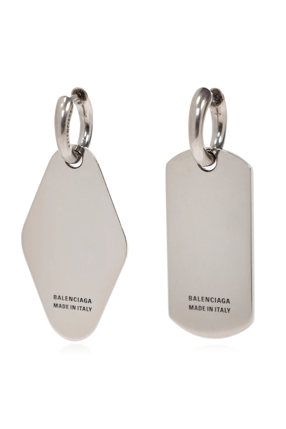 Two different earrings from Balenciaga. Made of silver-tone brass, they secure with snaps and showcase engraved detailing with the brand's logo.