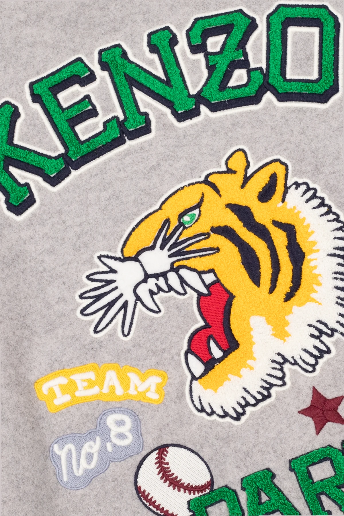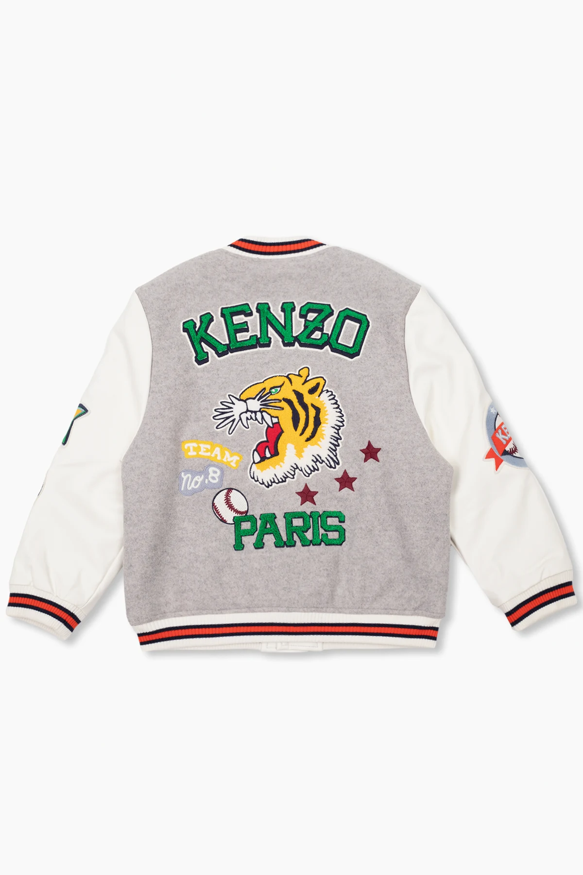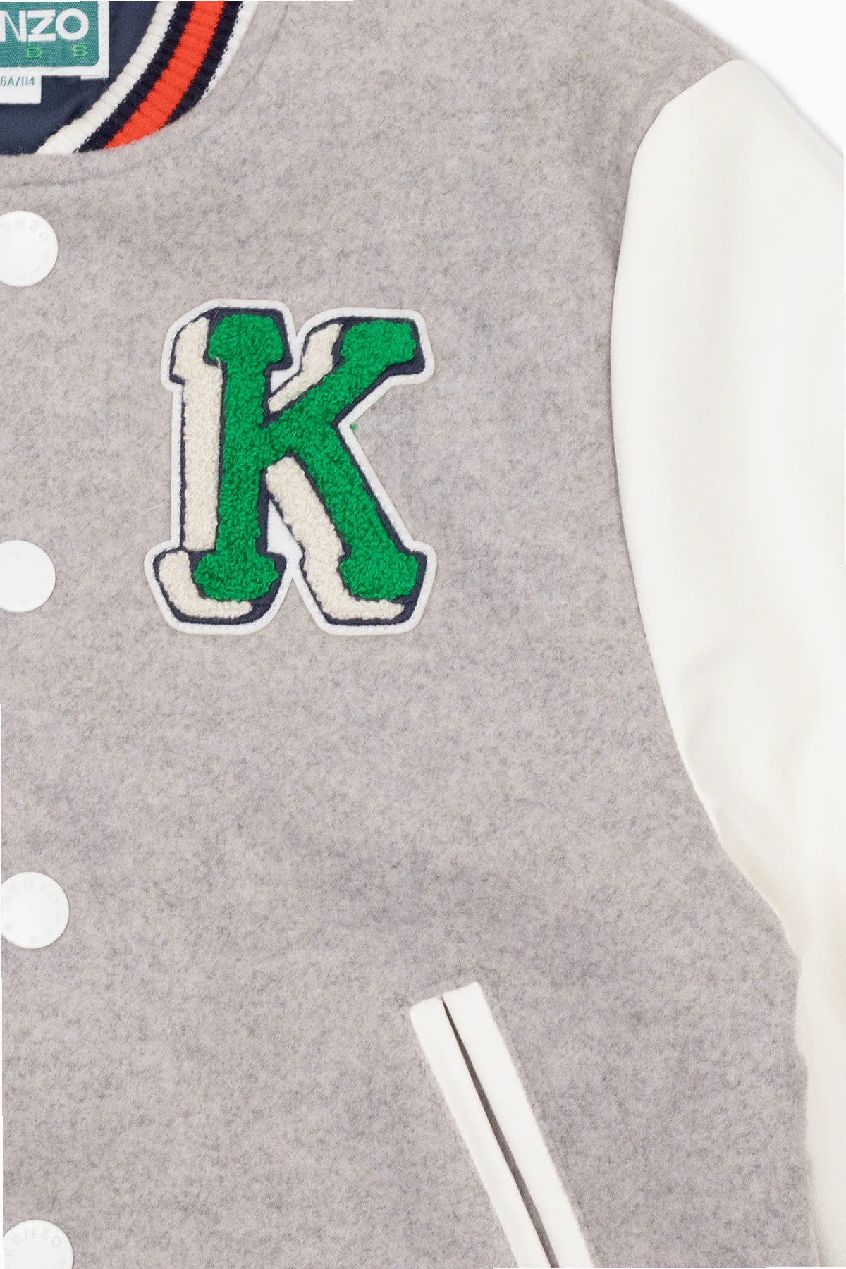 Grey and white bomber jacket from Kenzo Kids. Emblazoned with colourful patches and logo embroidery, this style features snap closures, two welt pockets, long sleeves in faux-leather and ribbing on the edges.