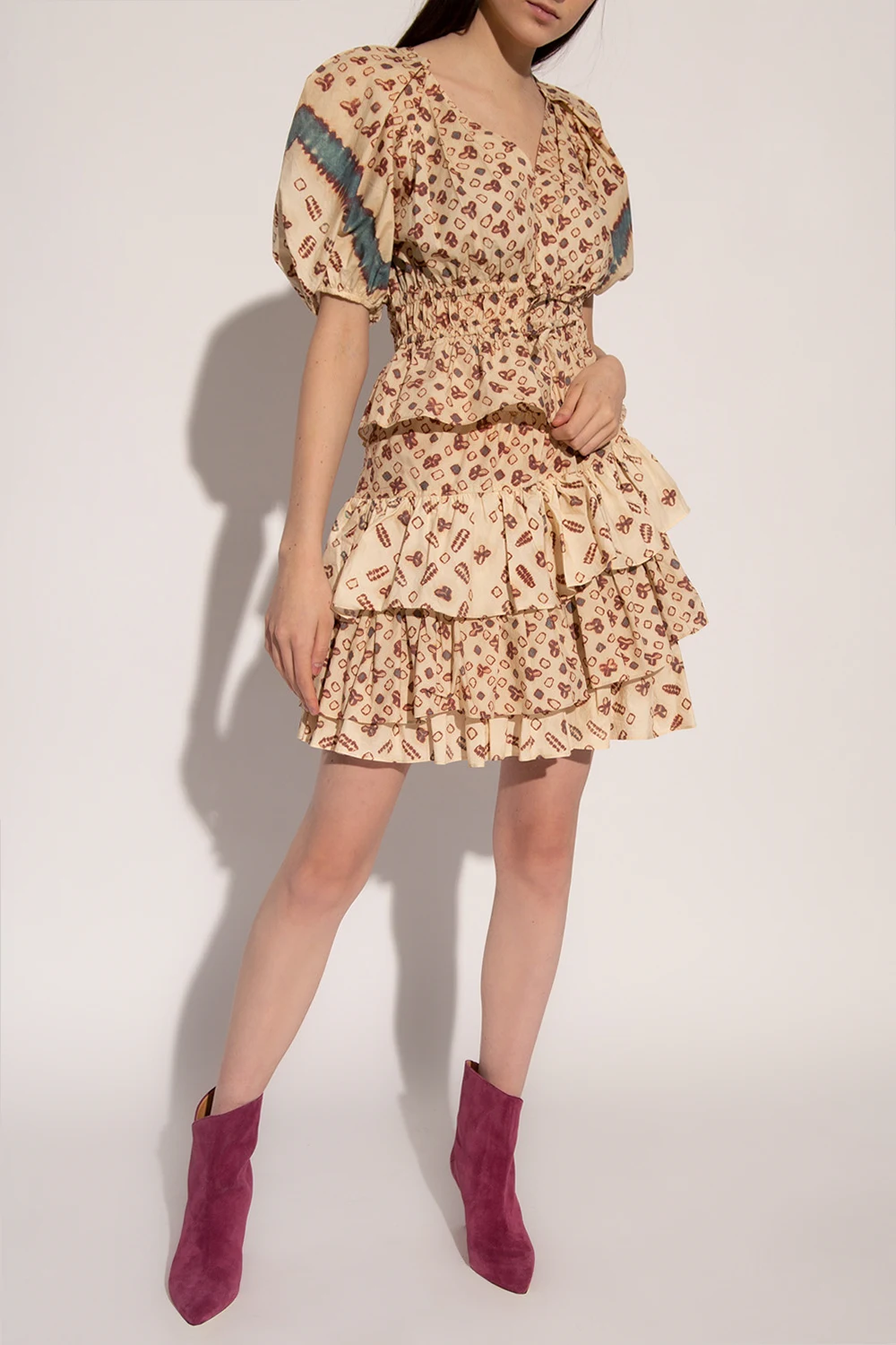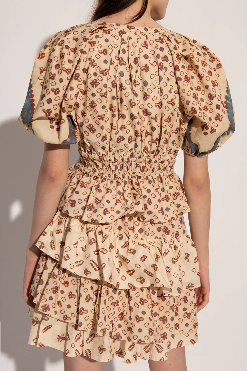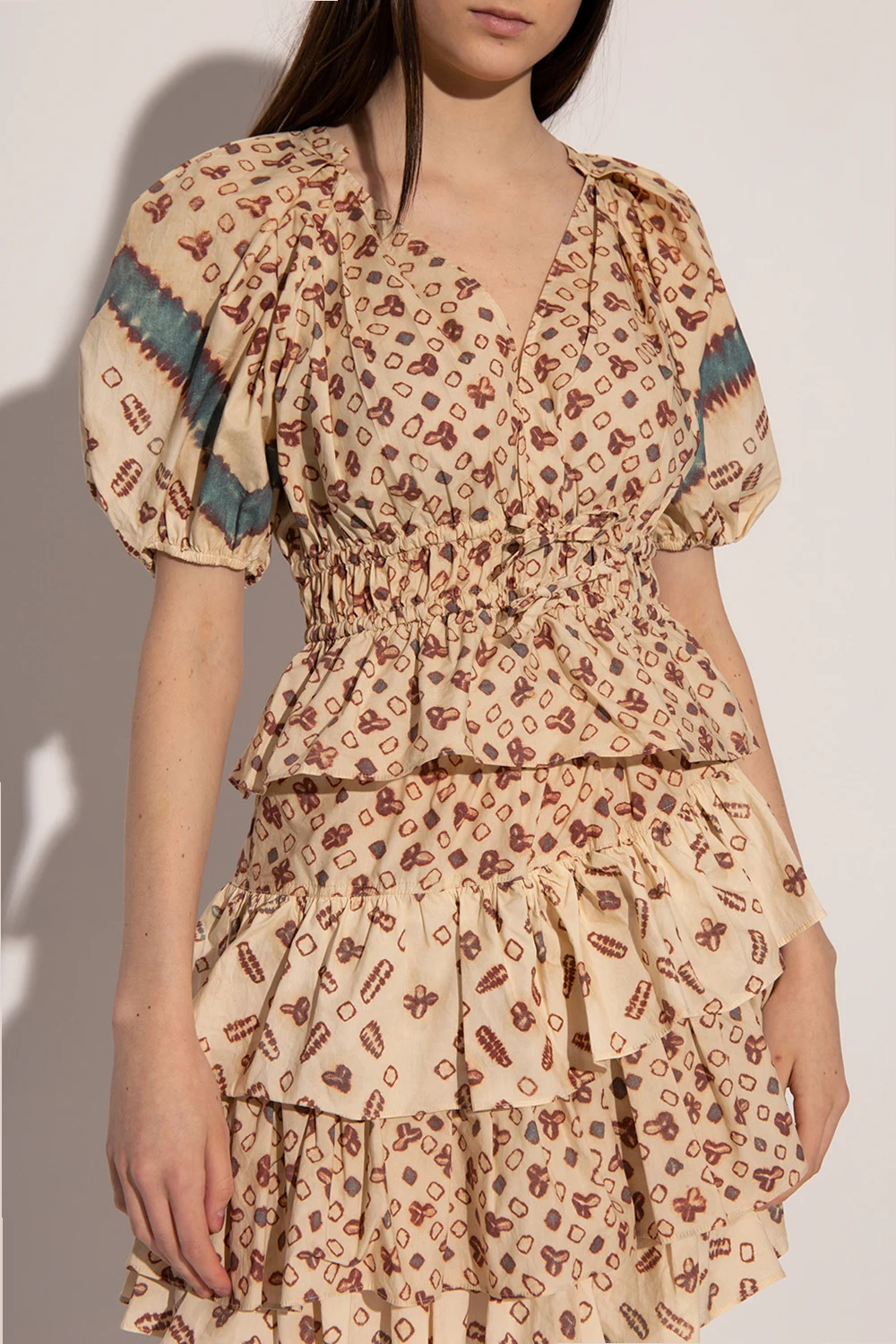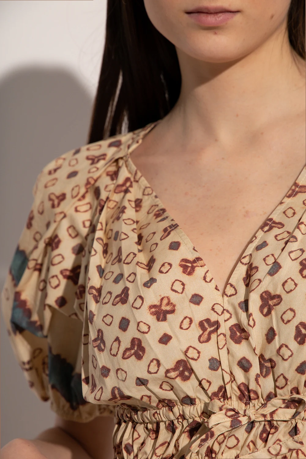 Beige top 'Ines' from Ulla Johnson. Made of cotton. Decorated with a brown and blue-green pattern. Elastic waist with drawstrings. V-neck. Short, puffed sleeves finished with ribbons.