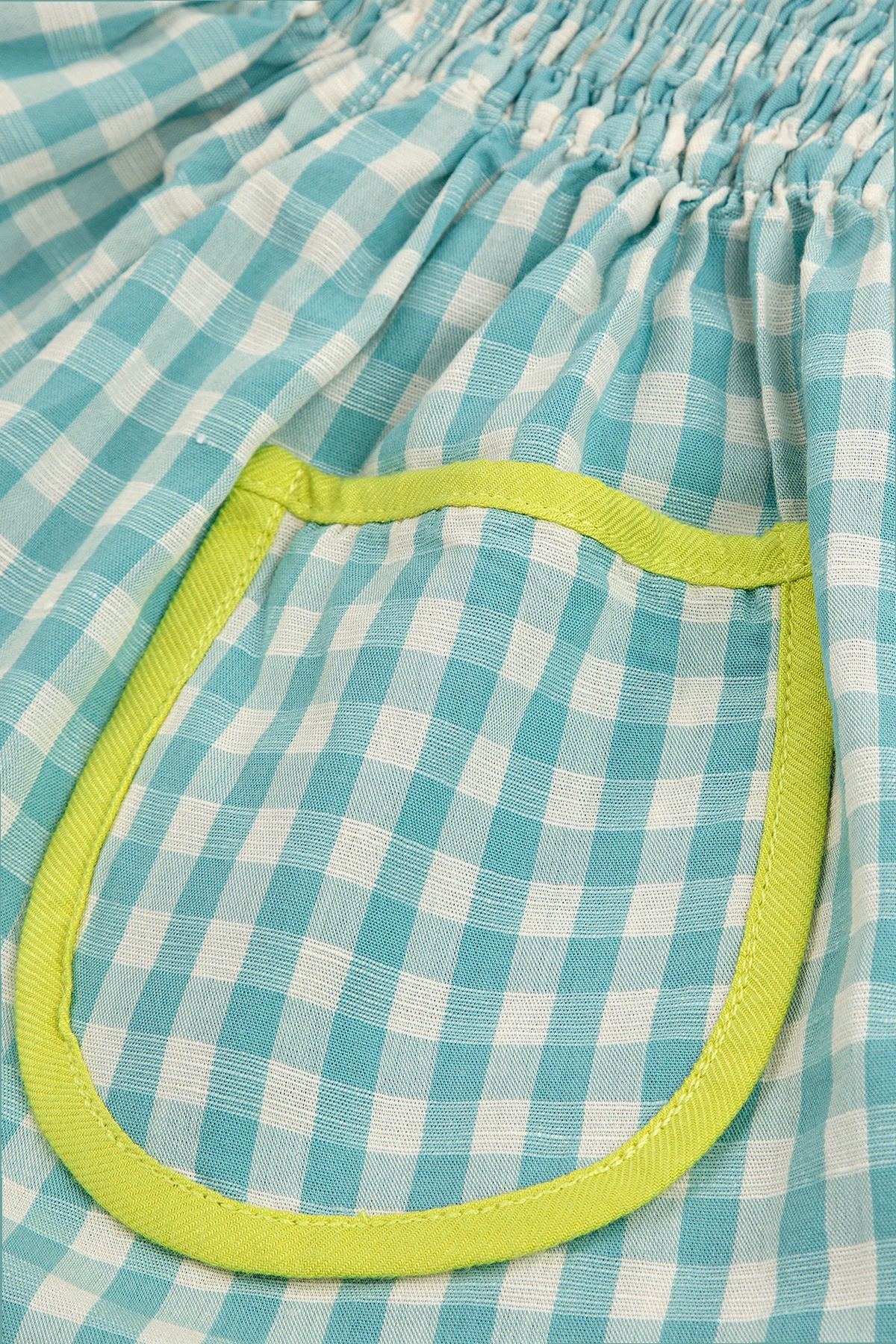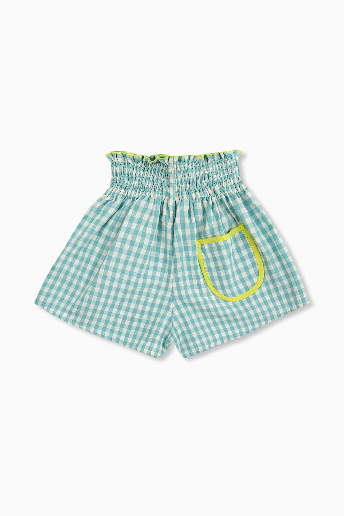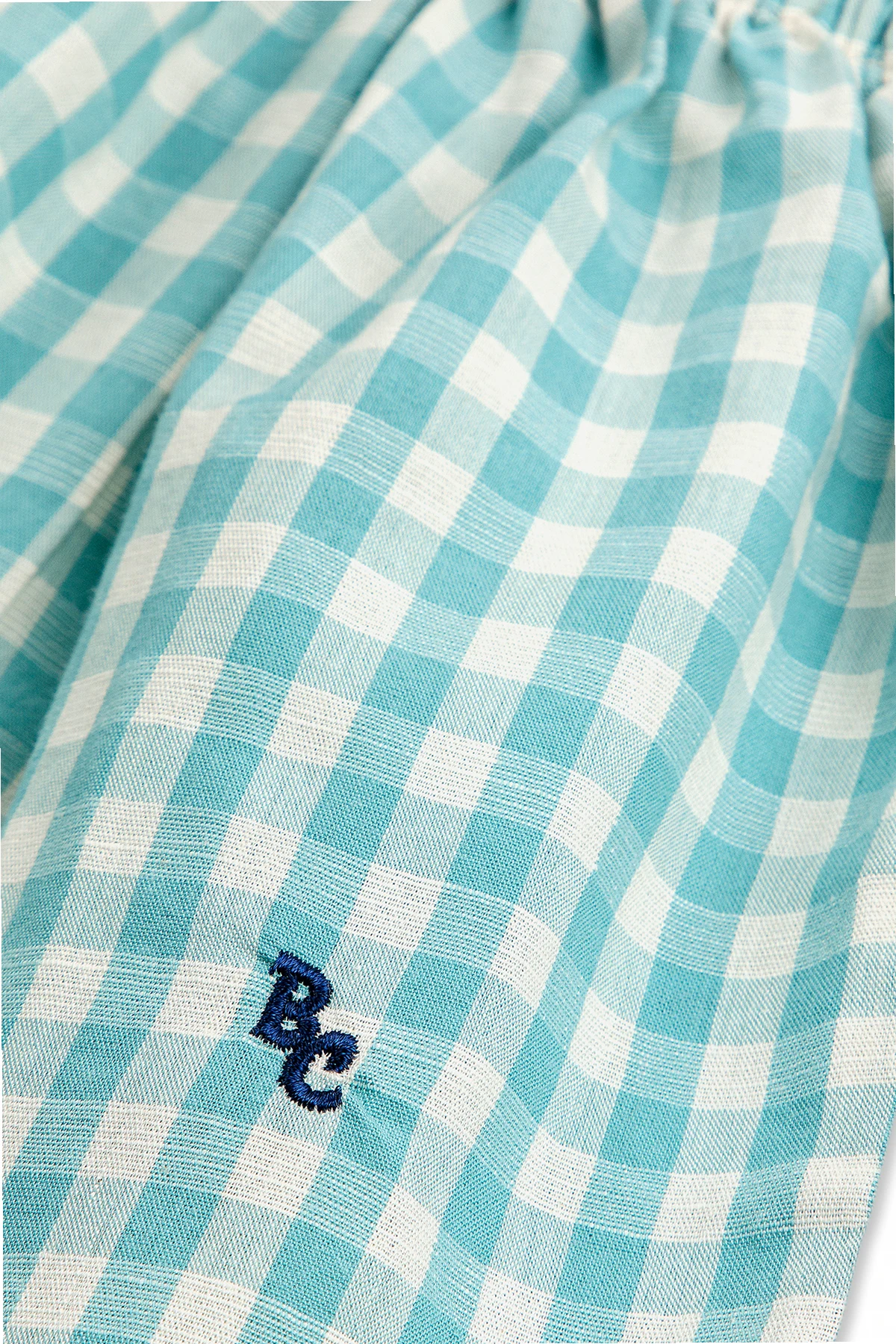 Blue and white shorts from Bobo Choses. Made from a cotton and linen blend, this pair showcases a Vichy check pattern, an elasticated waistband, navy blue logo embroidery on the front and one slip pocket on the back.
