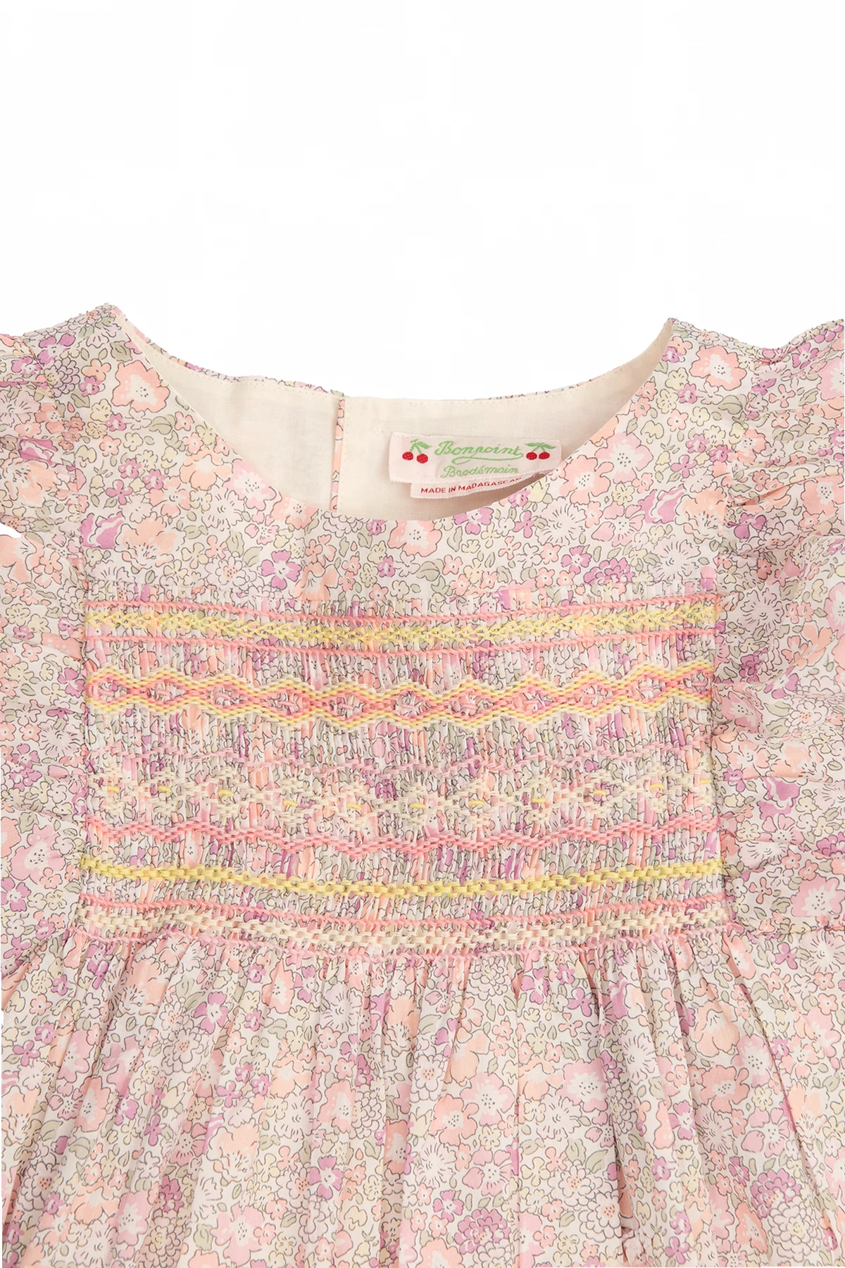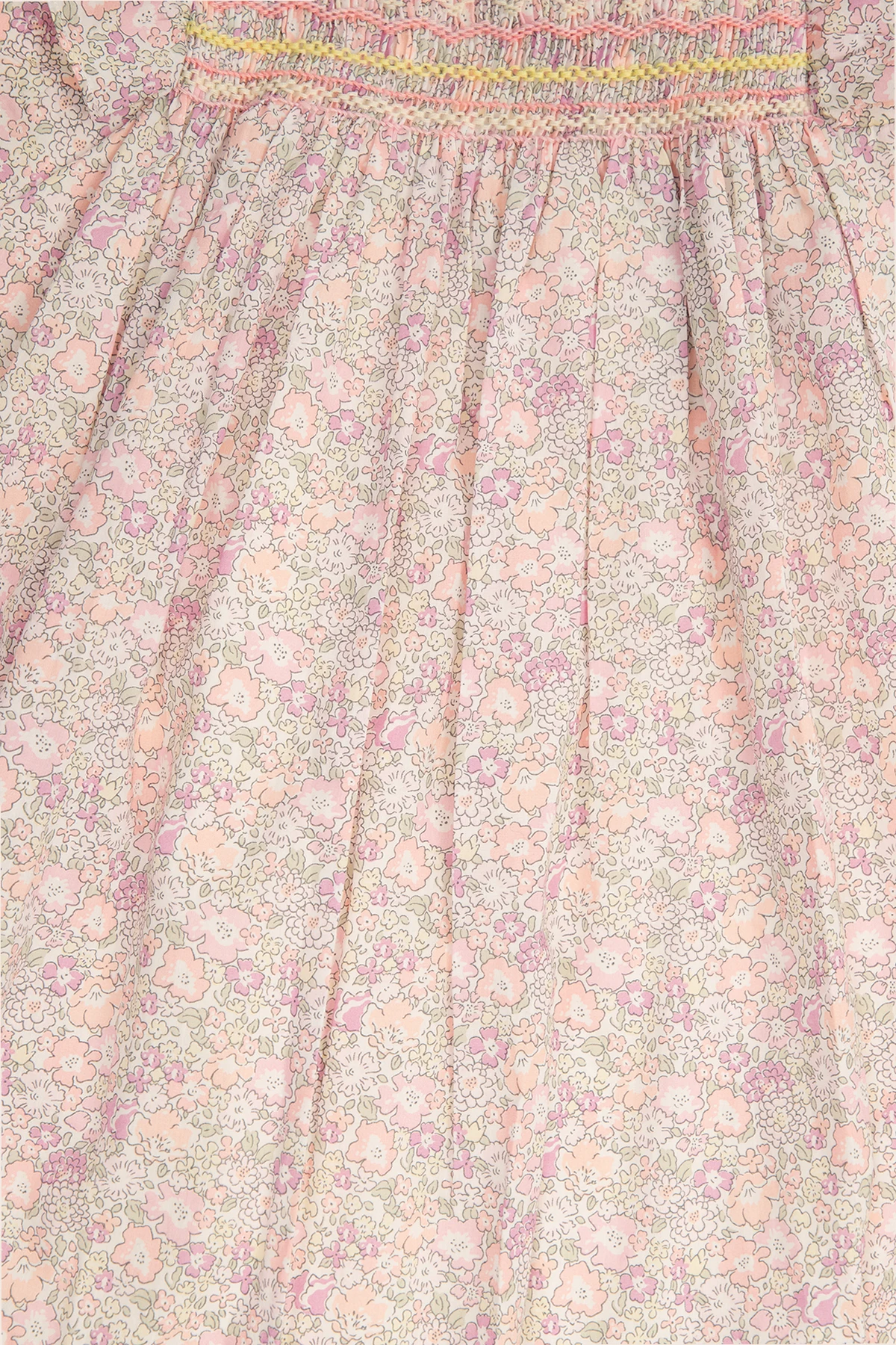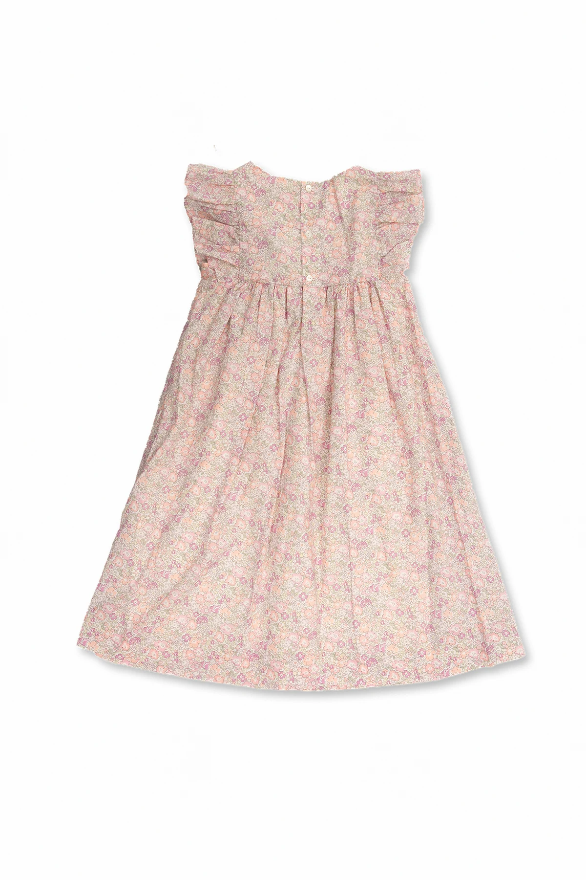 Light pink ‘Fiorella’ dress from Bonpoint. Made from Liberty® cotton, this style is embellished with a colourful floral motif and topstitched welt and features a round neck, button fastenings on the back, ruffled short sleeves and a flared hem.