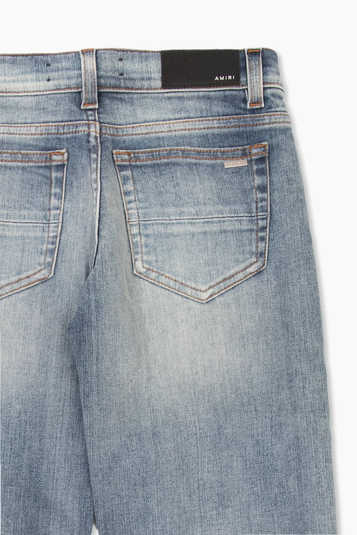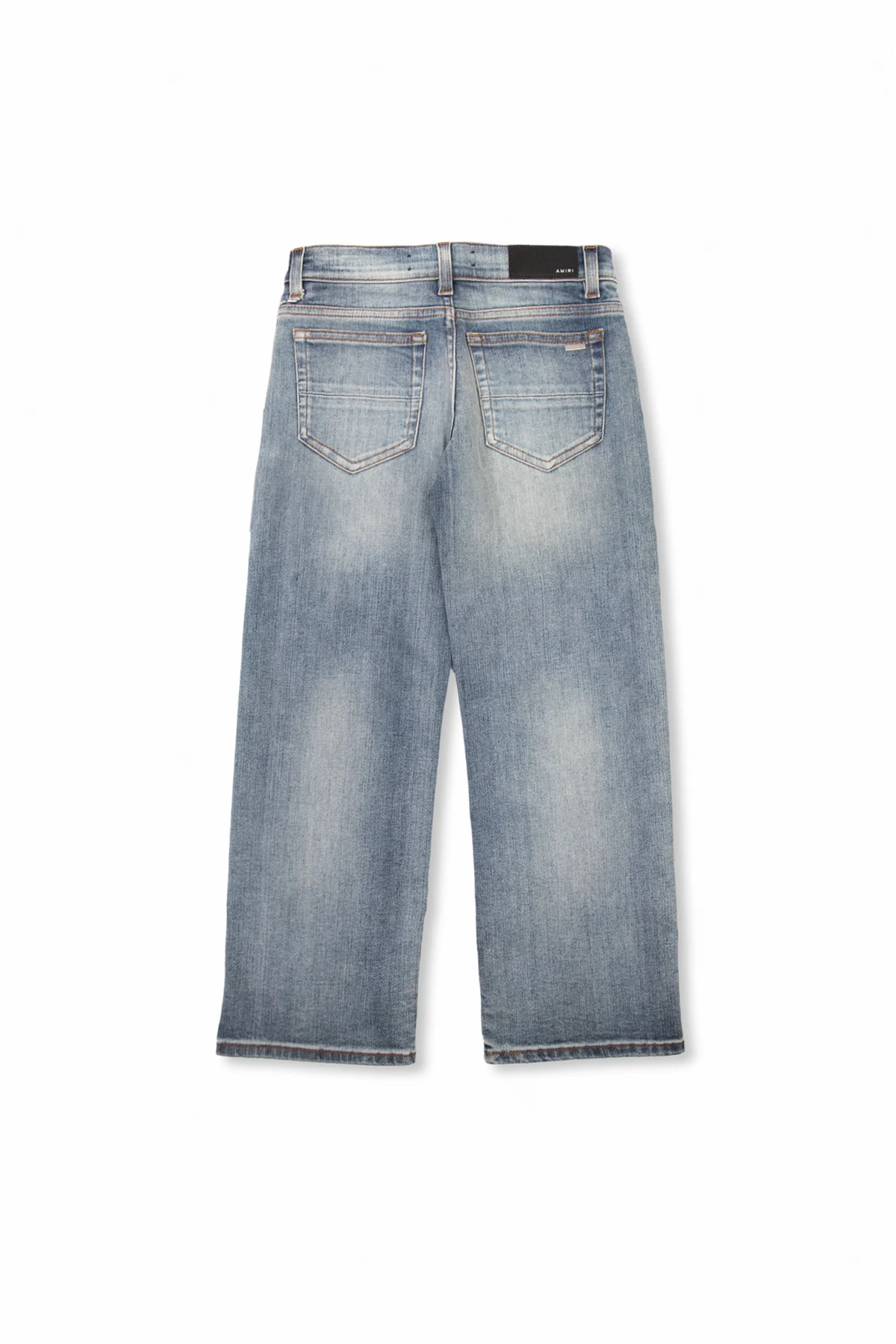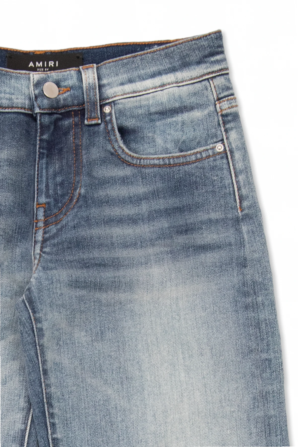 Blue jeans from Amiri Kids. Made of cotton, this straight leg pair features a zip and button fastening, five slip pockets and a logo patch at the back.