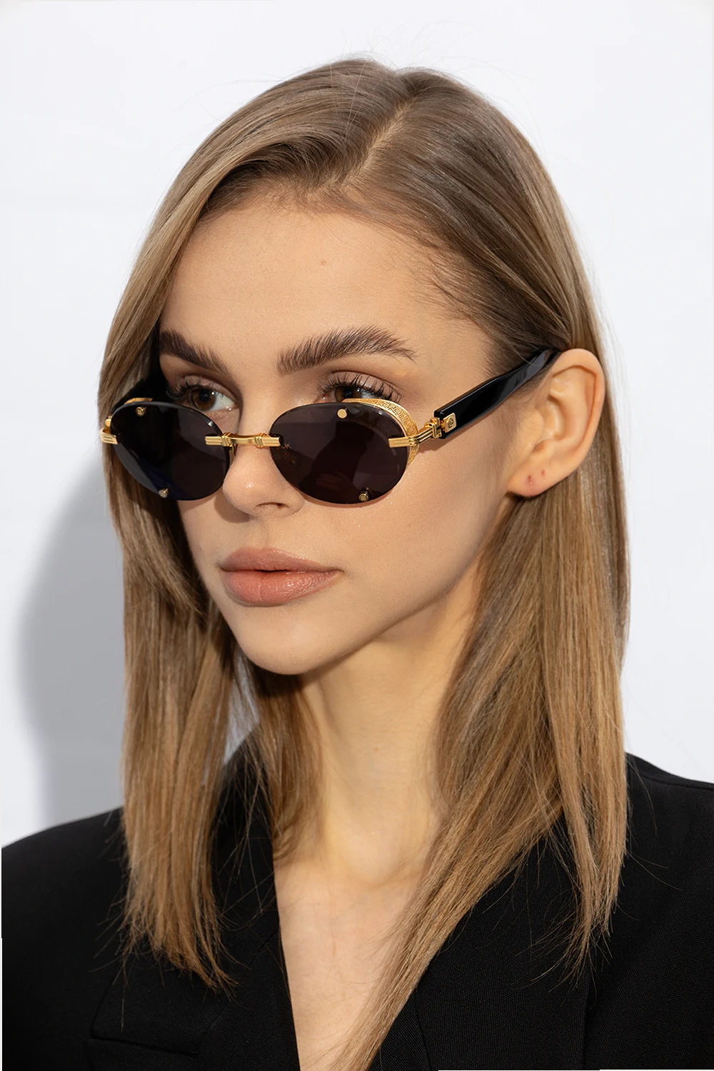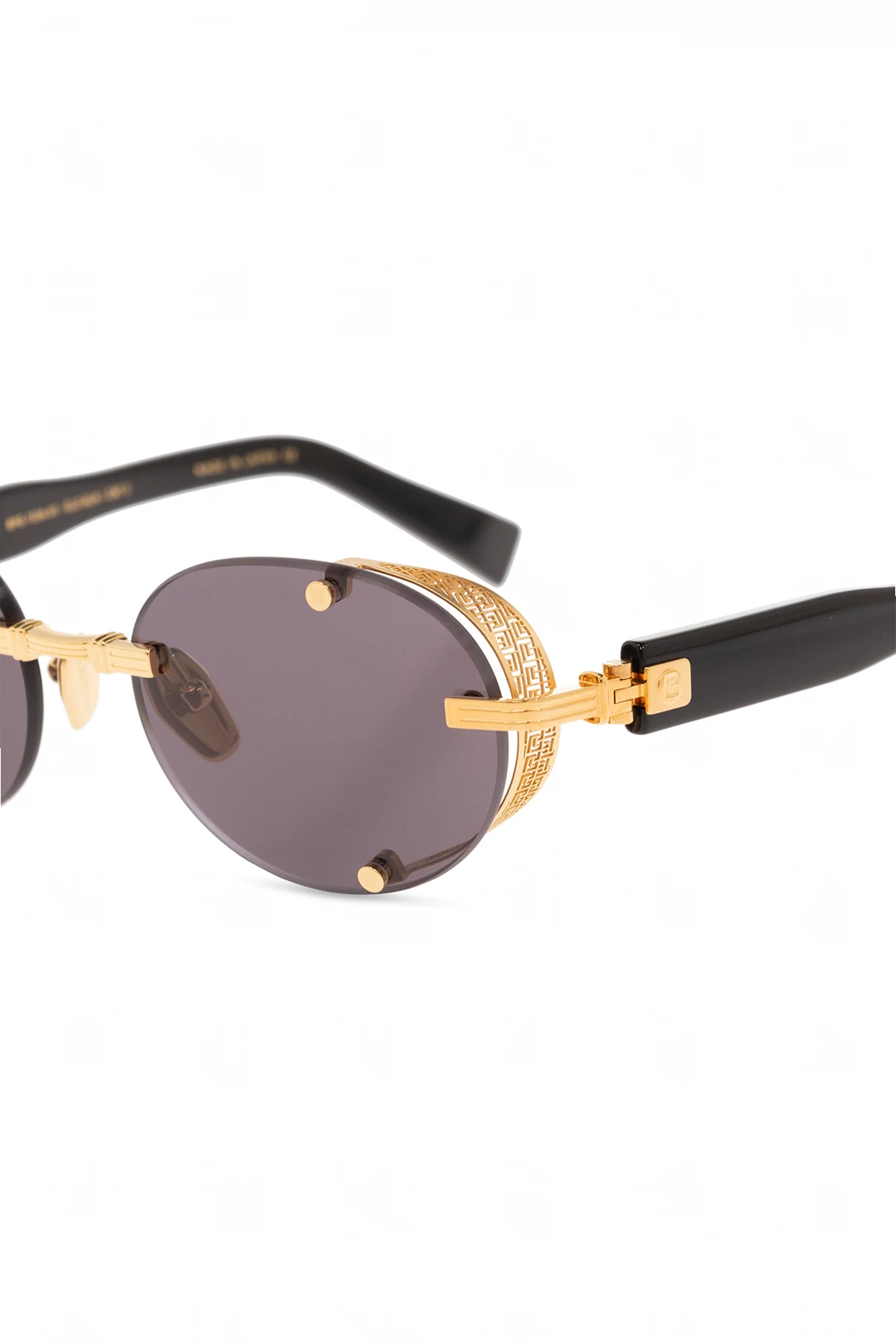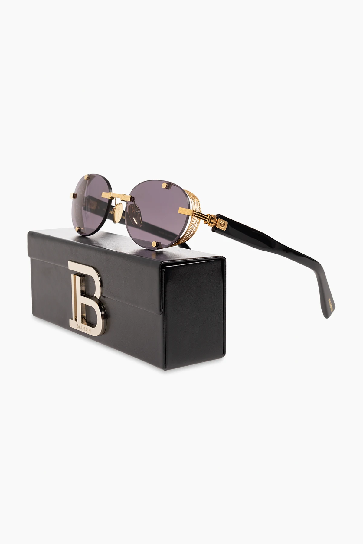 Black ‘Monsieur’ sunglasses from Balmain. This model features gold-tone titanium elements, logo detailing, an openwork monogram and grey oval lenses with UV protection (cat.3). Case included.