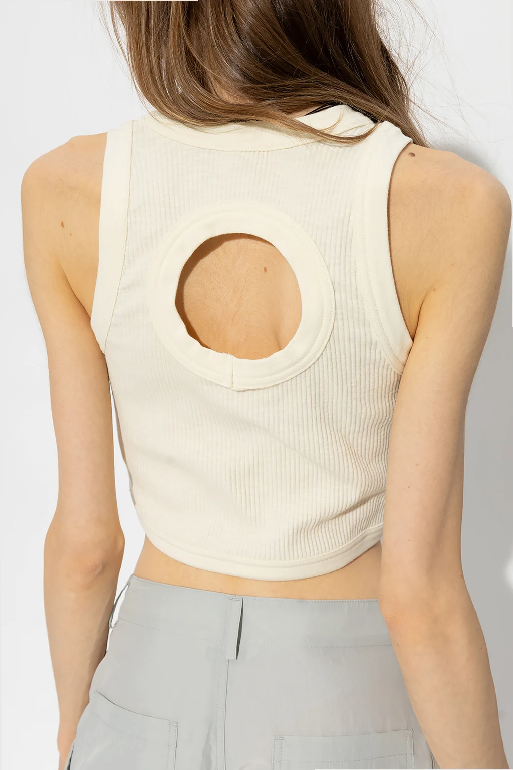 Yellow 'Cumo' sleeveless top from Holzweiler. Crafted from ribbed organic cotton, this style features round cutout detailing at the back and an elasticated round neck and hem.