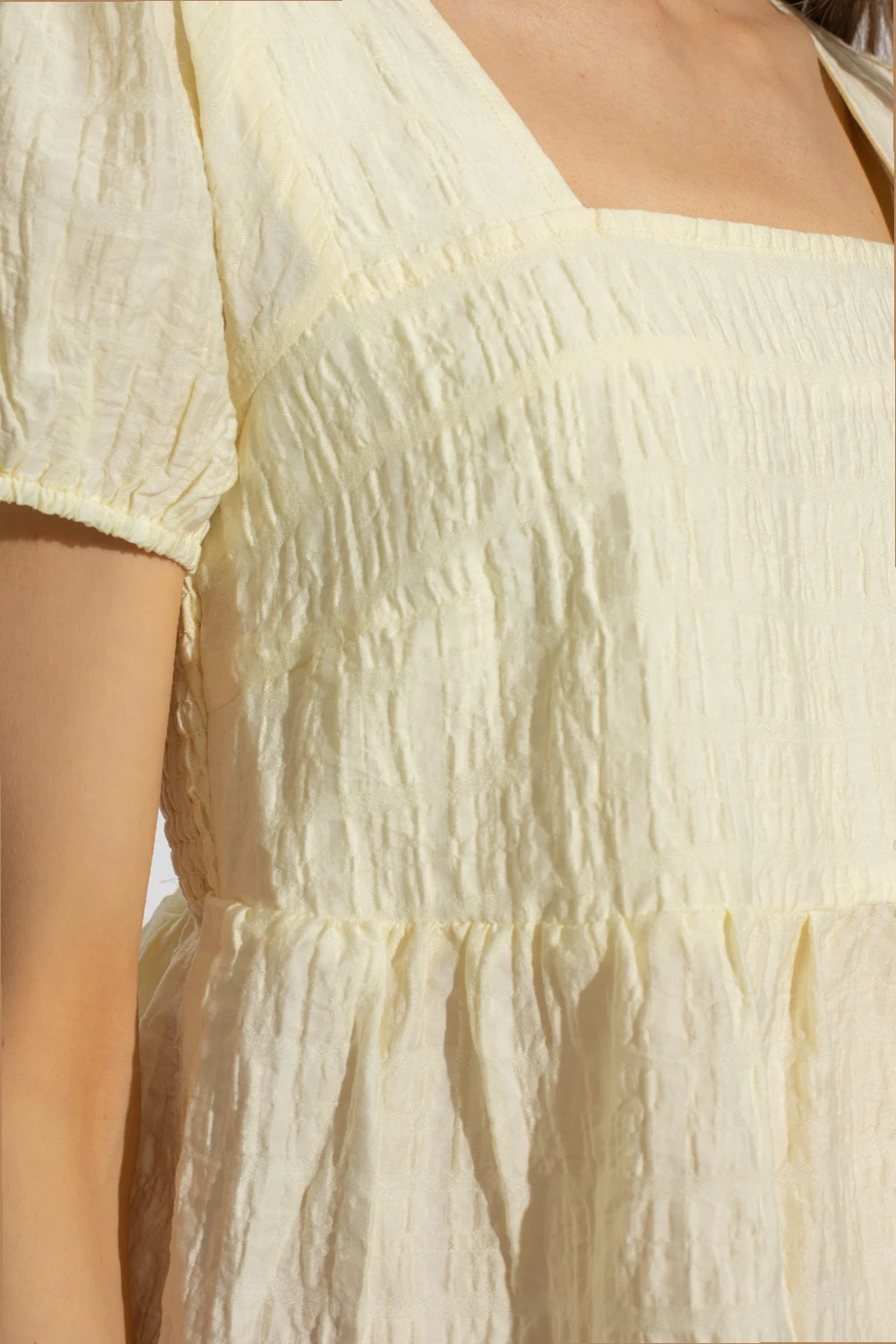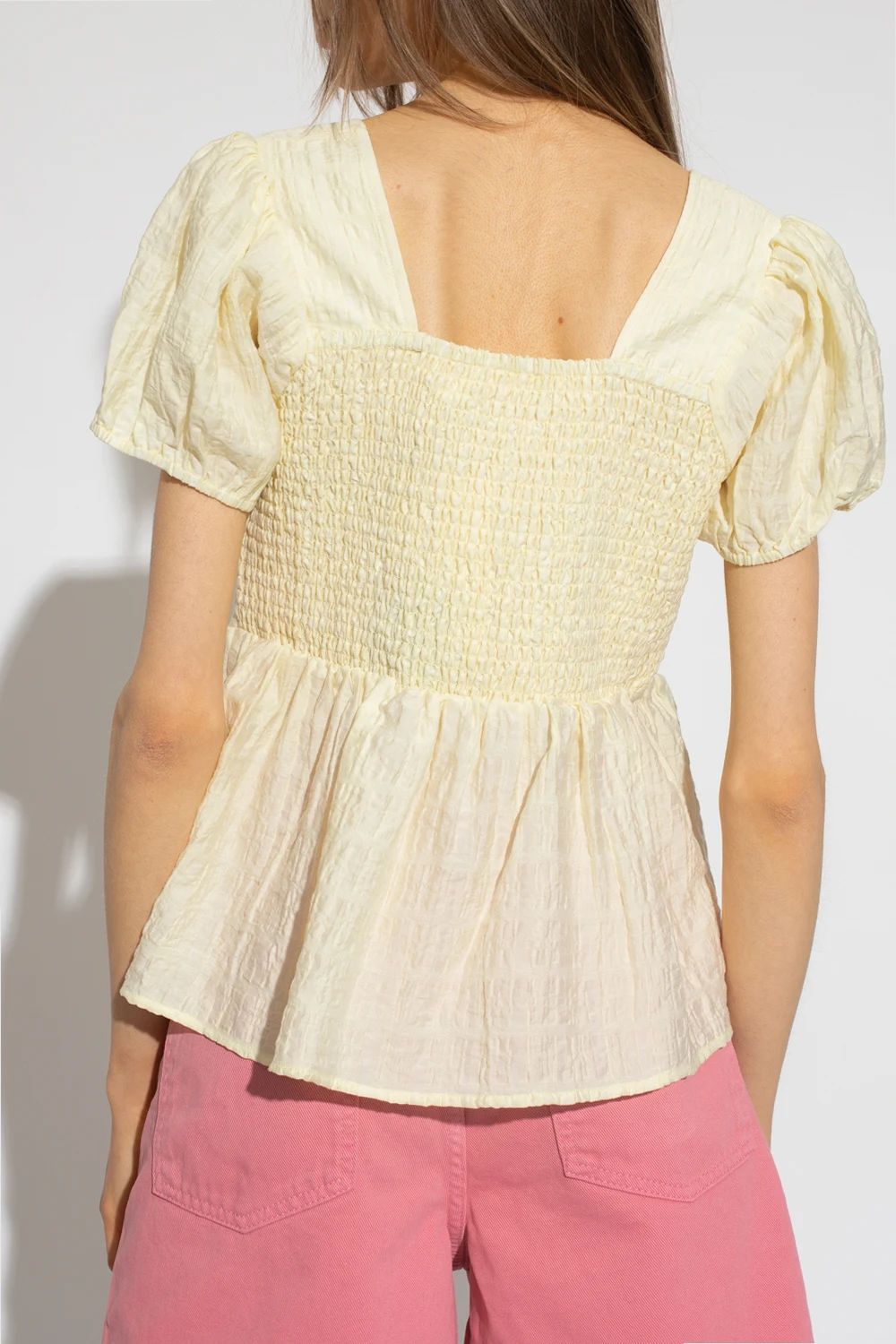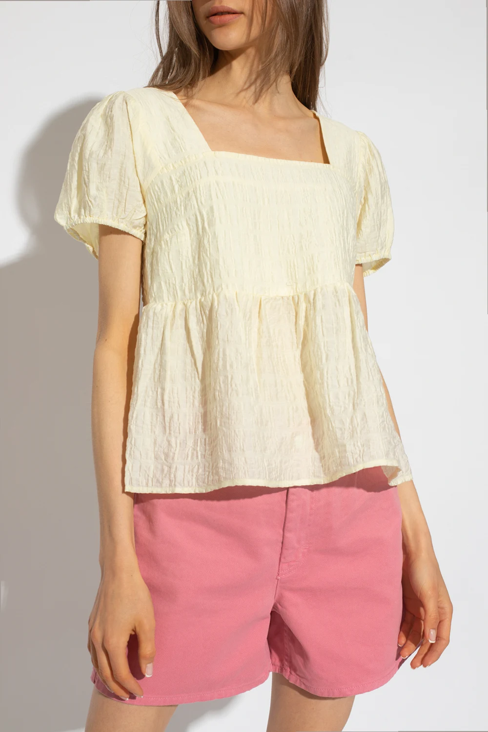 Light yellow ‘MargaretGZ’ top from Gestuz. Made of textured fabric, this flared, loose-fitting silhouette is complete with a square neck and short, puff sleeves.