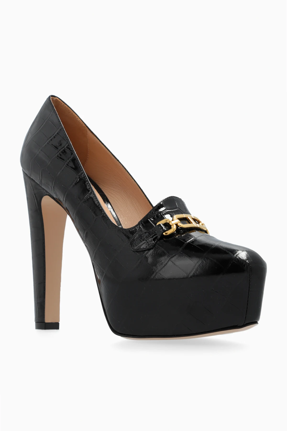 Die Schuhe zeichnen sich durch ein klassisches Design mit abgerundeter Spitze und einem massiven Plateaublockabsatz aus, der Stabilität und Tragekomfort gewährleistet. Die Oberfläche der Schuhe ist mit einer Prägung versehen, die Krokodilleder imitiert und ihnen ein einzigartiges, luxuriöses Aussehen verleiht.