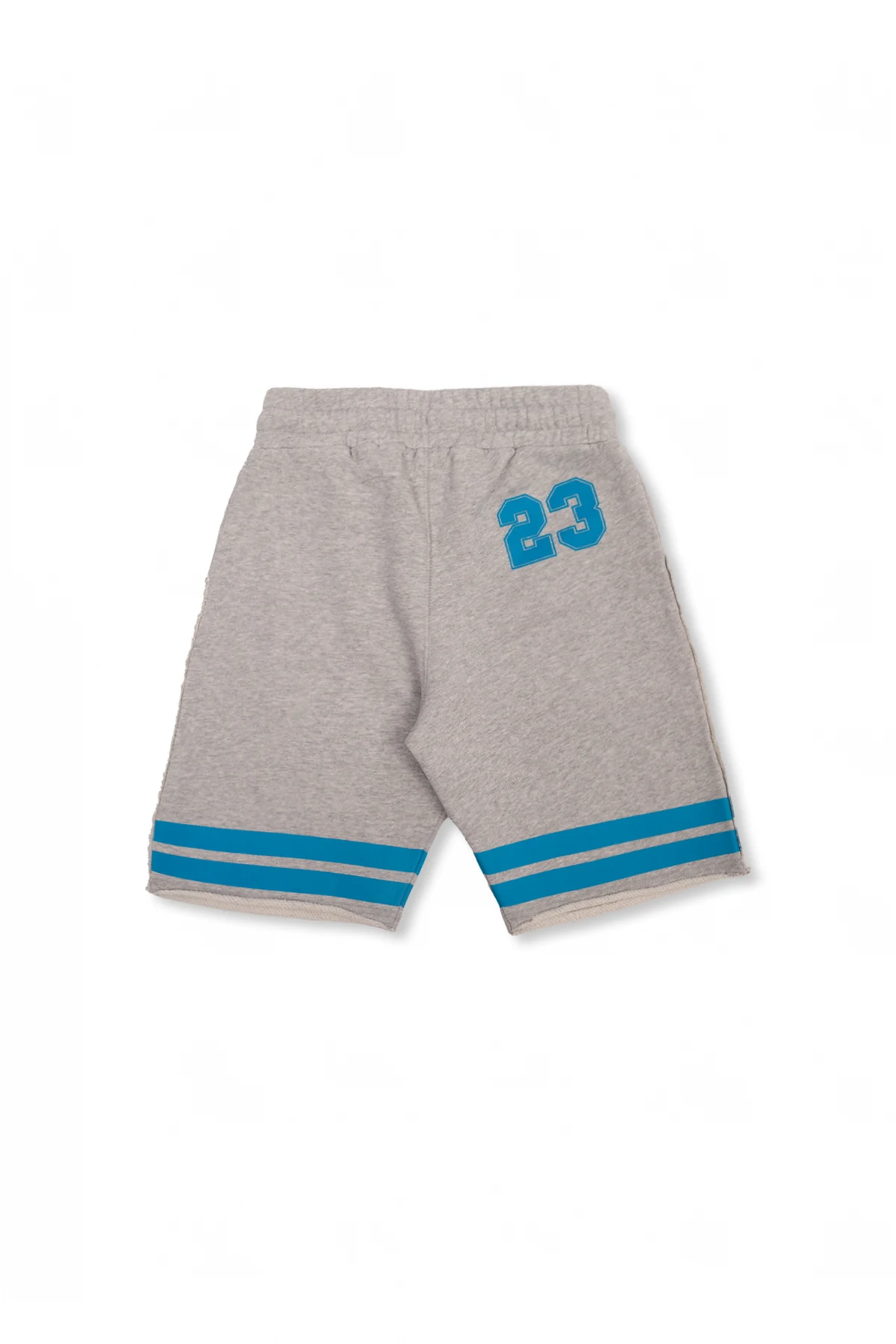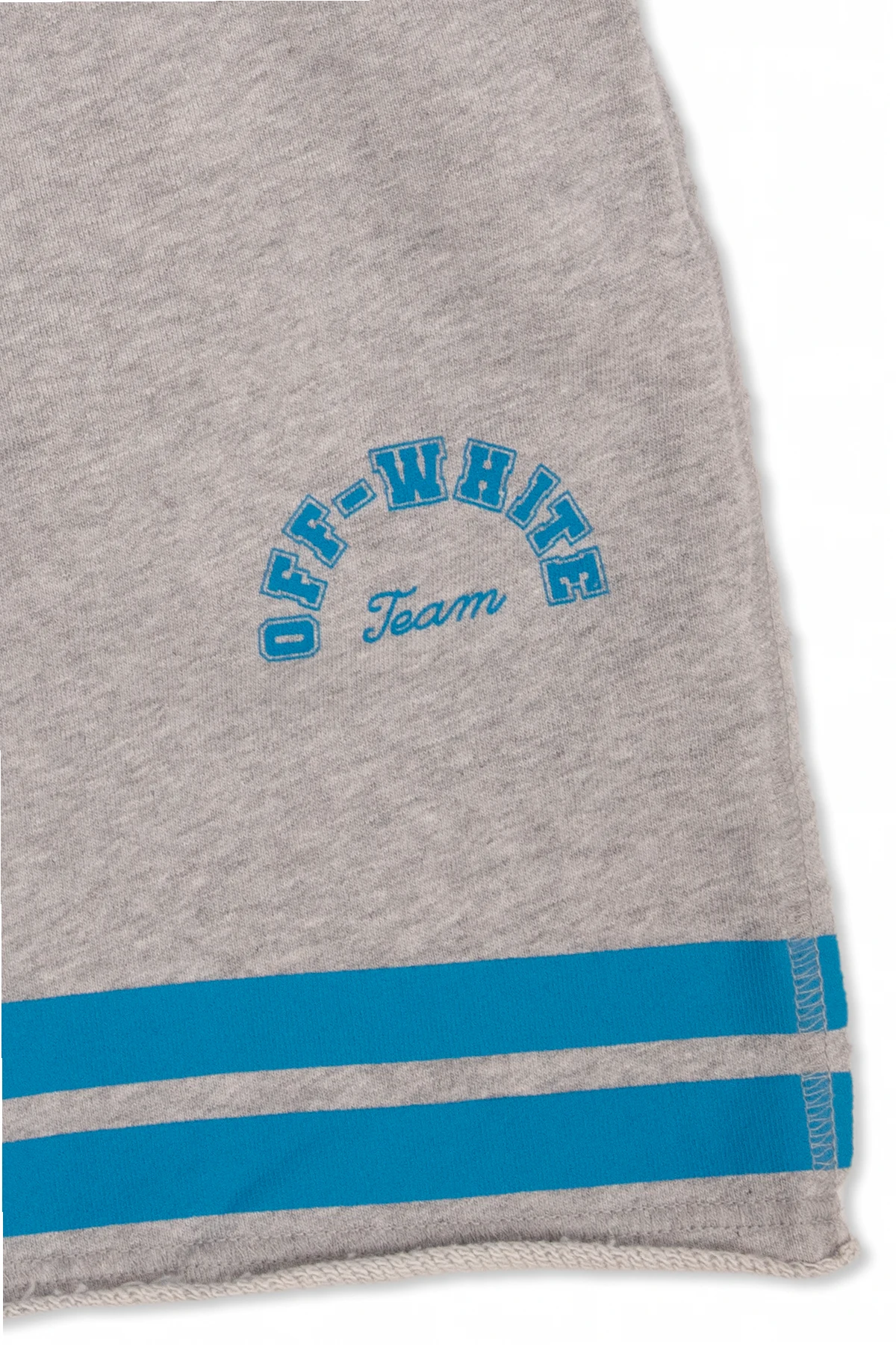 Grey shorts from Off-White Kids. Made of cotton, this pair features a drawstring waist, blue print, two front pockets and raw trims.