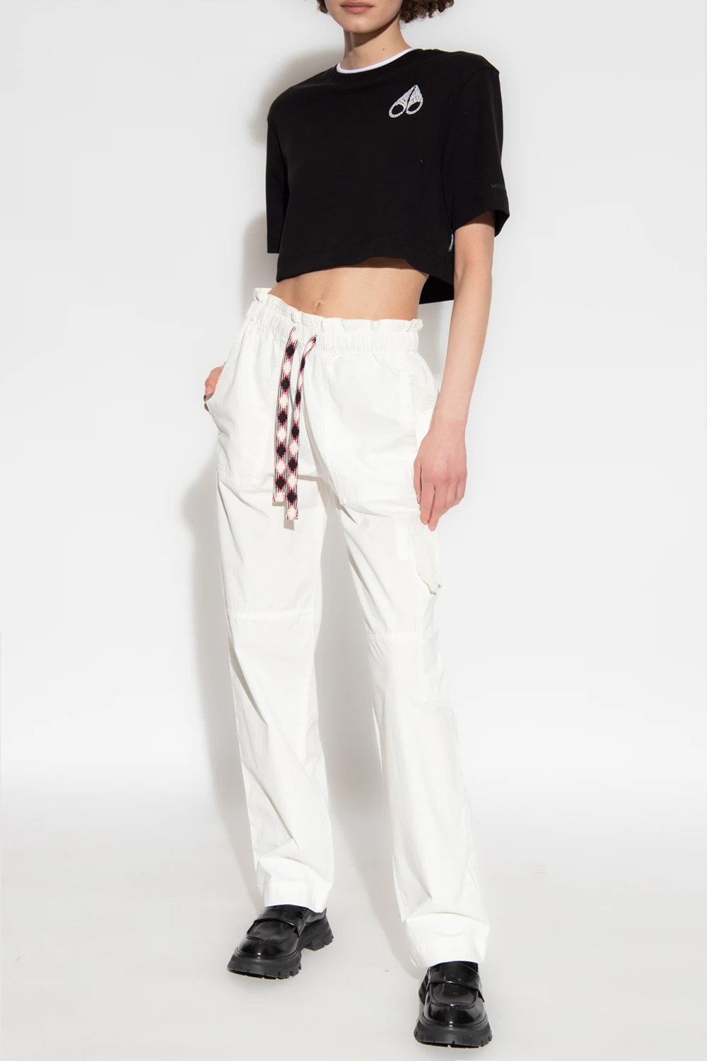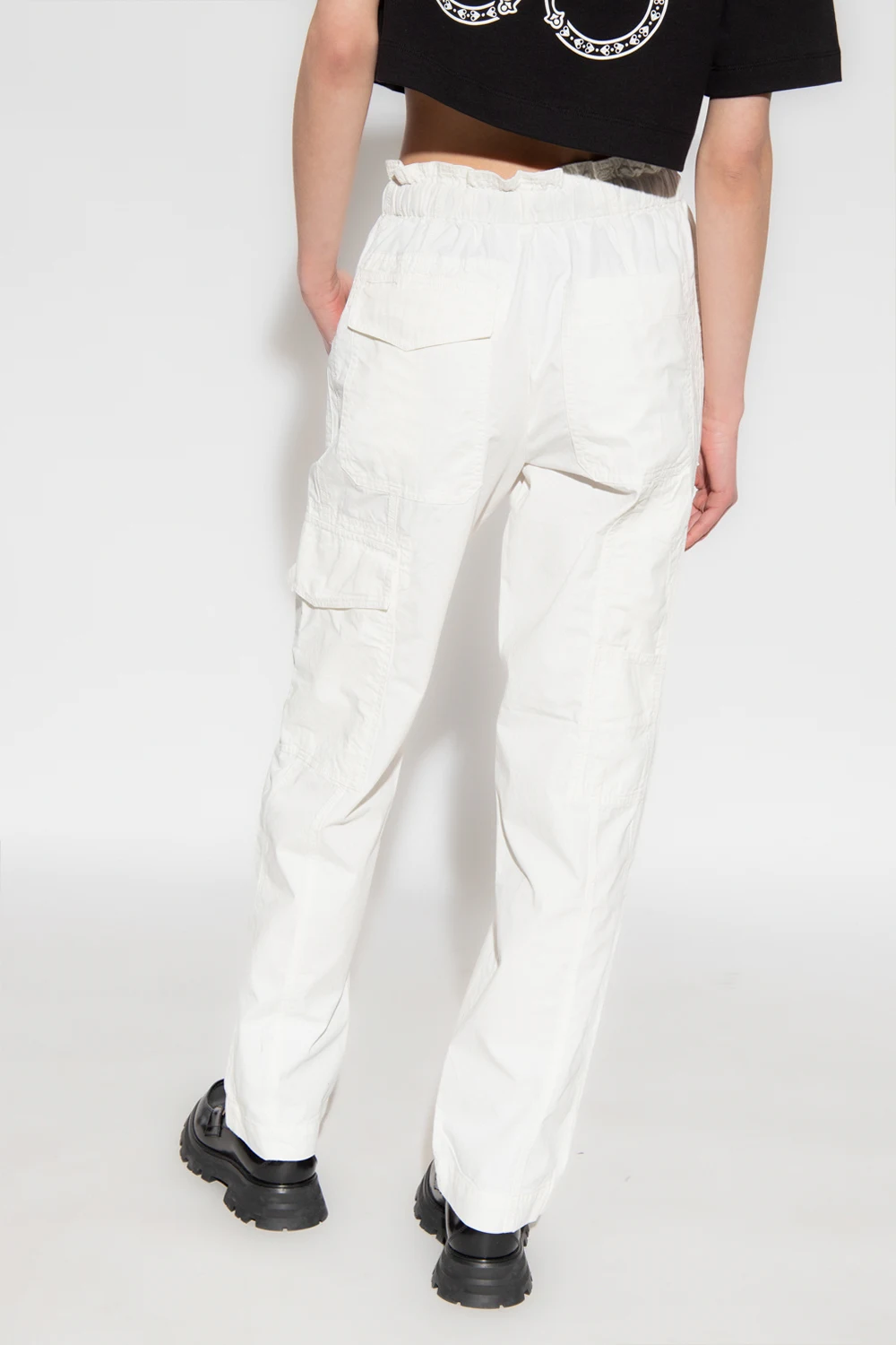 White trousers from Zadig & Voltaire X Defile. Made of cotton with a relaxed fit, this pair is cinched with colourful drawcords and features a high-rise waist and multiple pockets for added utility.