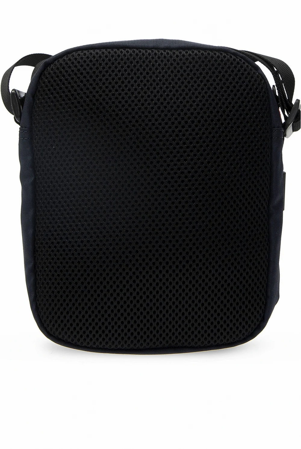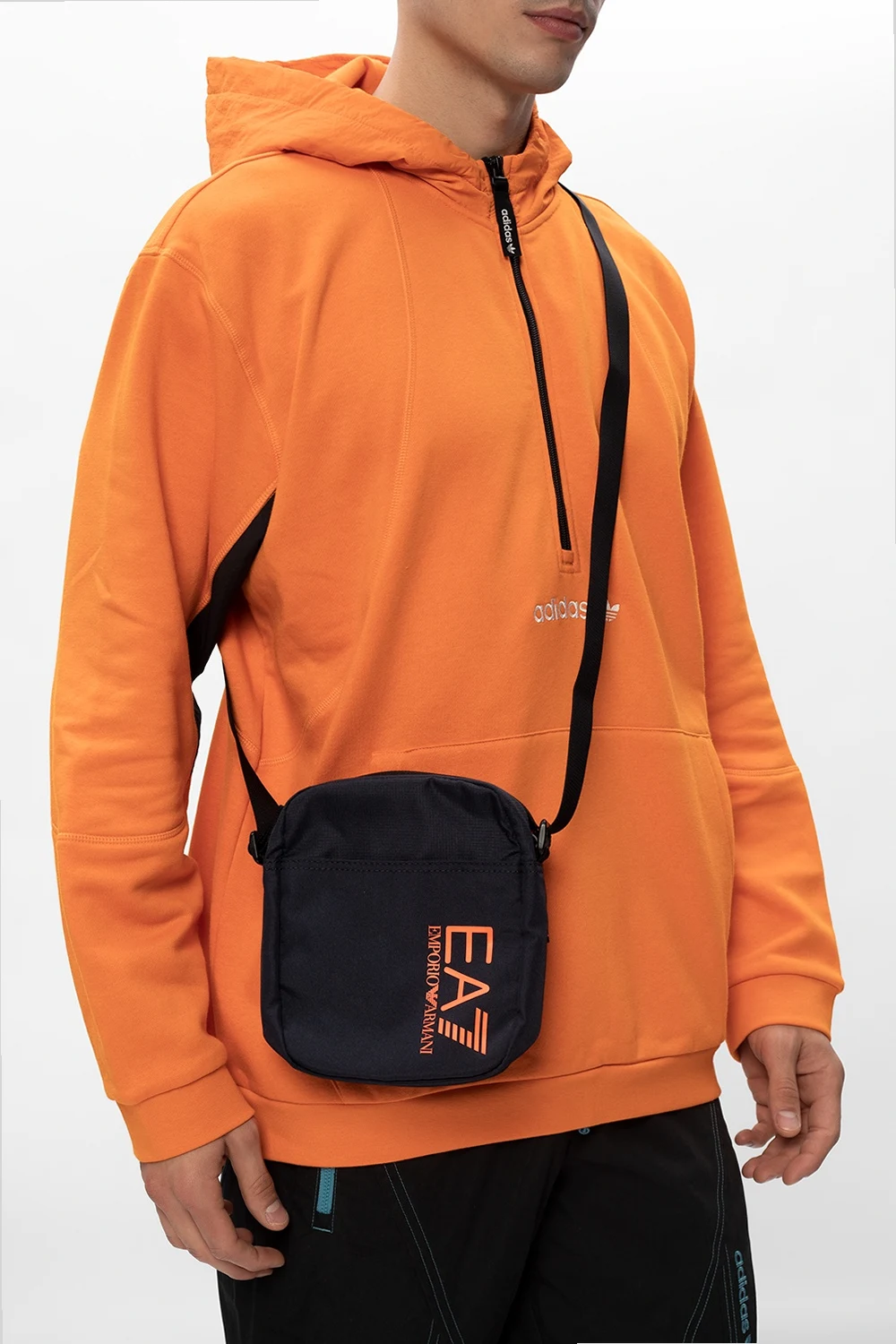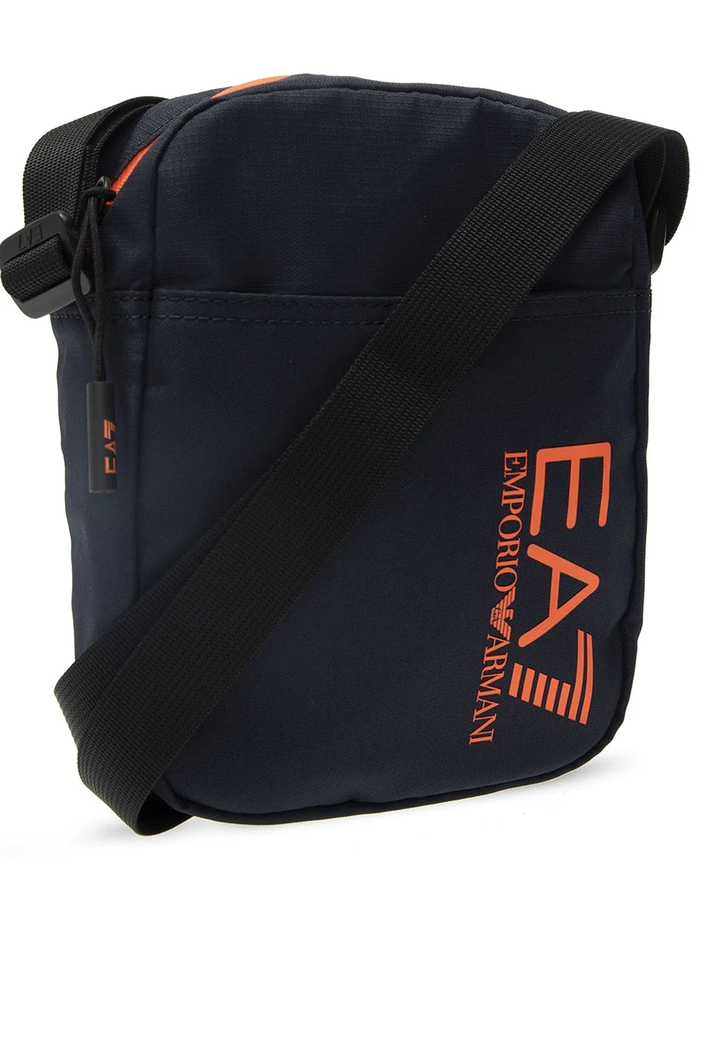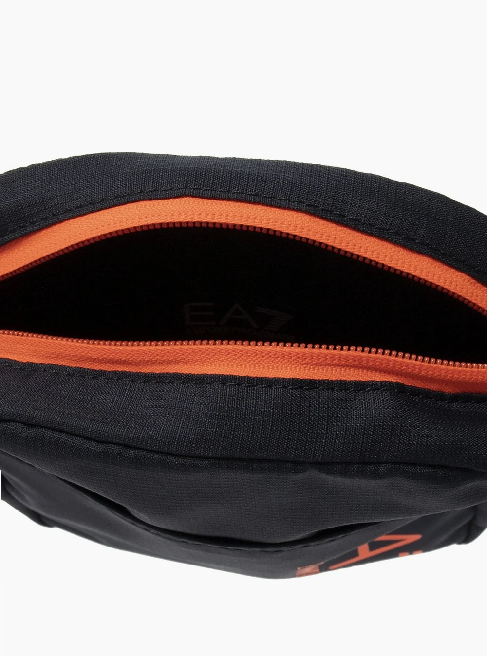 Navy blue and orange shoulder bag from EA7 Emporio Armani. Printed with the label's logo, this design features zip fastening, an external velcro-fastened pocket on the front, black mesh detail on the back, an adjustable shoulder strap and black clad interior with one compartment, one velcro-fastened pocket and one zipped pocket.