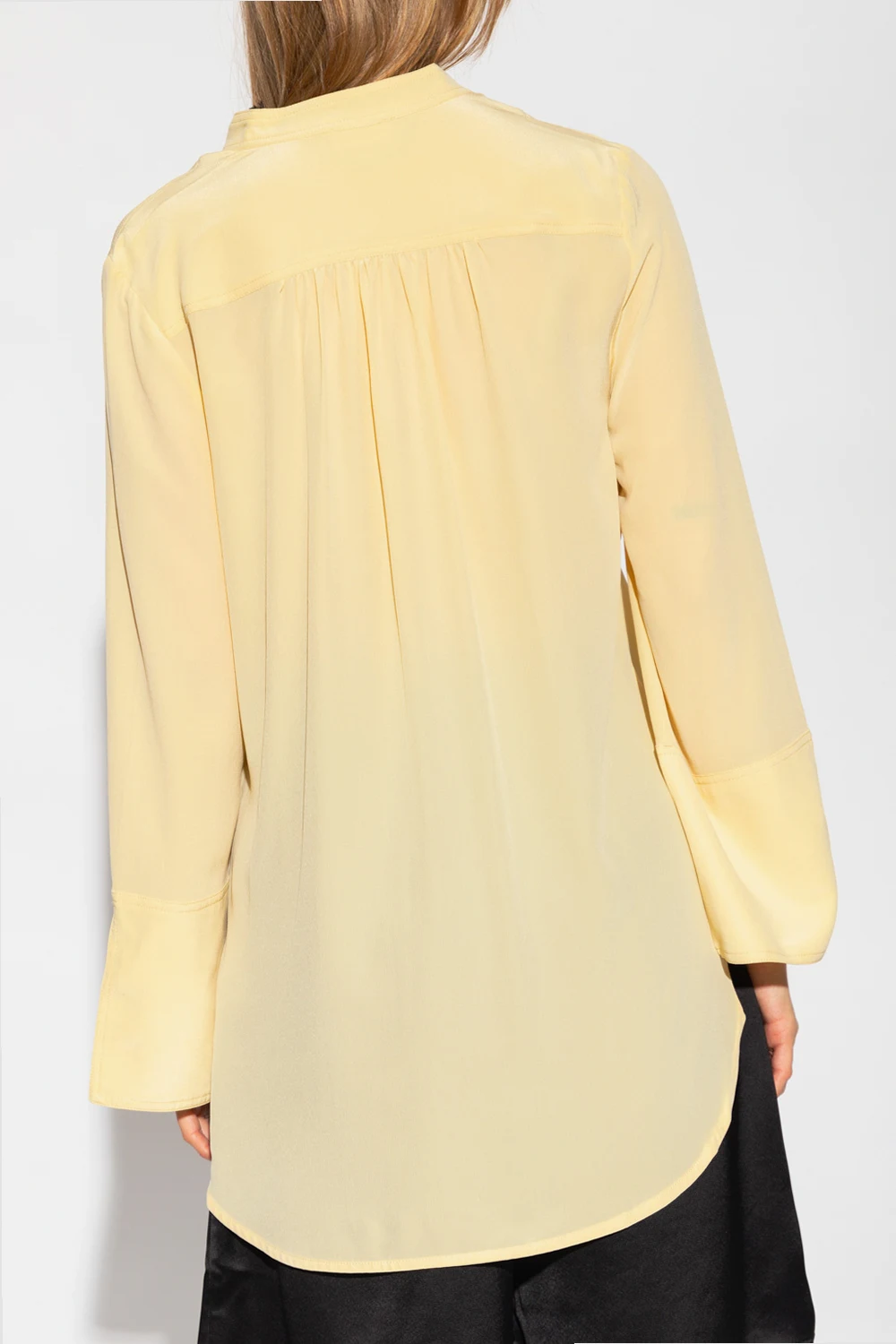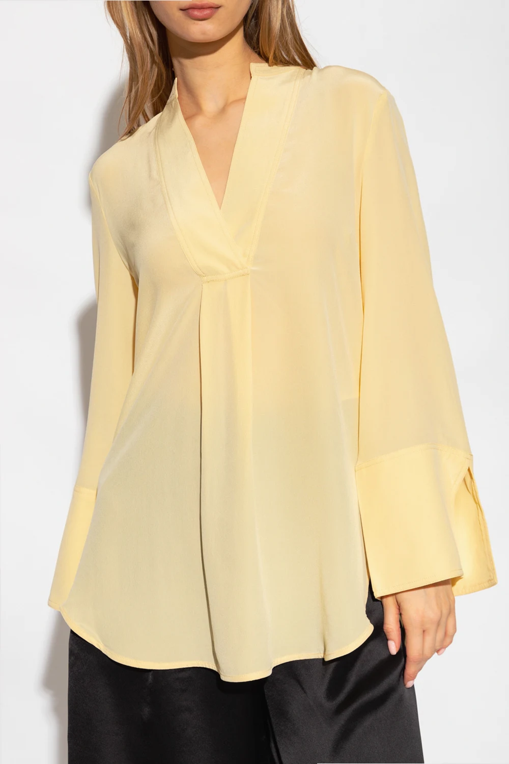Light yellow ‘Flaiy’ top from By Malene Birger. Made of organic silk, this design features wide 3/4 length sleeves with slits.