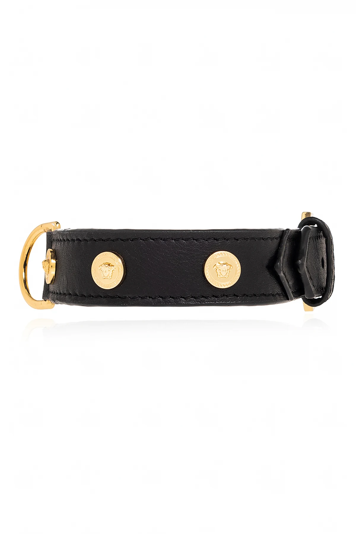 Black pet collar from Versace Home. Crafted from calf leather, this item features an adjustable metal buckle and the iconic Medusa head applique in gold-tone metal.