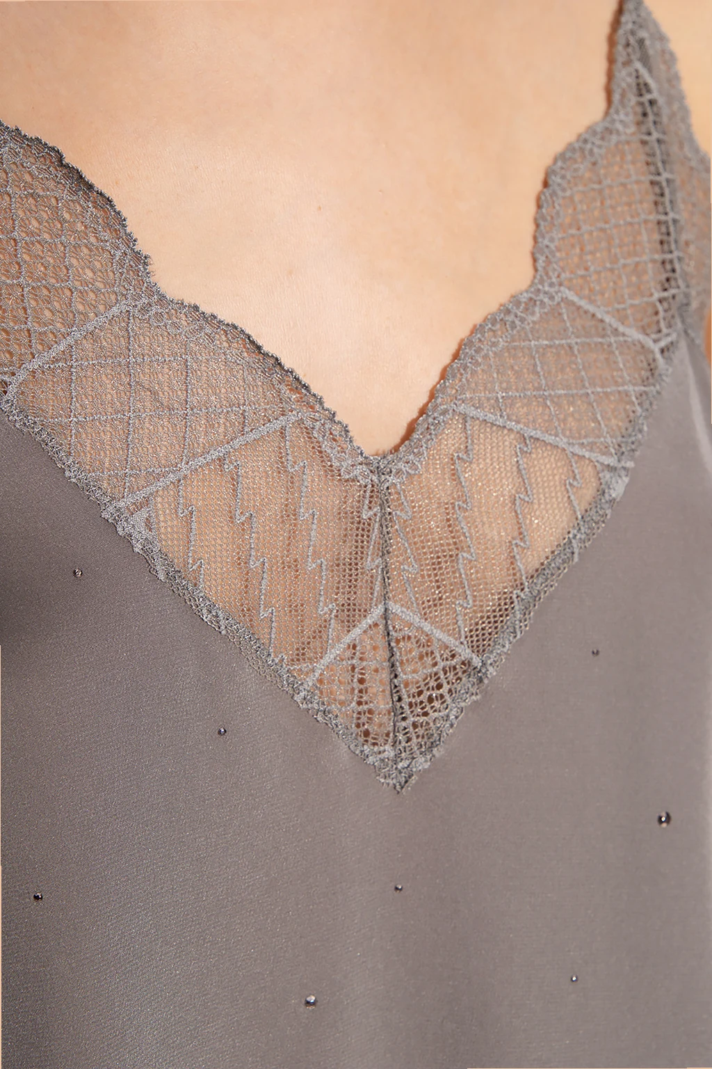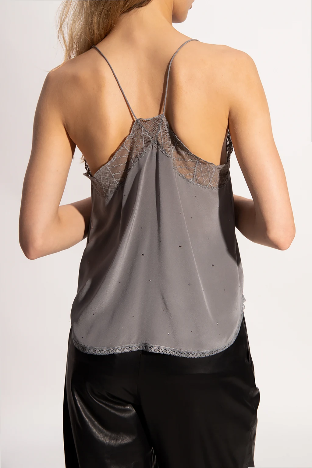 Grey sleeveless top from Zadig & Voltaire. Made of silk, this design features rhinestones and lace trims.