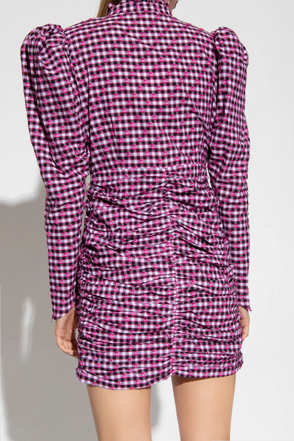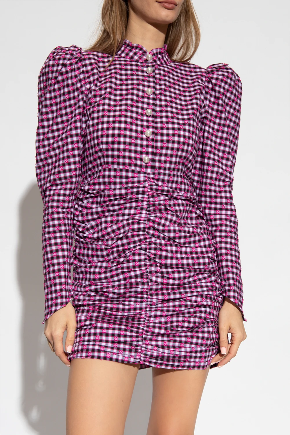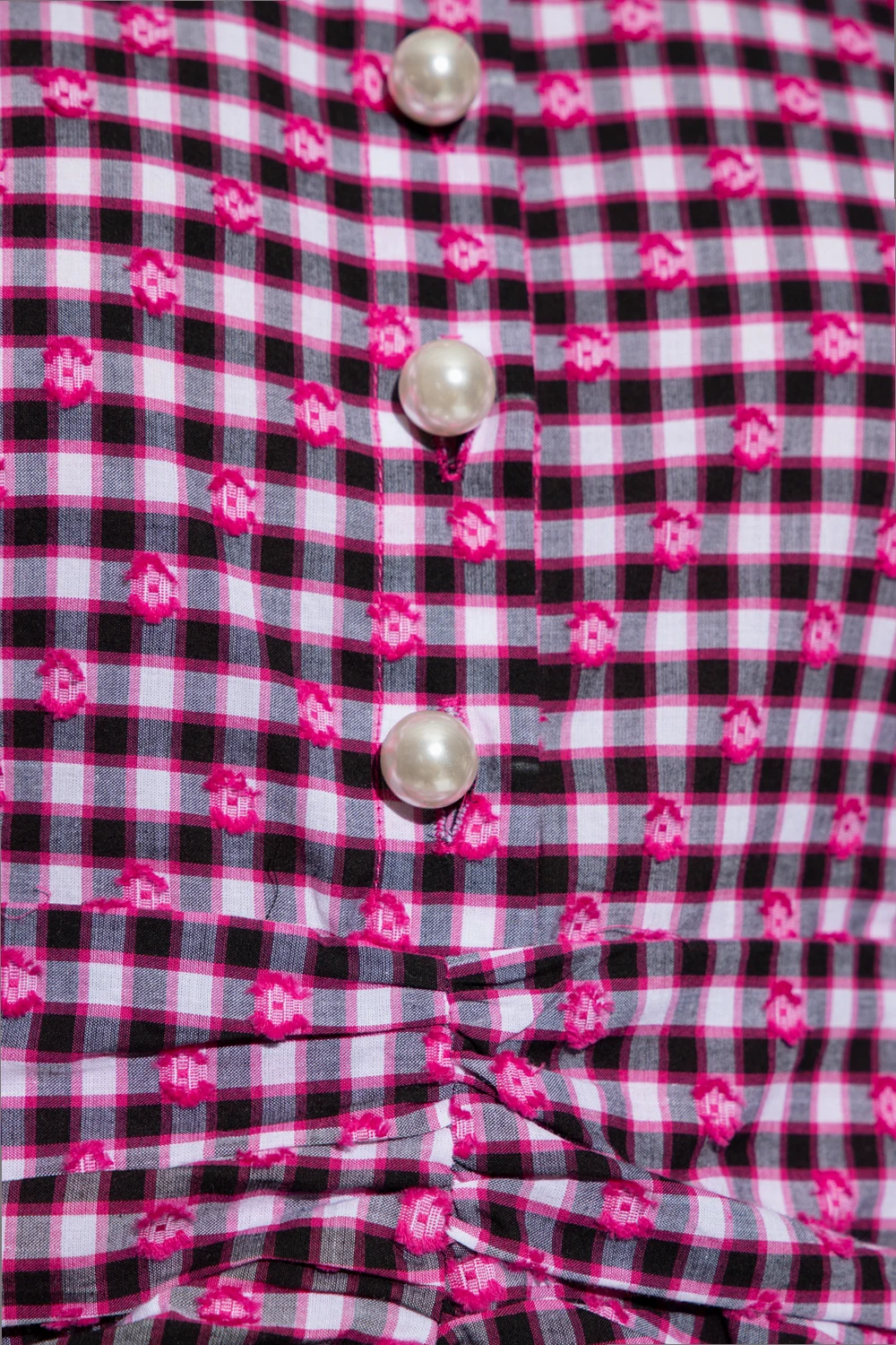 Black, white and pink ‘Karia’ dress with a standing collar from Custommade. Crafted from cotton, this style features a check pattern, pearl buttons, padded shoulders, decorative ruching and long sleeves.