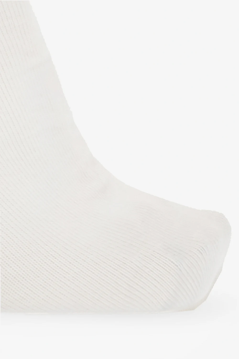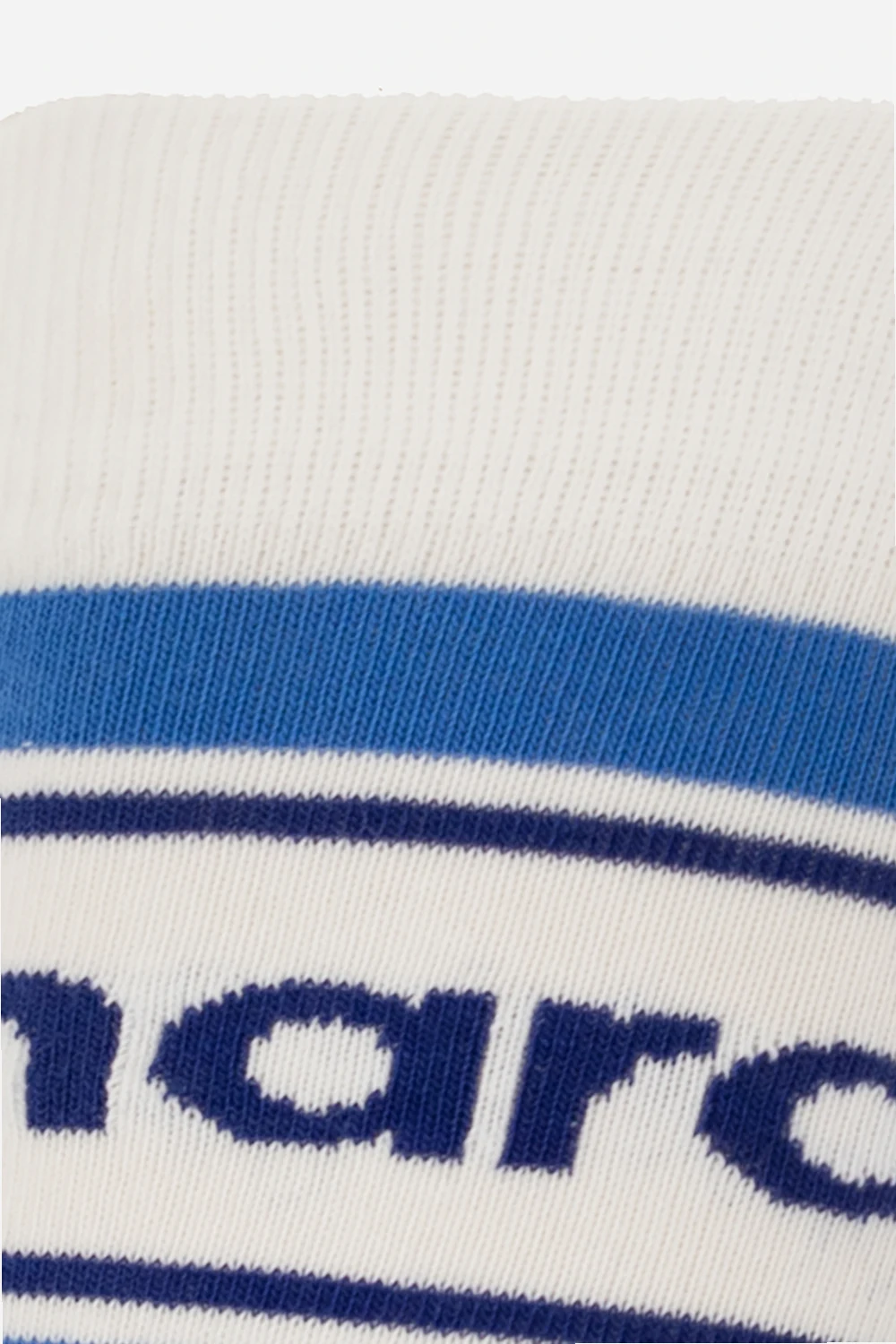 White ‘Dona’ socks from MARANT. Made of cotton, this pair features a blue logo pattern and ribbed cuffs.