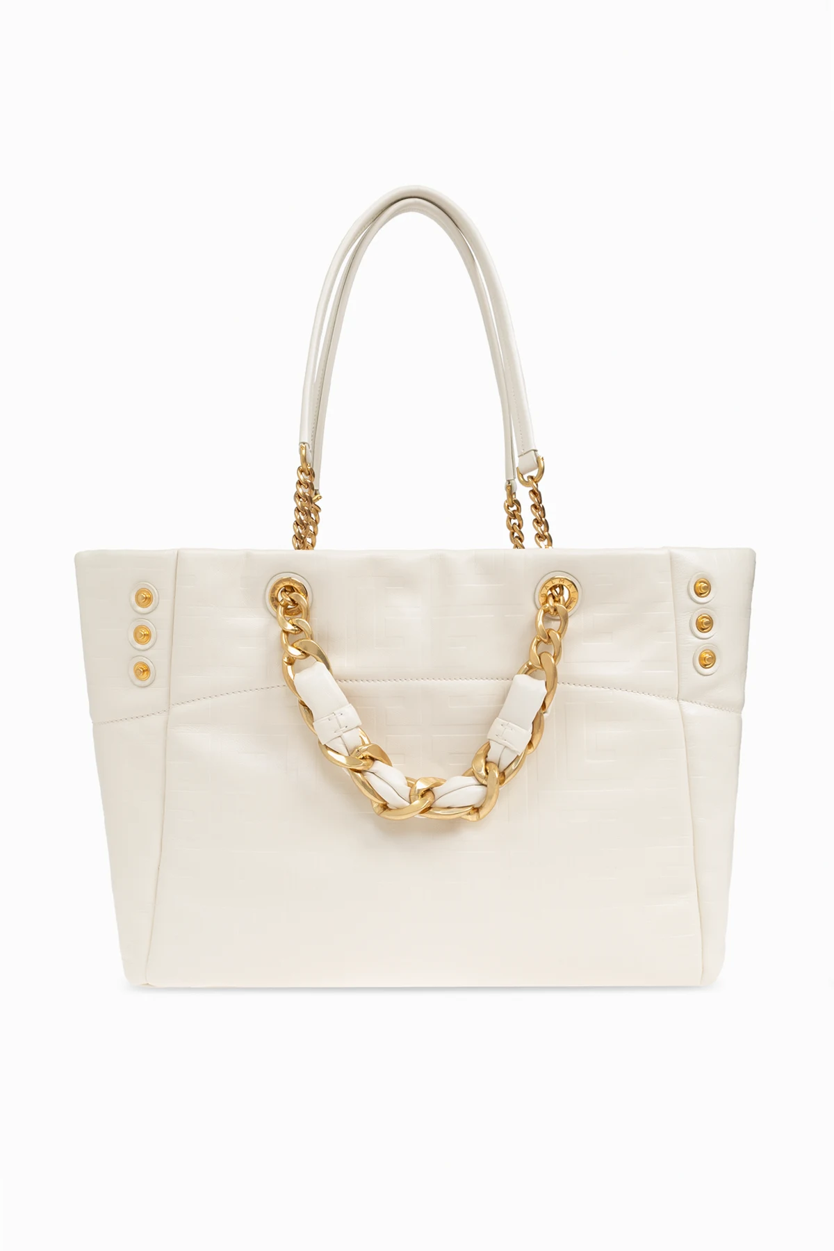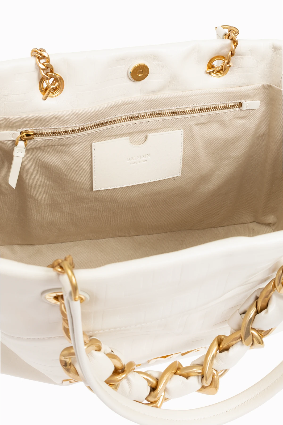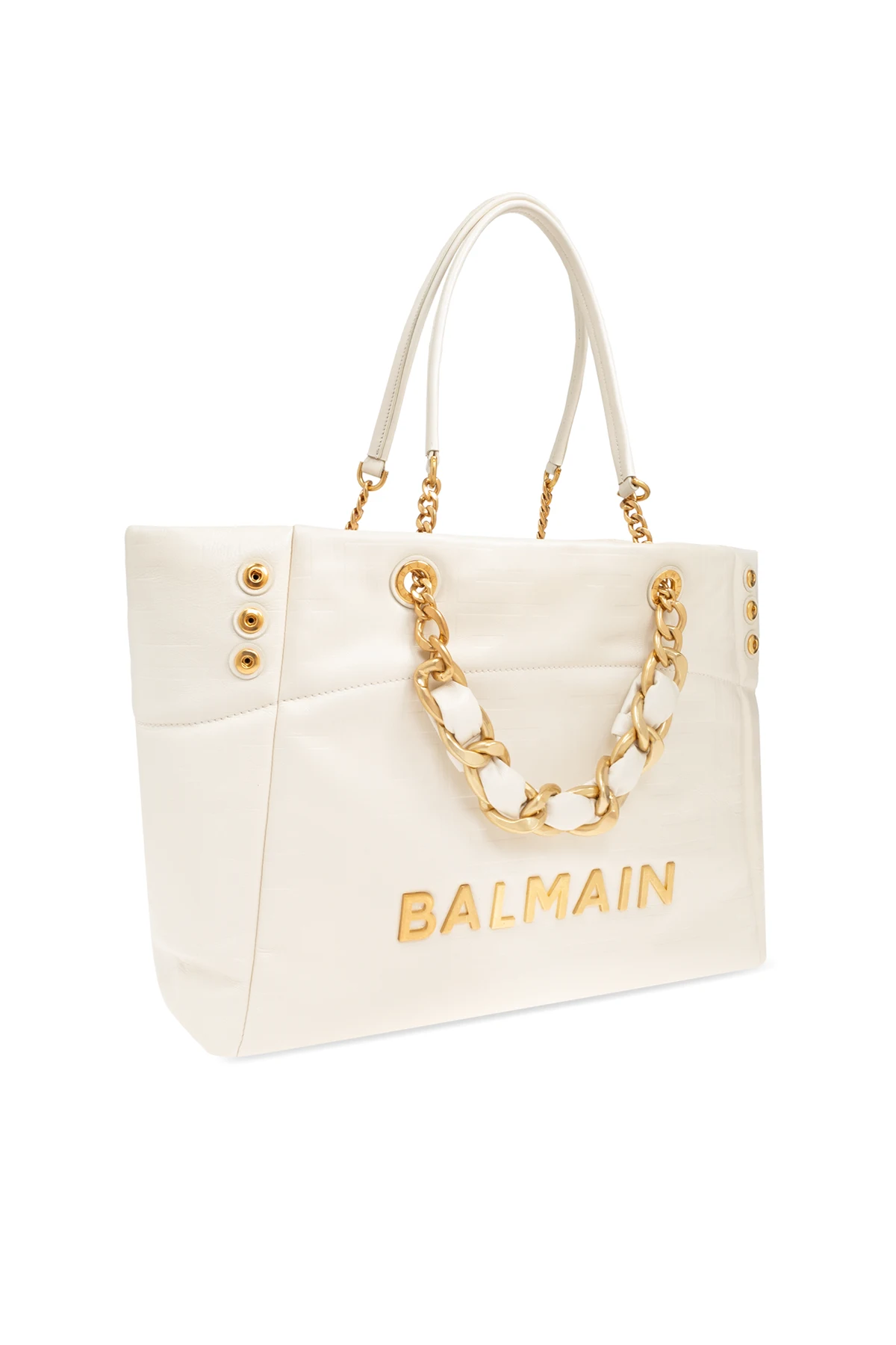 Die exklusive Shopper Bag „1945“ der Marke Balmain ist der Inbegriff von Luxus und Funktionalität. Hergestellt aus hochwertigstem Lammleder, präsentiert sie einen dezenten Cremefarbton, der perfekt mit den reichen, goldenen Details harmoniert. Die charakteristischen goldenen Kettenhenkel und das „BALMAIN“-Logo verleihen der Tasche einen unverwechselbaren Charme und Eleganz.