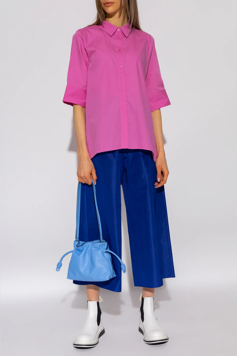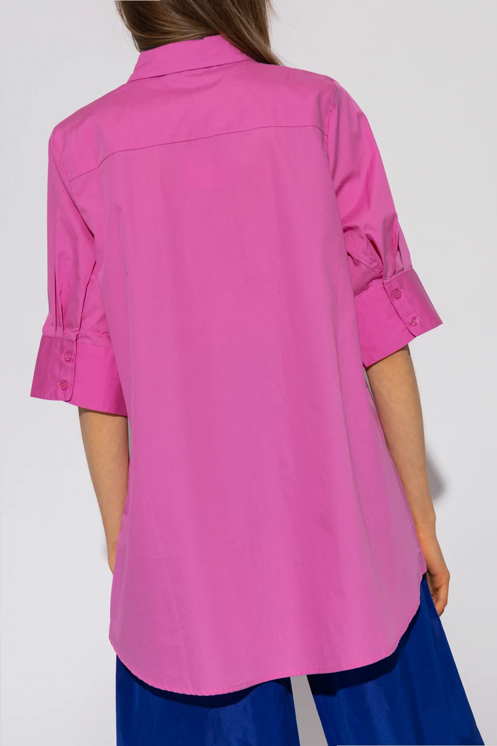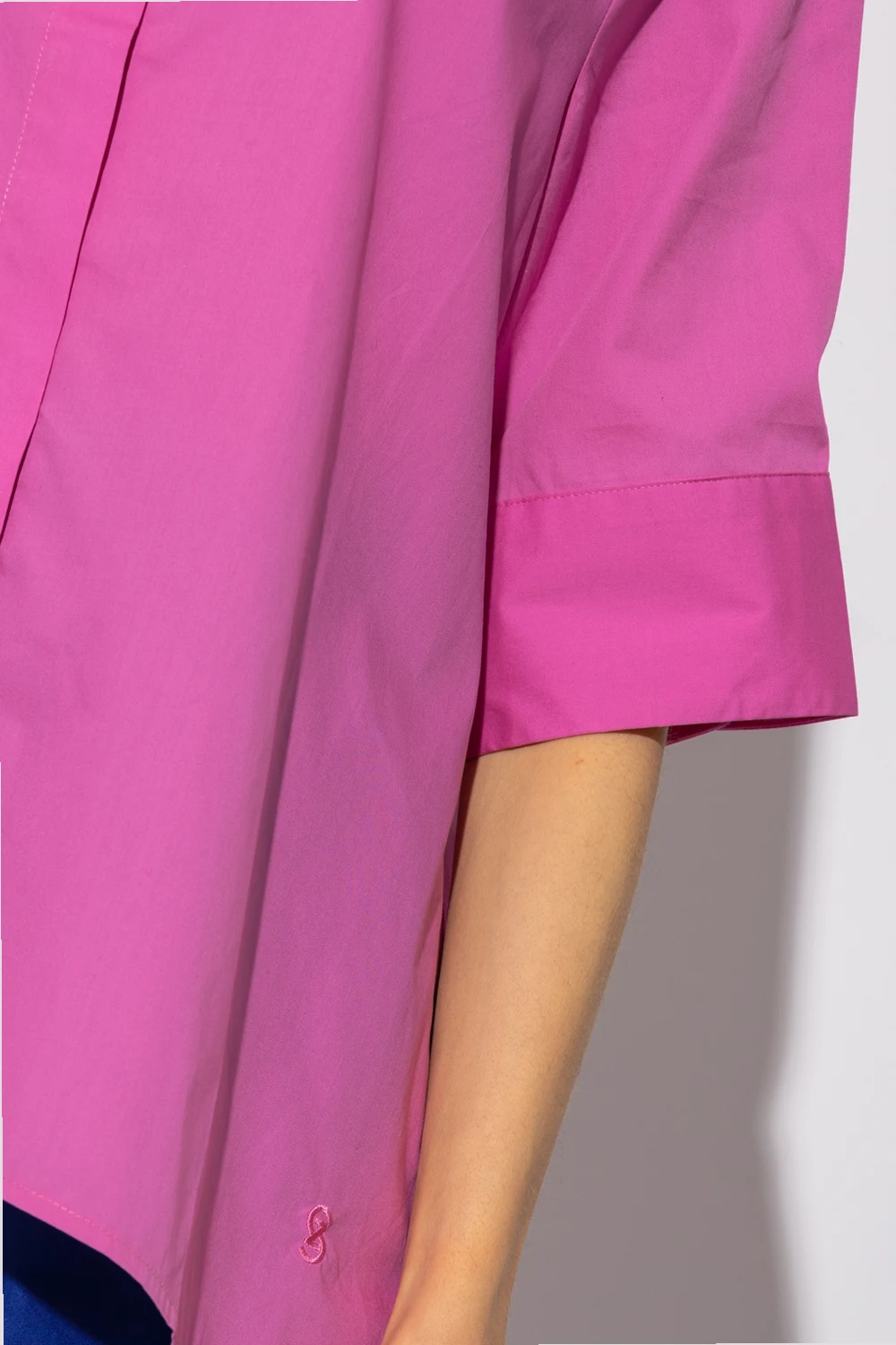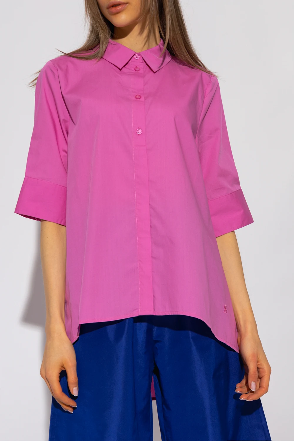 Pink ‘AvaliGZ’ shirt from Gestuz. Crafted from organic cotton, this style features button fastenings, logo embroidery on the bottom, an asymmetrical hem and short sleeves with button cuffs.