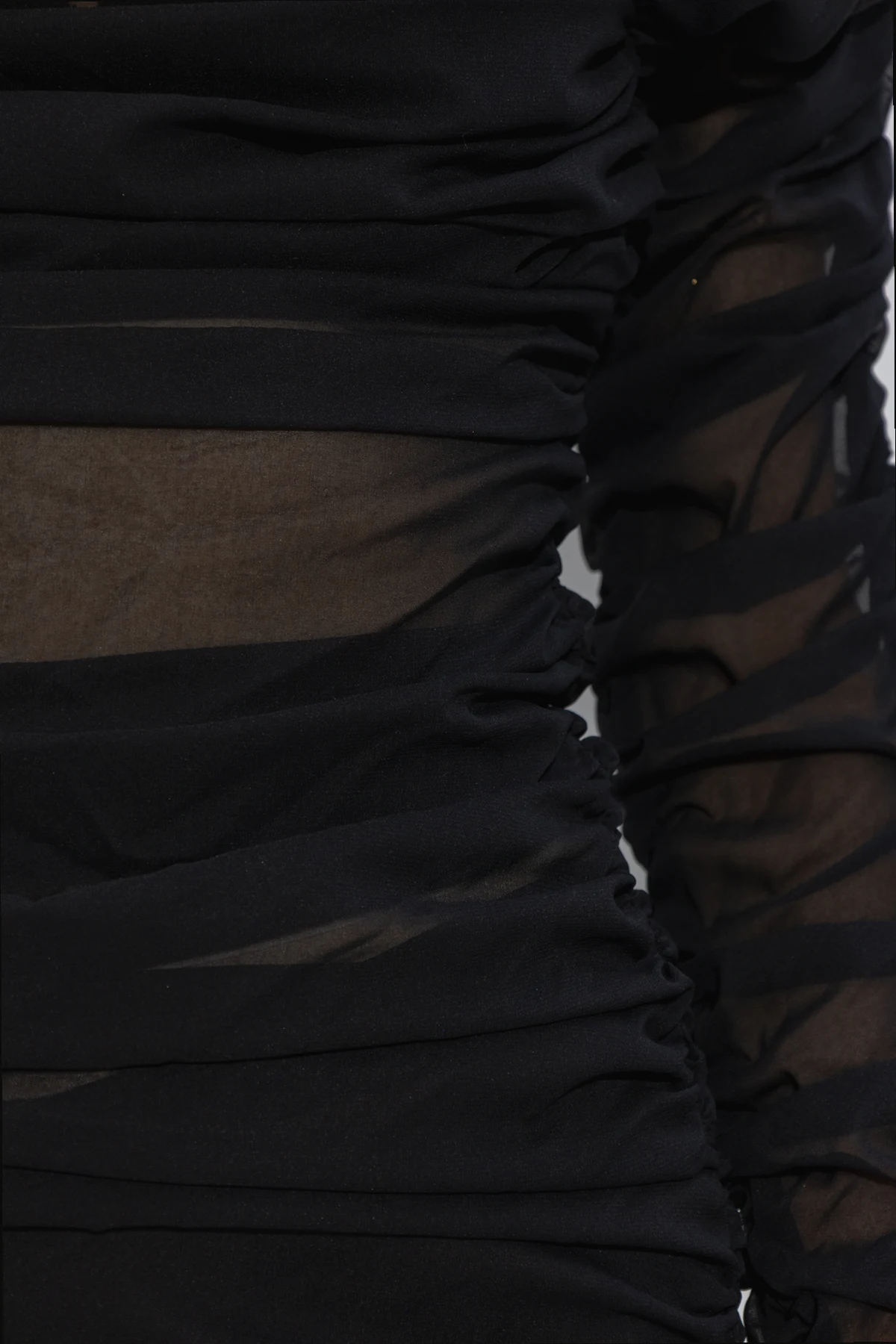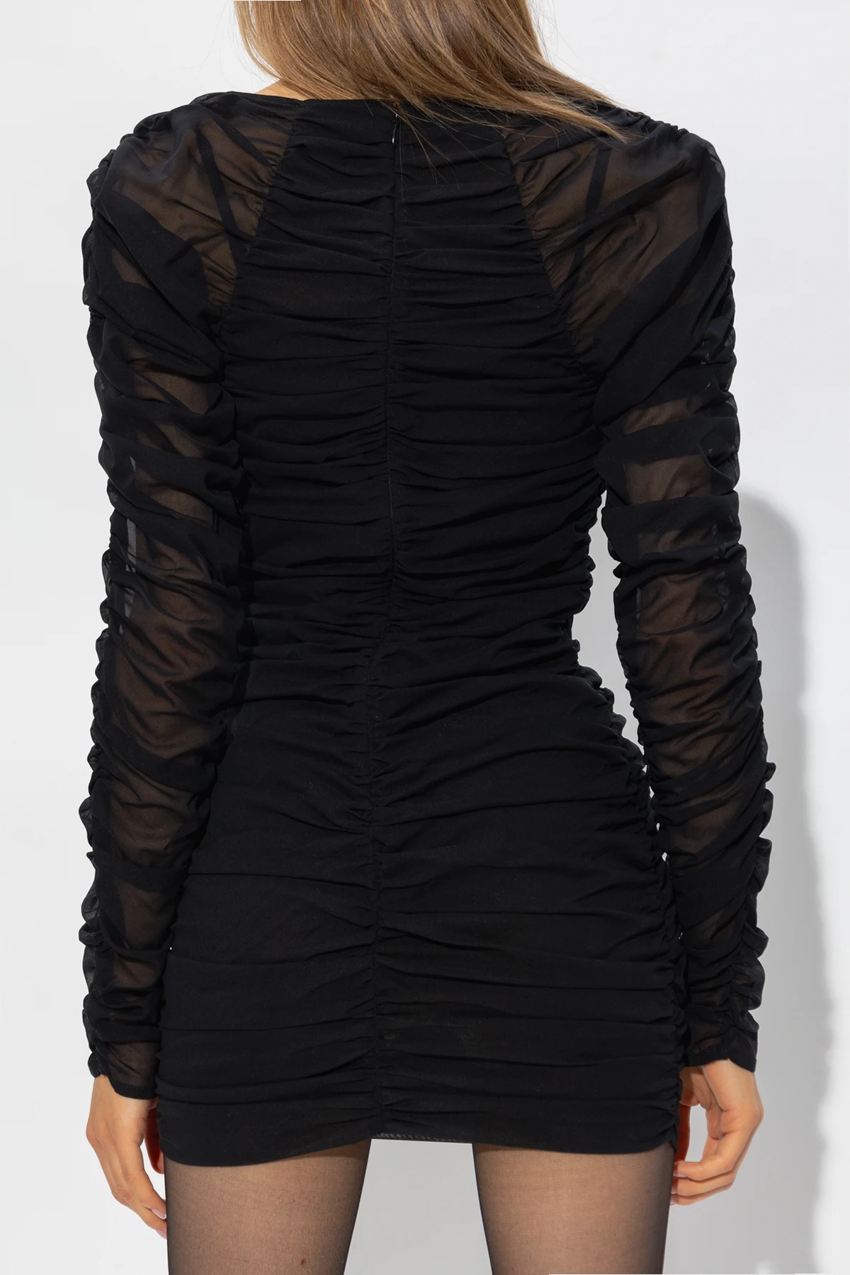 Black ‘Narikala’ dress from The Mannei. Crafted with a semi-sheer finish, this style fastens with a back zipper and showcases a round neck, long sleeves and all-over draping.