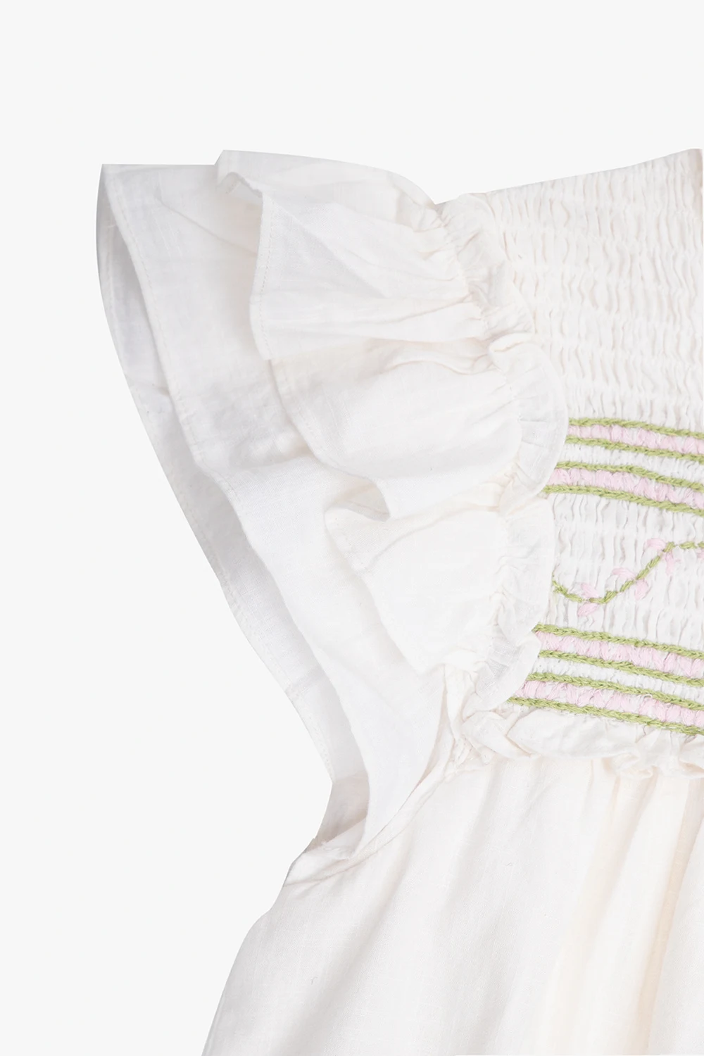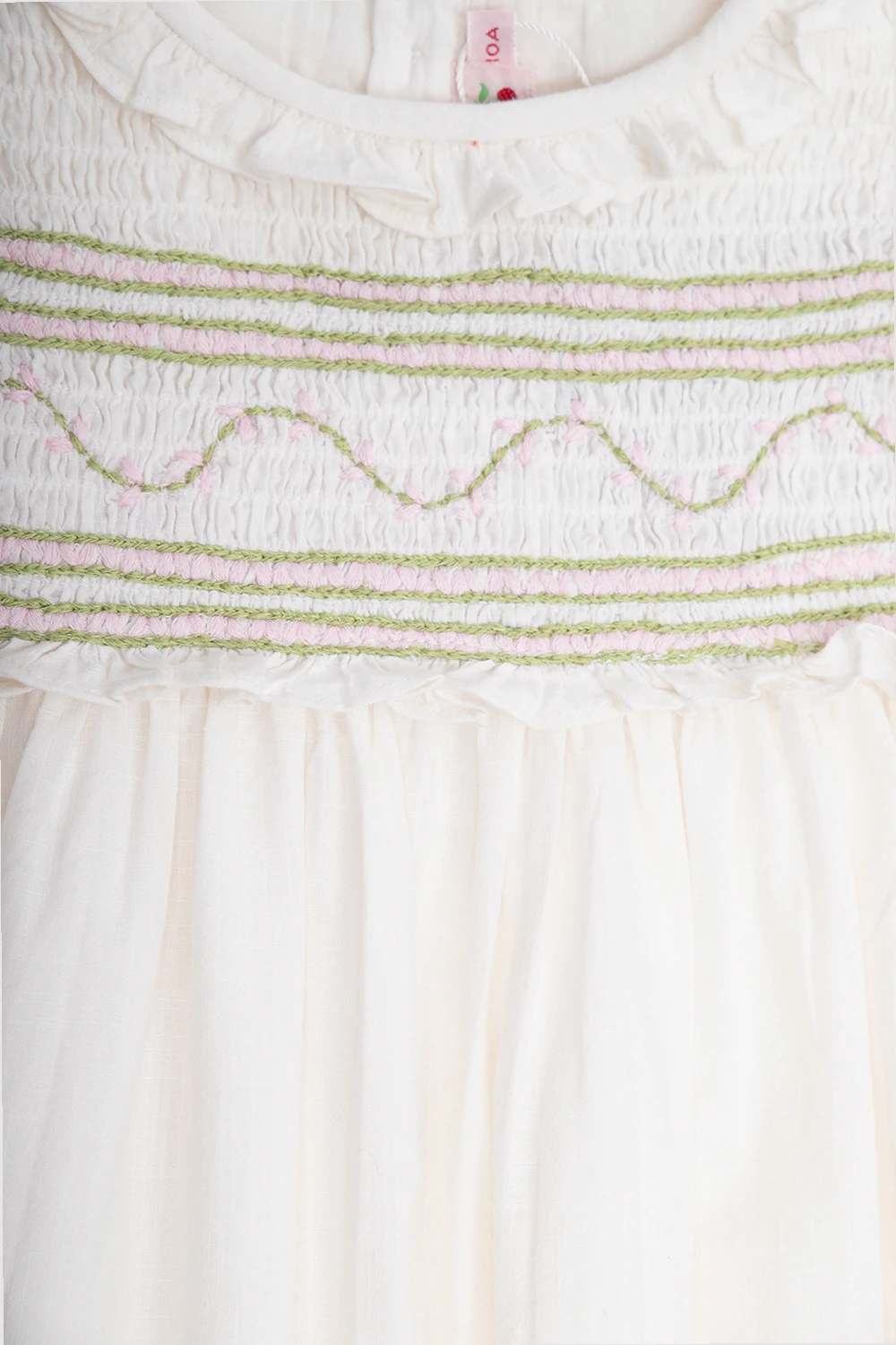 Cream ‘Bijou’ dress from Bonpoint. Made of cotton, this design features buttons at the back, gathers, embroidered pattern in green and pink, round neck, ruffle and flared skirt.